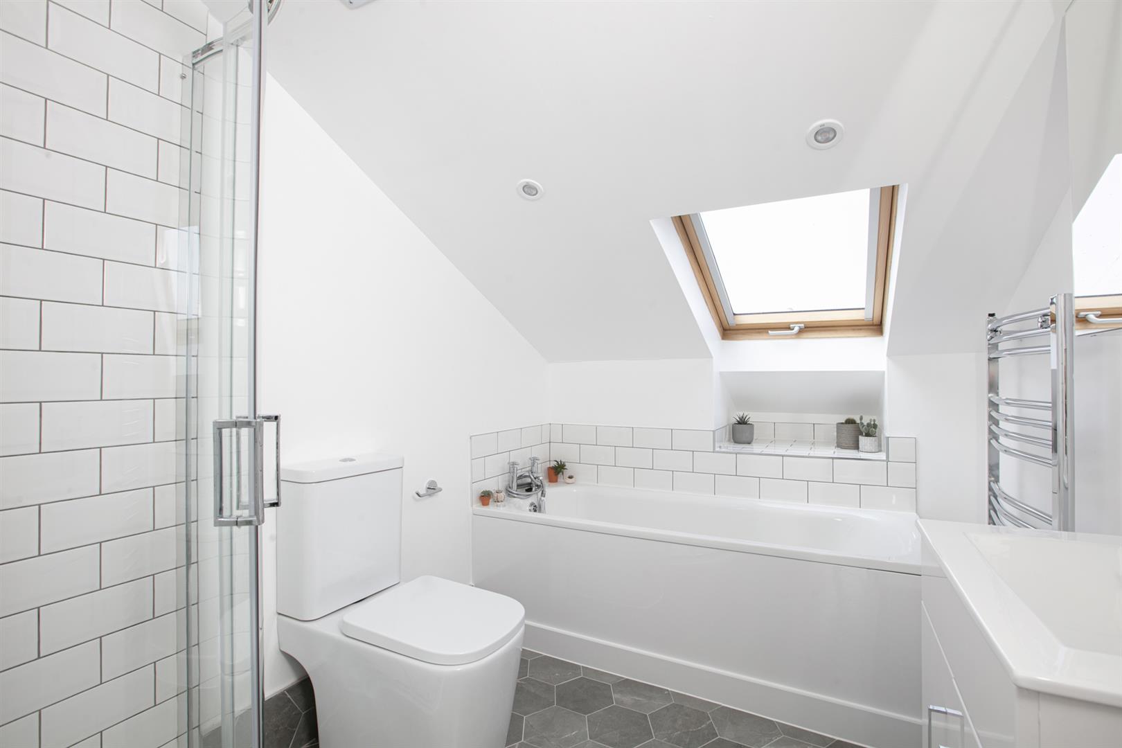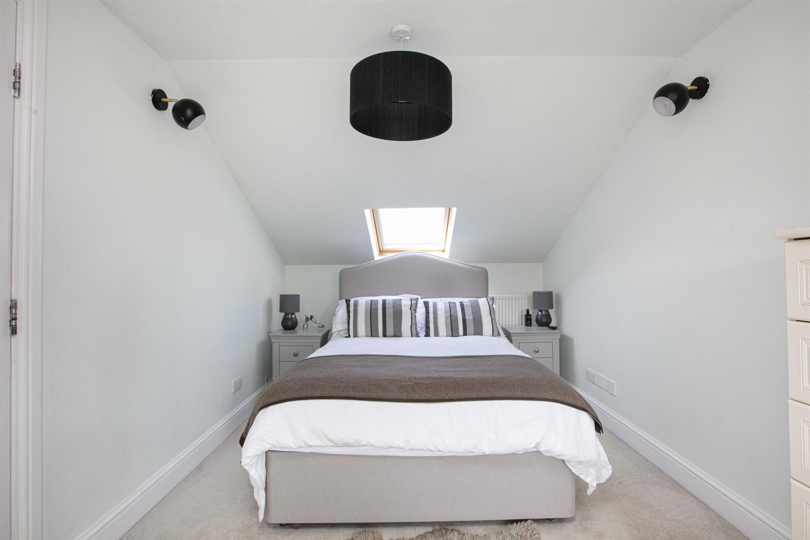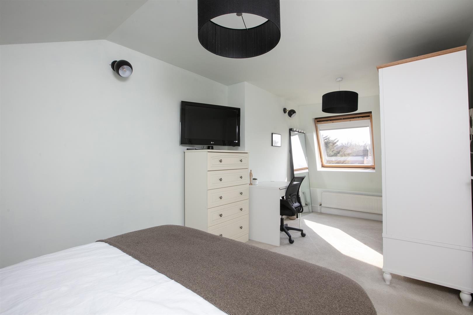 The first of your double bedrooms completes this floor with a lofty and leafy rear aspect. Heading upward you'll enjoy a contemporary inset with spot lights running upward along the staircase. The landing is wonderfully bright thanks to a vertical Velux. High ceilings make it feel super spacious. The master bedroom is a particularly large size and has a light aspect to front and rear. Next to this sits the bathroom which has both shower and bath, modern tiling, heated towel rail and a front aspect Velux.