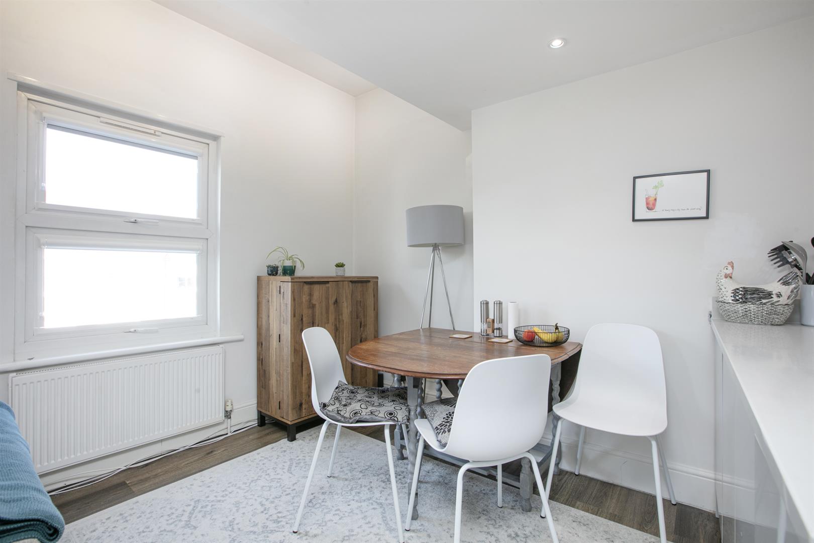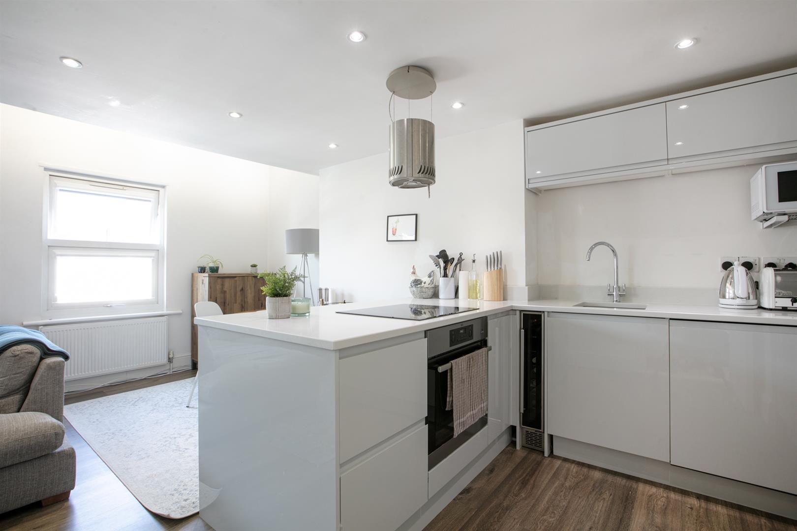 Enter the flat from the first floor where a bright inner stairwell leads upward. A rear facing casement affords ample light and leafy rear aspect. The living space fronts the street through two casement windows. A top notch kitchen/diner with thick quartz counters and oodles of storage will impress you no end. Appliance include four ring induction hob, integrated fridge/freezer and wine cooler. Your dishwasher and washing machine are integrated. There's plenty of space for lounging, dining and hosting the dinner parties you're famous for.