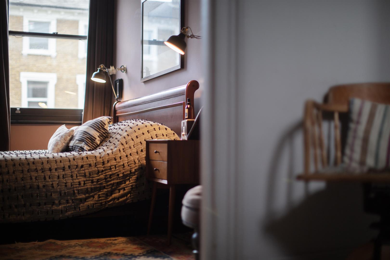 Heading upward, you find a spacious half-landing which is kept light by a side-aspect picture window. It will easily accommodate a seating or study area. The lavish family bathroom is accessed from here and has a yummy roll-top bath, period suite, walk-in shower, heated towel rail and fitted storage with dainty floral knobs. The first floor proper has two double bedrooms with glorious high ceilings. The sunny master bedroom stretches across the front of the house and has two lofty sash windows, earthy wall tones and fitted wardrobes in the alcoves. The rear-facing room is presented with rich olive walls and also benefits from fitted storage.