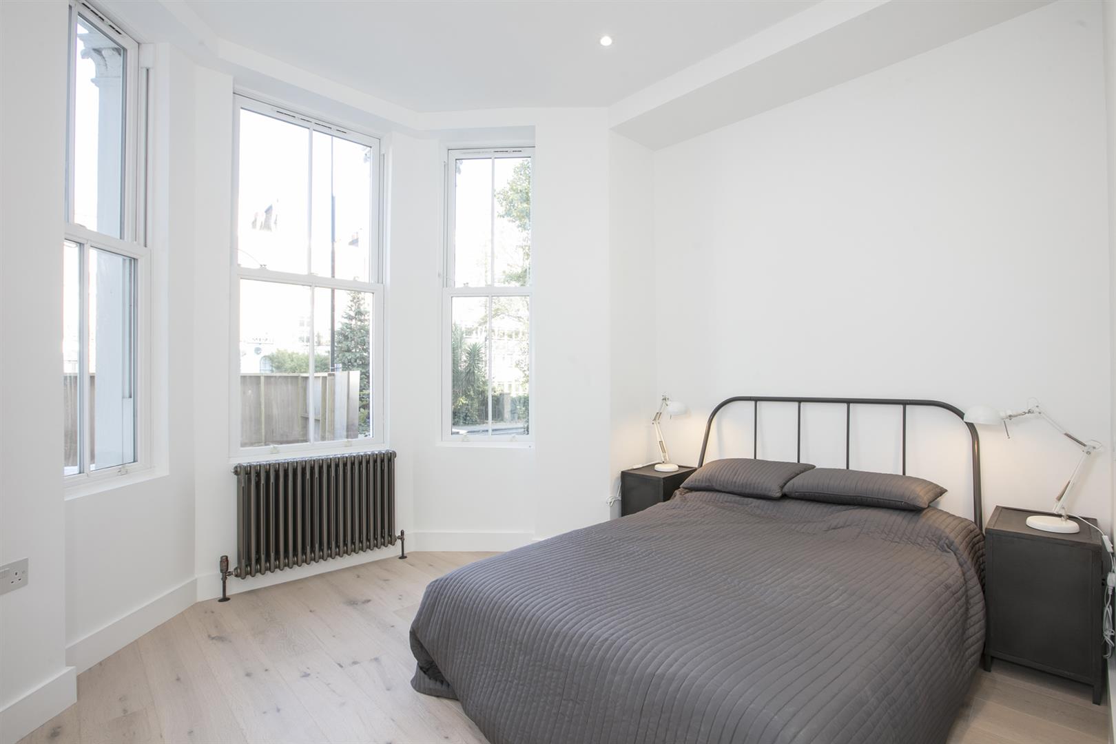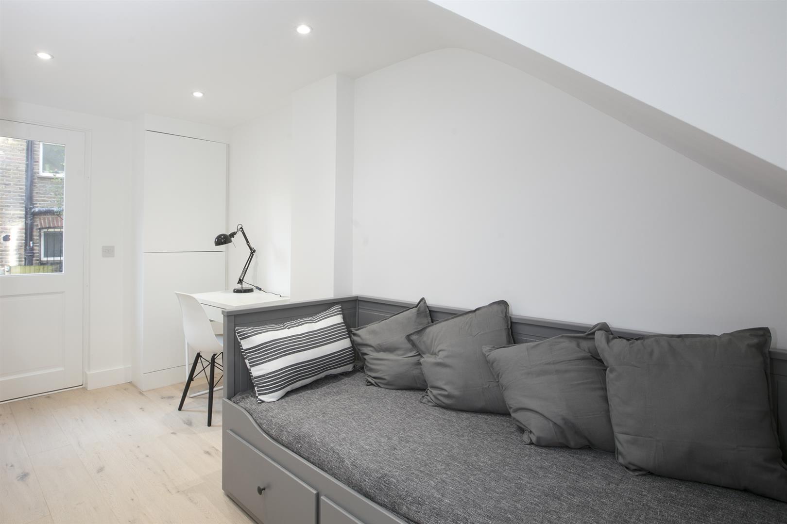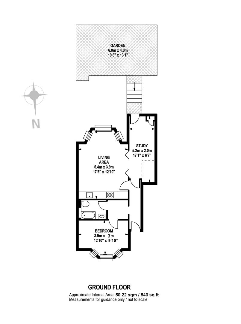 Enter through a shared front garden where steps lead up to your raised ground floor communal entrance. The shared hall is nicely presented and leads to your inner door. Once inside you find super-smart neutral décor and a fancy oblong school house style wall radiator. Turn left to find the double bedroom which fronts the street through a wide bay of double glazed sash windows. There are more swanky radiators and plenty of room for storage and slumber. The bathroom sits next door with some swish matt black fittings, a gleaming white suite, bath and inset shelving for your lotions and potions. The living area faces rear through another bay window. Your kitchen runs along the far wall with granite counters, four ring gas hob, oven, integrated dishwasher, fridge freezer and washing machine. Bi-folding double doors open wide to your adjoining study/spare room which can be incorporated into the overall living space for maximum versatility. This space opens to the garden which is decked and generous.