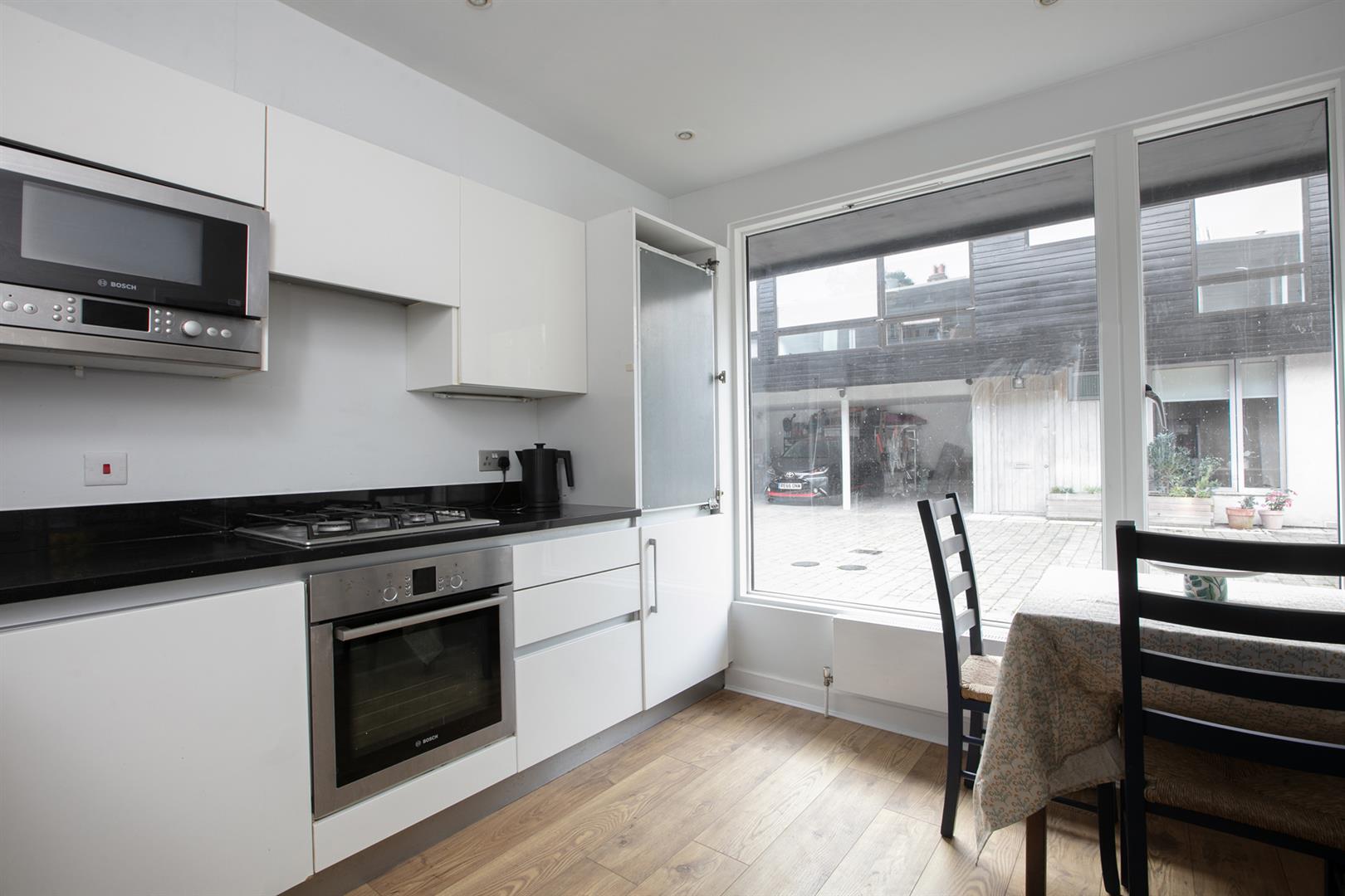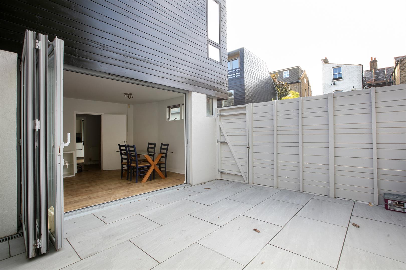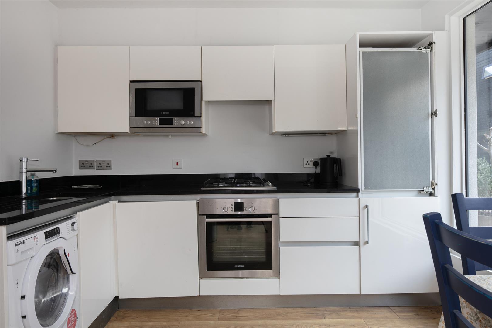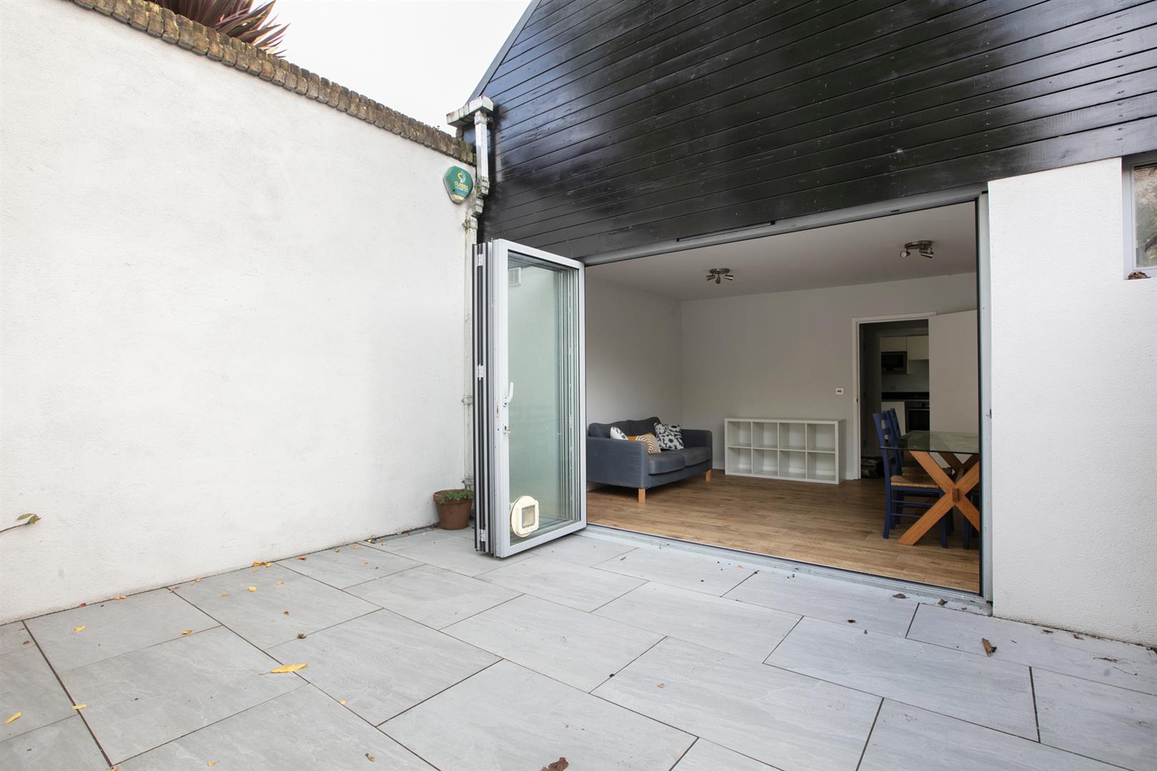 Enter at ground level into a bright and inviting entrance hall with pale neutral décor - a theme constant throughout. A step to the left delivers you to the fabulously airy reception which boasts access, through a wide sliding glass door, to the outside patio. Back through the hall you'll find the kitchen/diner which enjoys a Bosch appliances and a slick contemporary finish. The cabinets are modern and plentiful and house a dishwasher and washing machine. There is a handy guest cloakroom sitting beyond with loo and wash hand basin. A winding staircase leads you upward where you'll find the first floor, which plays host to two substantial double bedrooms. Each face front and enjoy a bright appointment. The main bathroom sits in between with sumptuous white suite and complimentary floor tiles.