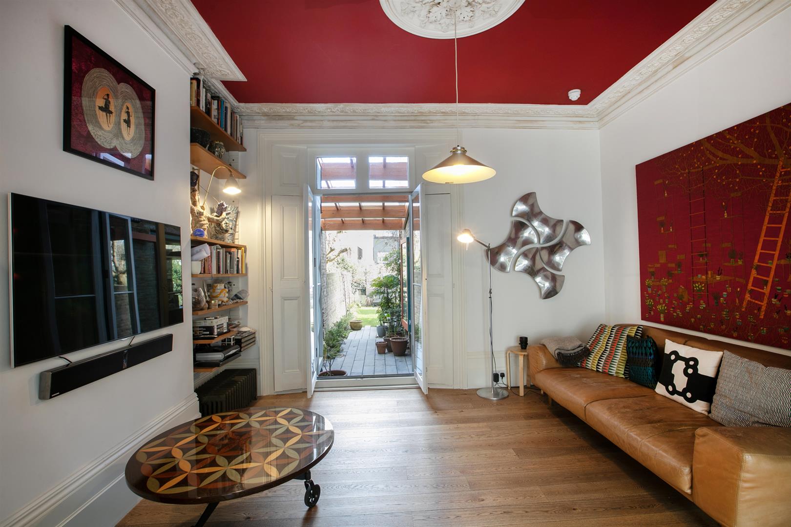 An arched recessed porch leads from the planted front garden providing privacy from the street into a wider than usual hall. The front door, painted vibrant aqua, enjoys frosted panes and a large rectangular light above. The hall has magnificently restored ornate original cornice work with matching corbels. From the hall you enter the double reception on the left. Both reception rooms also have similarly restored period ceiling cornices and roses. The wide front bay window has new wooden shutters careful copies of the originals and there's a lovely bespoke designed contemporary marble mantel over the open hearth, with a huge, bevelled mirror above. In both reception rooms in the alcoves either side of the chimney breasts are contemporary shelves designed by the owners with short deep Victorian caste iron radiators below. The rear reception room has its original French doors with integrated shutters leading out to the garden.