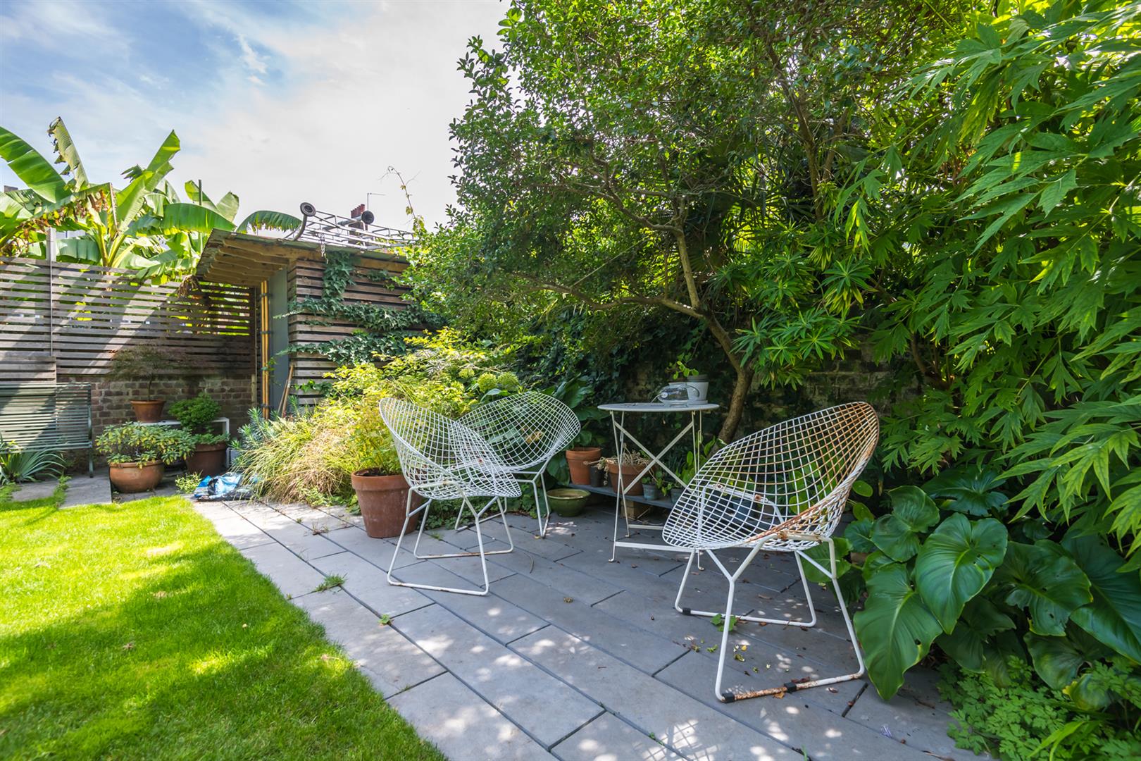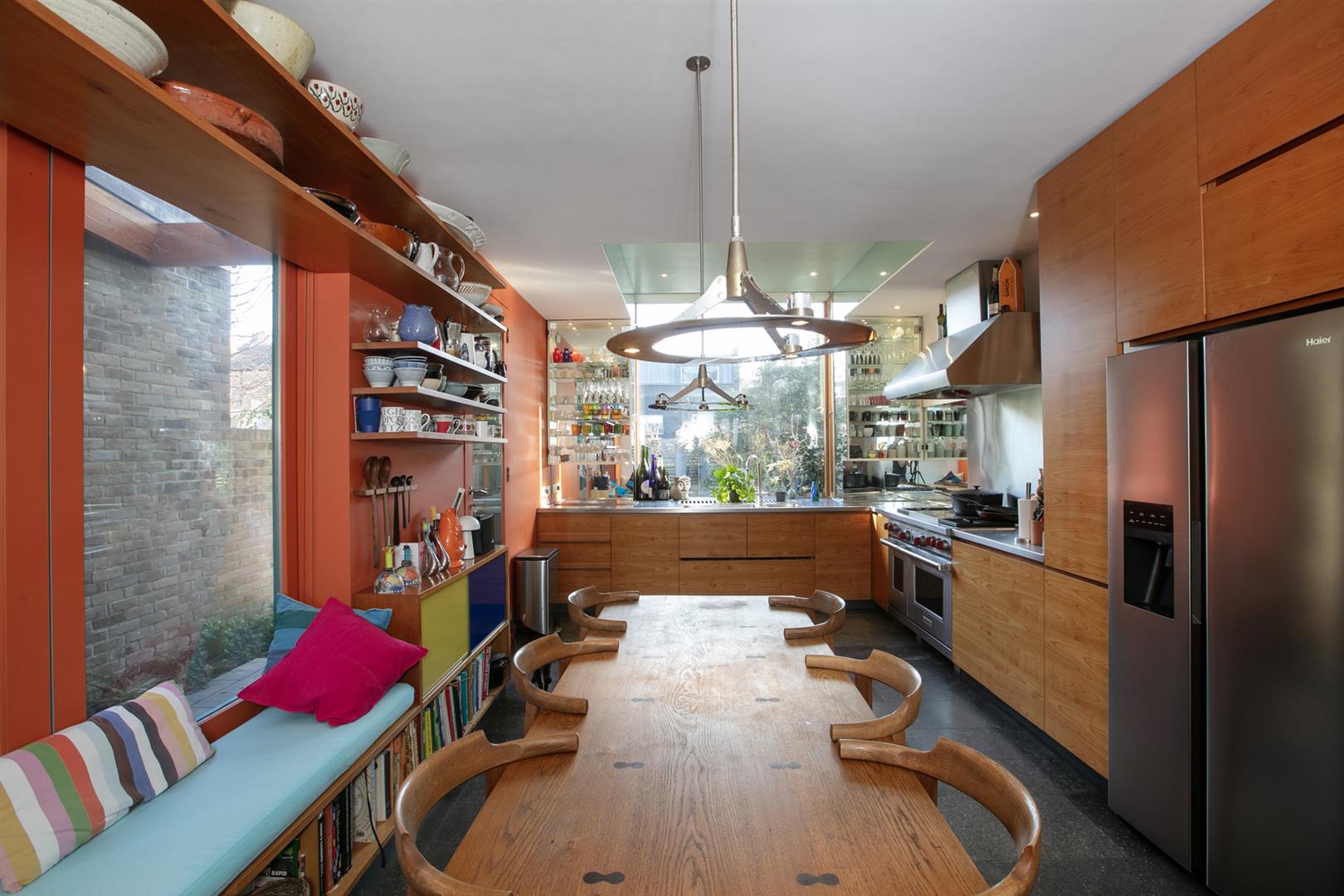 Toward the end of the ground floor entrance hall, you find the splendid kitchen/diner full of storage, uniquely and thoughtfully designed with its extra tall rear-facing picture window. High level mirrors line the window and stretch into the room reflecting light and ingeniously making use of all aspects as the sun changes its position. The kitchen cabinets are cherry wood, and appliances include a Wolf stainless steel range, American fridge and integrated dishwasher. A wonderful side-facing set of French windows open back to the wall alongside the window seat. It's a morning sun trap and the perfect al-fresco dining spot for breakfast. There's even a niftily concealed cat flap with feline dining area. Venturing to the garden reveals a sunny garden with a terraced shady spot to protect you from direct sun, a healthy lawn, a discreet storage shed and a pleasant collection of mature shrubs and foliage.