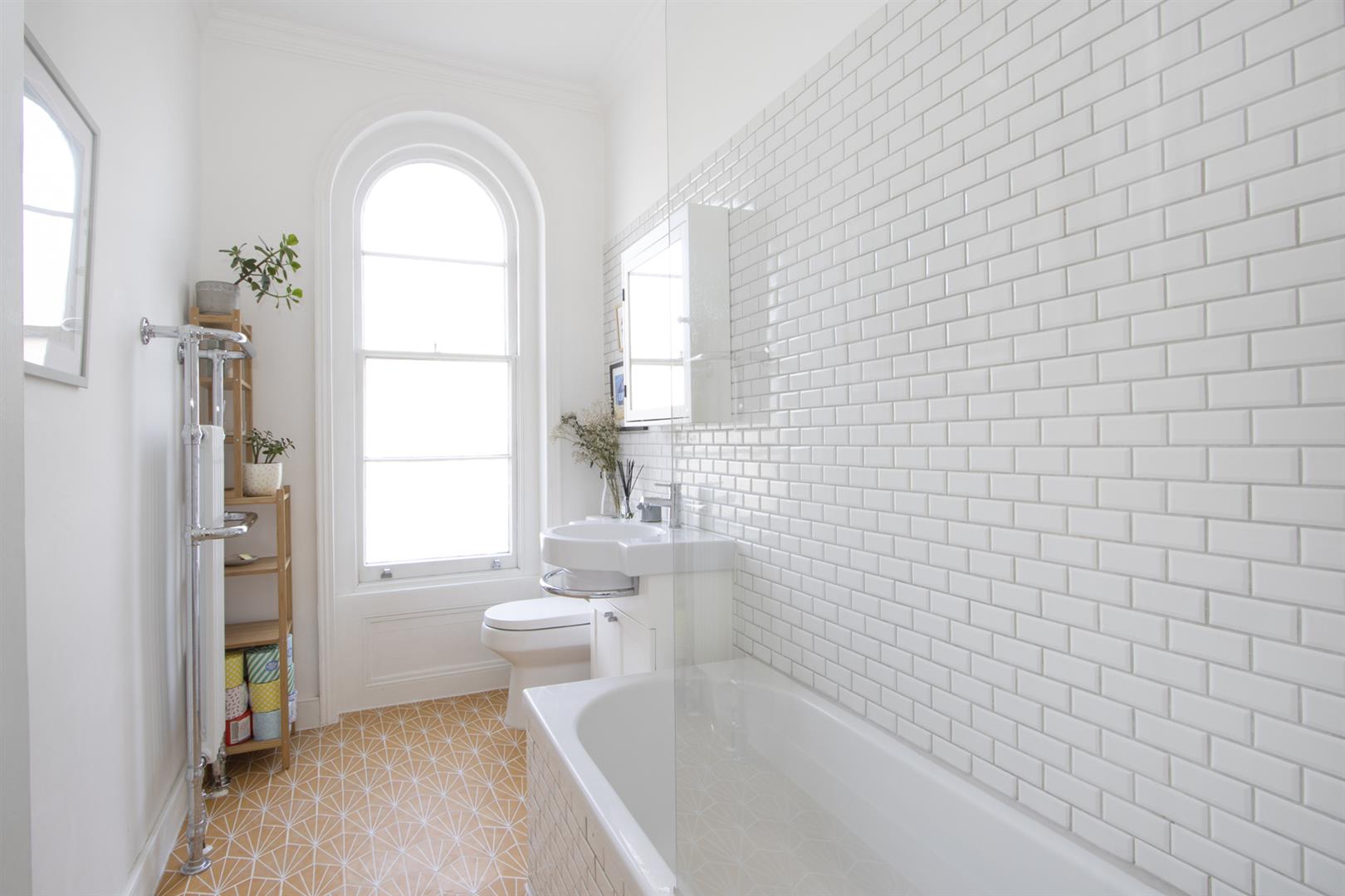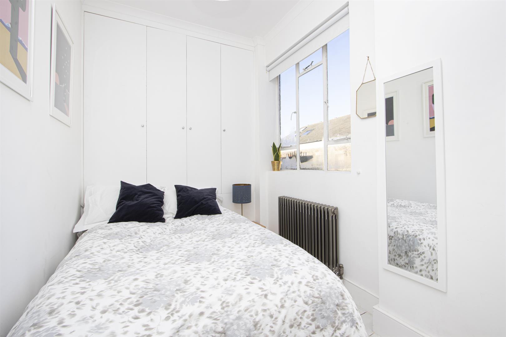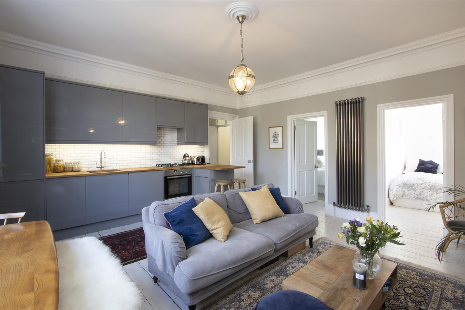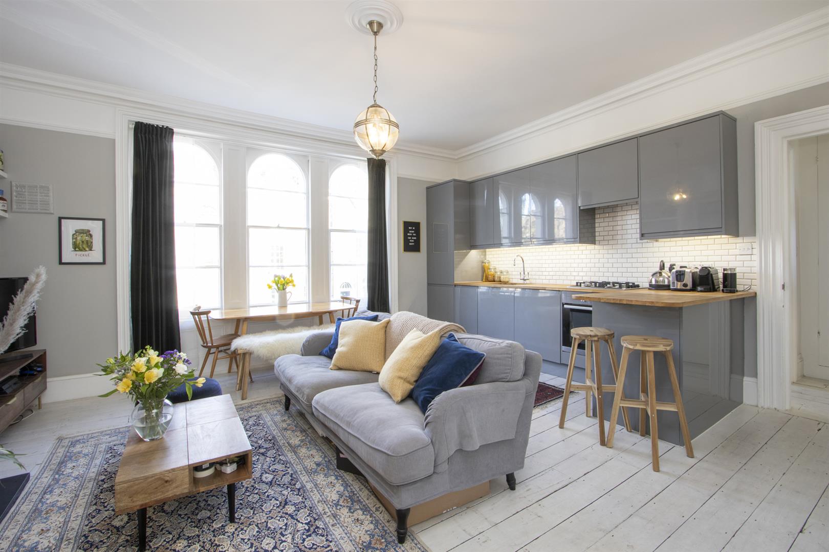 A shared entrance leads to your first floor door. In the hall you'll find storage cupboards directly to your right. Straight ahead to find a large and bright open plan kitchen/living room. There are beautiful large arched sash windows allowing light to flood into the property. A stunning marble mantel and cast iron vertical radiator are part of the sleek finish. The super slick kitchen runs along the right hand side and plays host to modern retro grey cabinets and wooden counters with a handy breakfast bar at the end. Everything you need is included - oven with gas hob, fridge freezer, washing machine and dishwasher.
