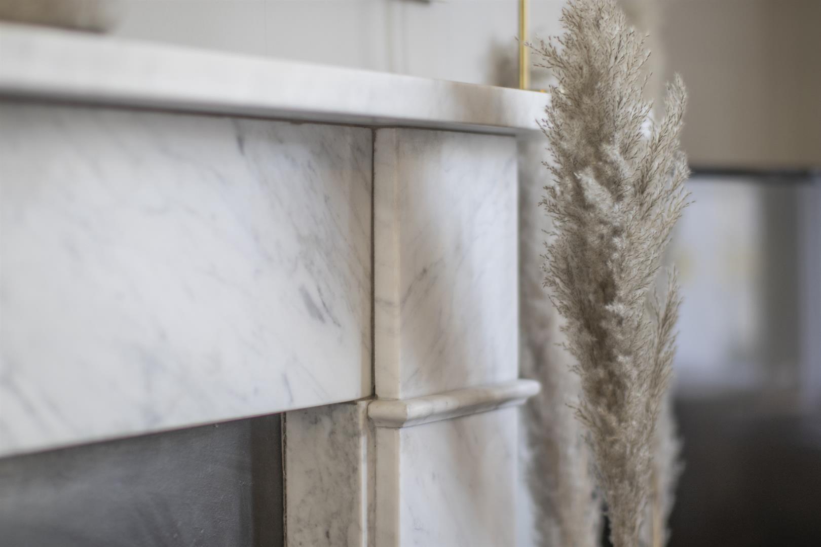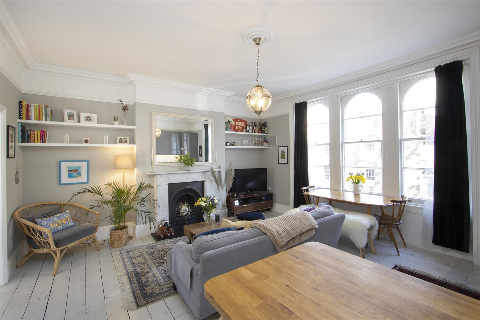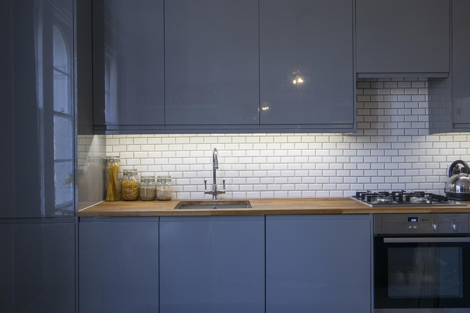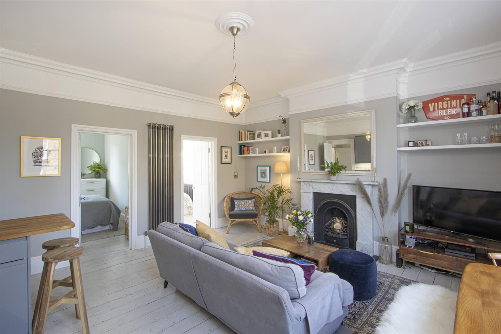 A shared entrance leads to your first floor door. In the hall you'll find storage cupboards directly to your right. Straight ahead to find a large and bright open plan kitchen/living room. There are beautiful large arched sash windows allowing light to flood into the property. A stunning marble mantel and cast iron vertical radiator are part of the sleek finish. The super slick kitchen runs along the right hand side and plays host to modern retro grey cabinets and wooden counters with a handy breakfast bar at the end. Everything you need is included - oven with gas hob, fridge freezer, washing machine and dishwasher.