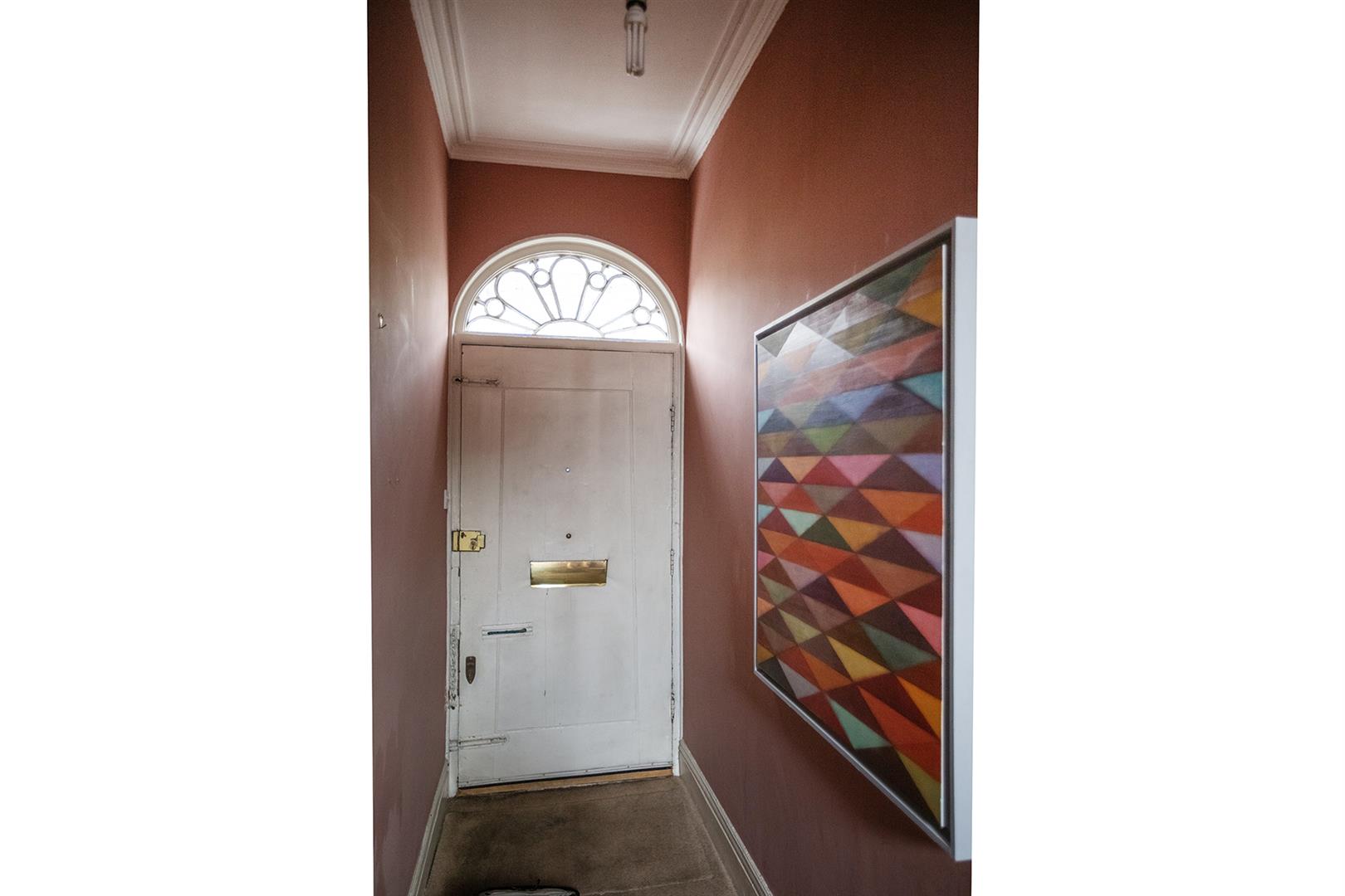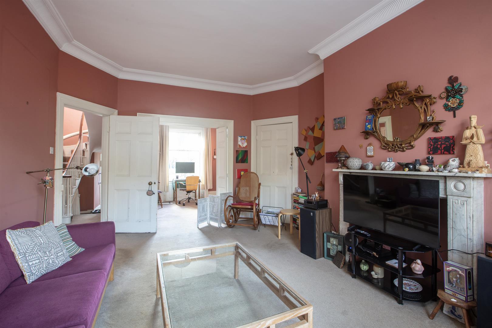 Back in the entrance hall you can pause to appreciate the fine original staircase with its charmingly curved original hardwood hand rail and original banisters. A rear-facing sash window floods the landing with light as you move up to the first floor piano nobile and enter a most impressive high ceilinged front facing room, currently an art studio (this house has nurtured creativity over recent years with an artist and a musician inspired to create their art there), which commands lovely views over the Grove through a duo of floor-to-ceiling windows with shutters and Juliette balconies. Boasting another feature mantel piece in marble, the space would make a fine drawing room or indeed a most-coveted master bedroom. An additional room adjoins to the rear, divided by period shutters for maximum flexibility.