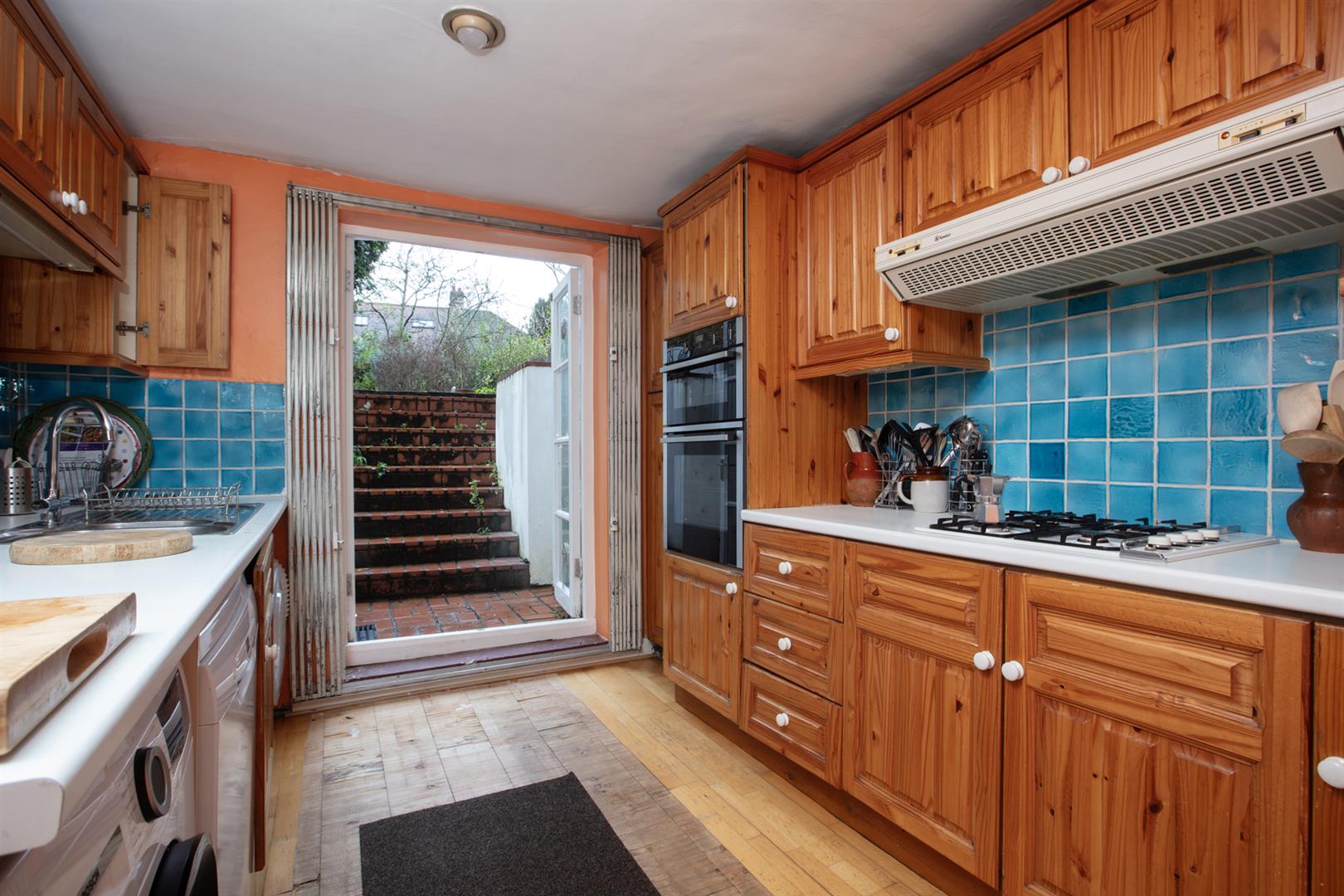 On the lower ground floor you find a large front-facing room which is currently used as a formal dining space but could also be used as a bedroom. It has more fitted storage and direct front access via external steps to the front garden that sits above external deep vault storage. The kitchen sits to the rear of the lower ground floor with opposing rows of cabinet and counter space. Double doors open to sweeping steps up to the rear garden paved patio and a pretty well-stocked garden. This floor is completed by a small bathroom.