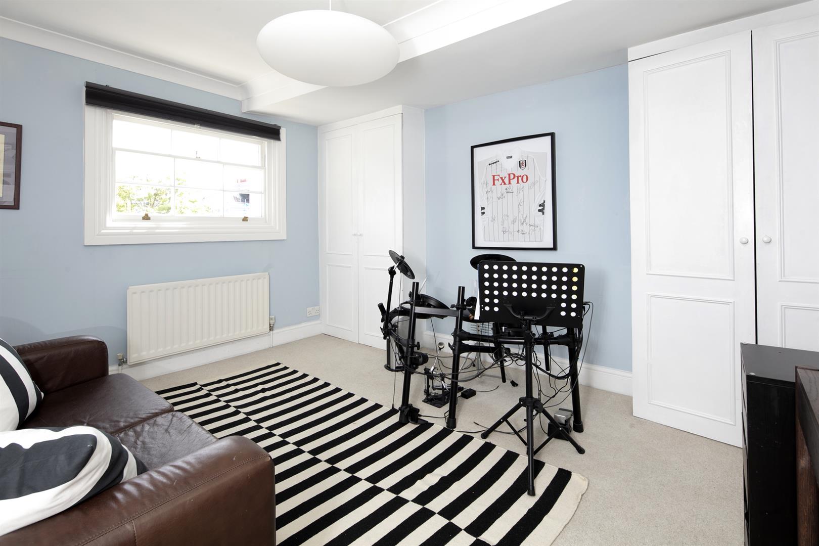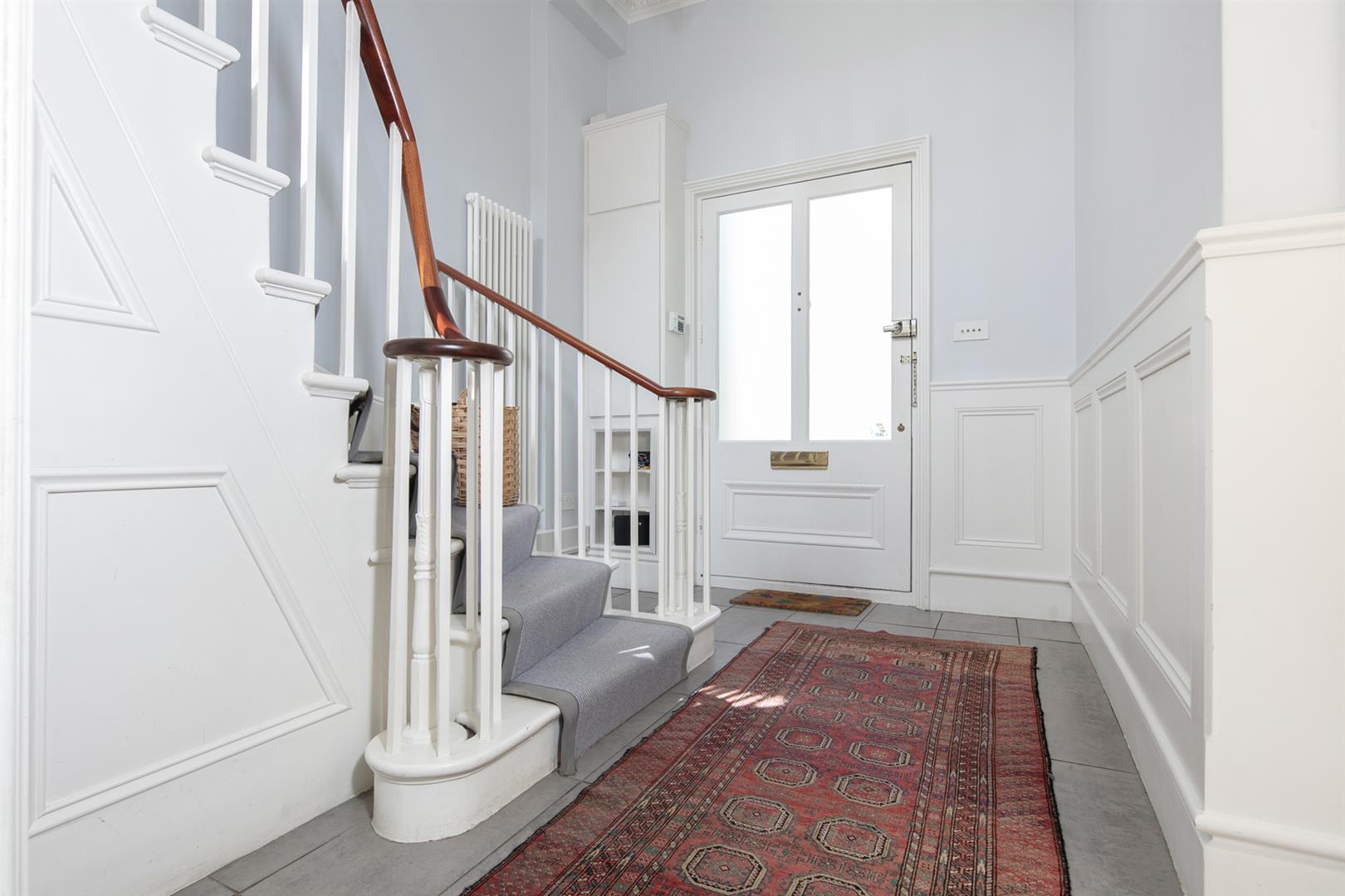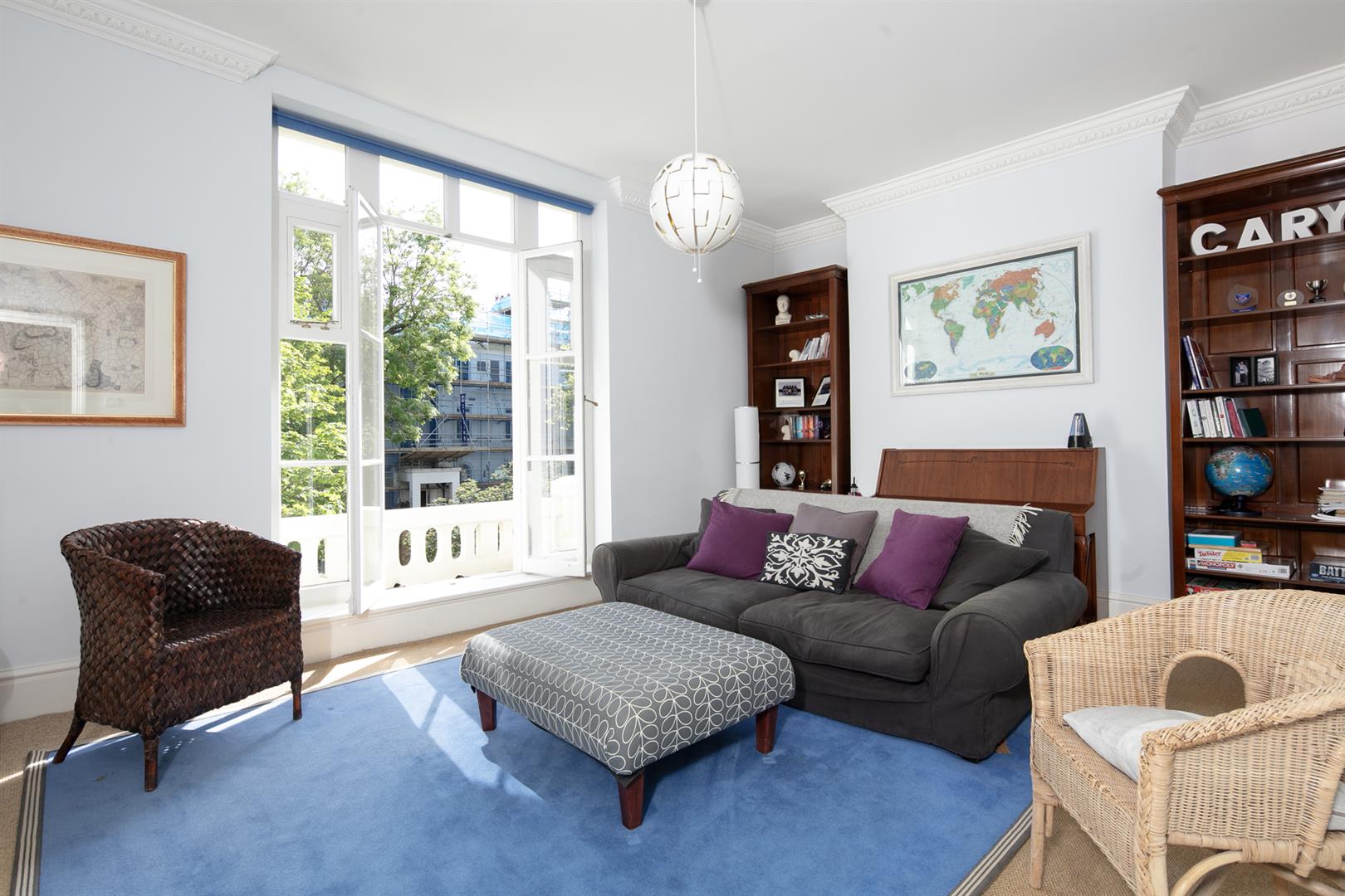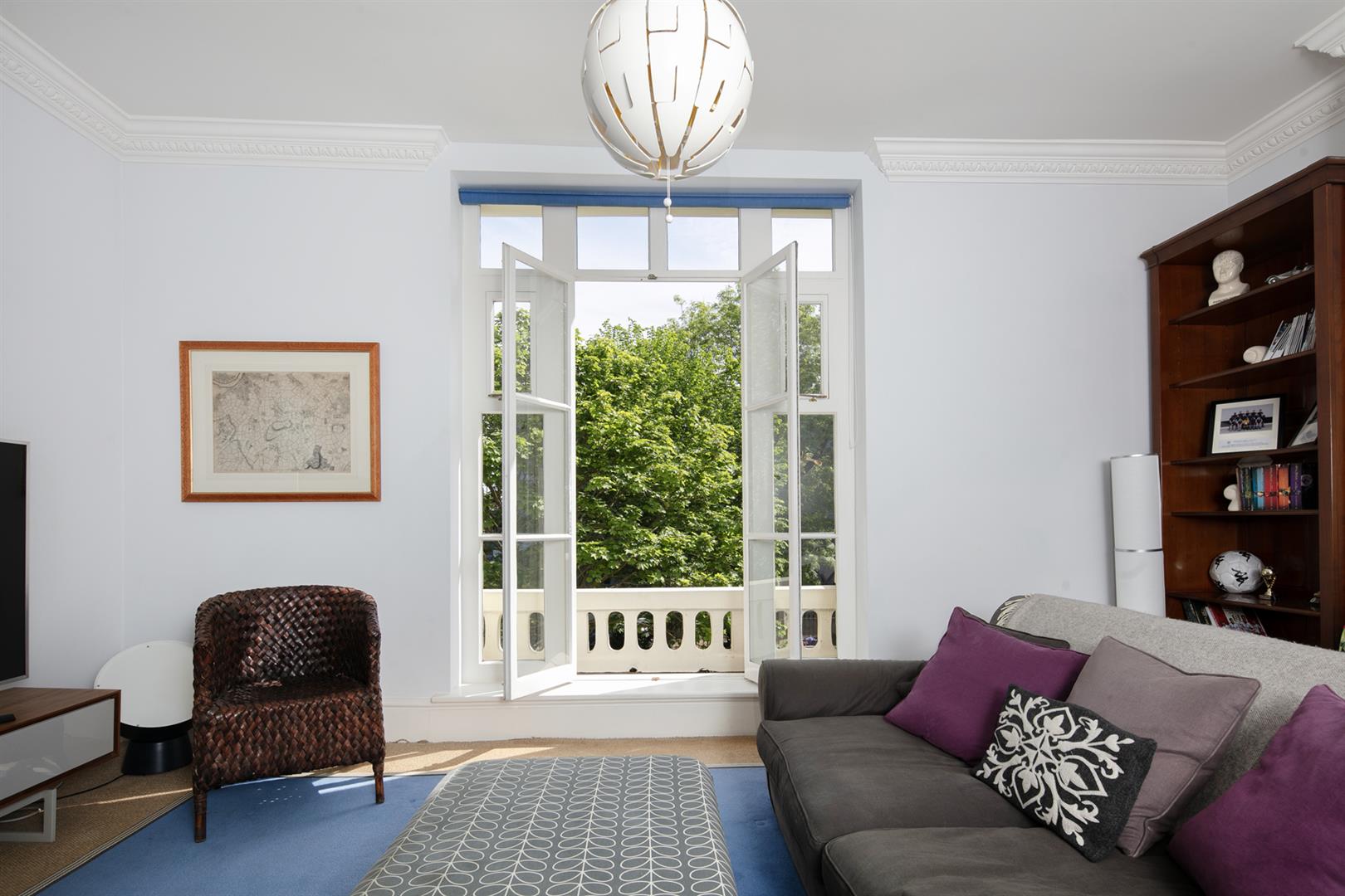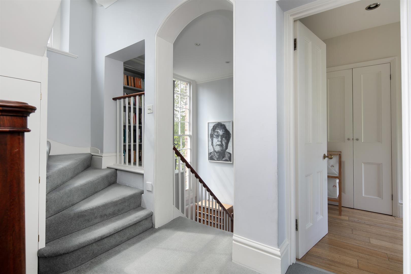 Taking the staircase up to the first floor you reach a gloriously airy and spacious half-landing with plentiful custom built shelving. A great sized bathroom with separate shower cubicle is first left. The drawing room gracefully fronts the street with more sublime views over the Grove through tall French doors. Shelving and cupboard space adorns the chimney recesses. Out of here and left is the first of five double bedrooms. Upward to the second floor you find a sensationally proportioned master suite with sunken en-suite bathroom and adjoining dressing room. A third double bedroom completes this floor nicely. Opposite the top landing is a good sized bathroom, to your left is a cupboard followed by a door leading out onto a fab terrace with superb views. The last two double bedrooms bear right and both have double sets of fitted wardrobes. The top floor terrace is accessed off the landing and supplies the perfect spot for watching the fireworks on New Year's Eve.