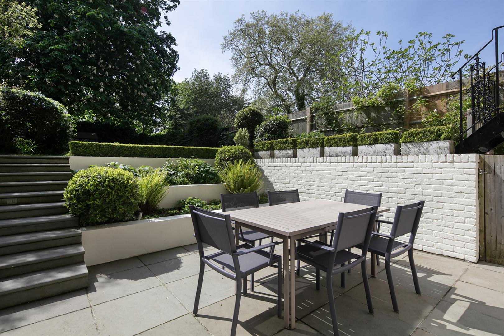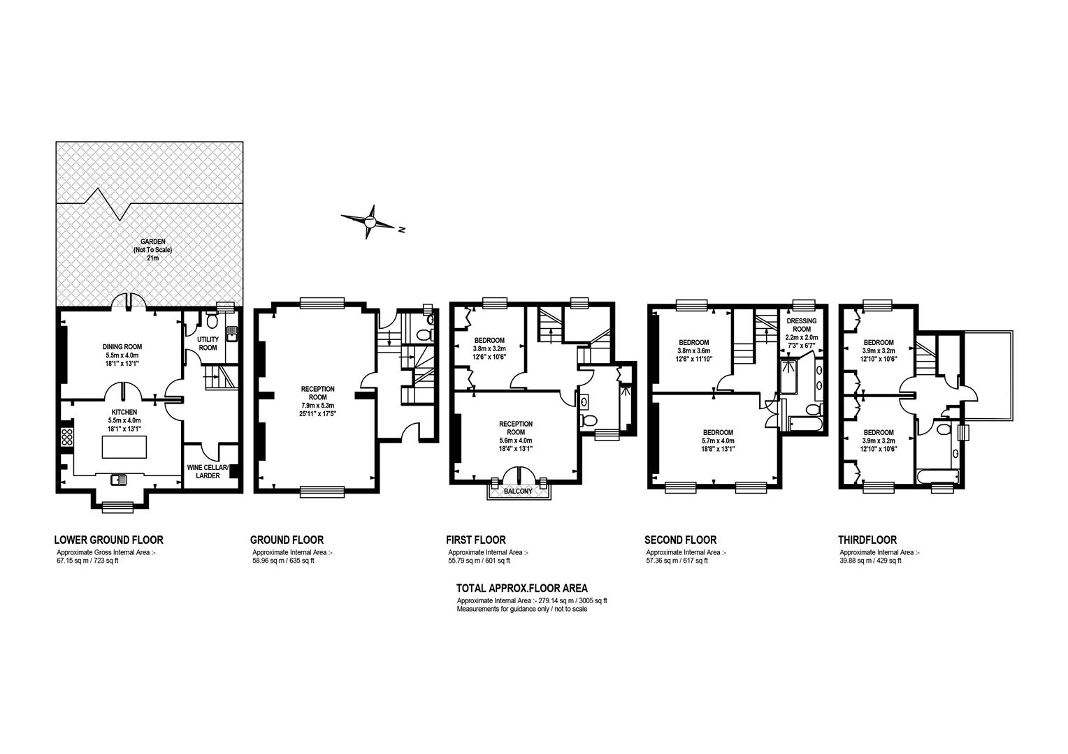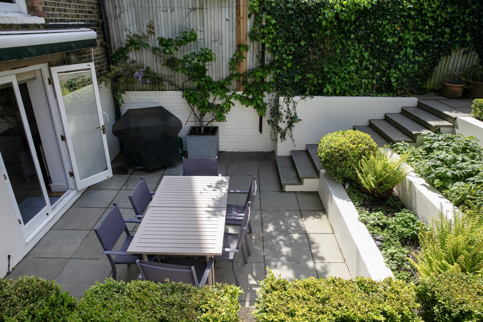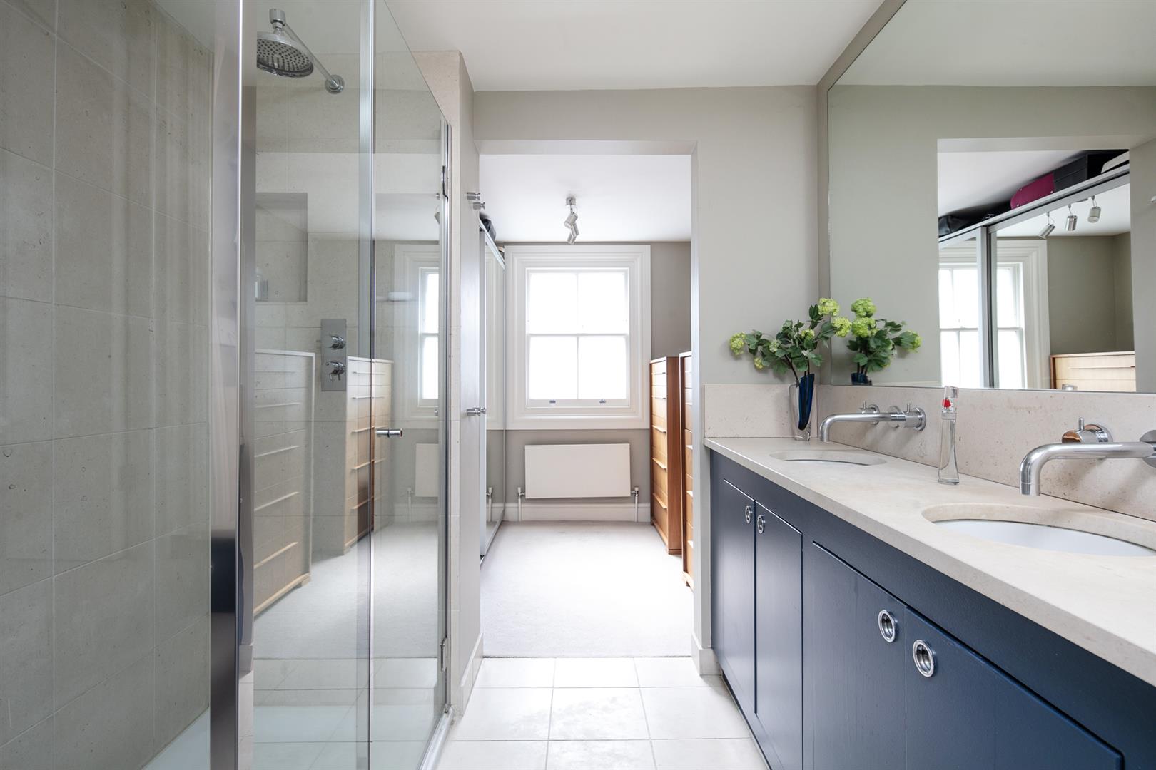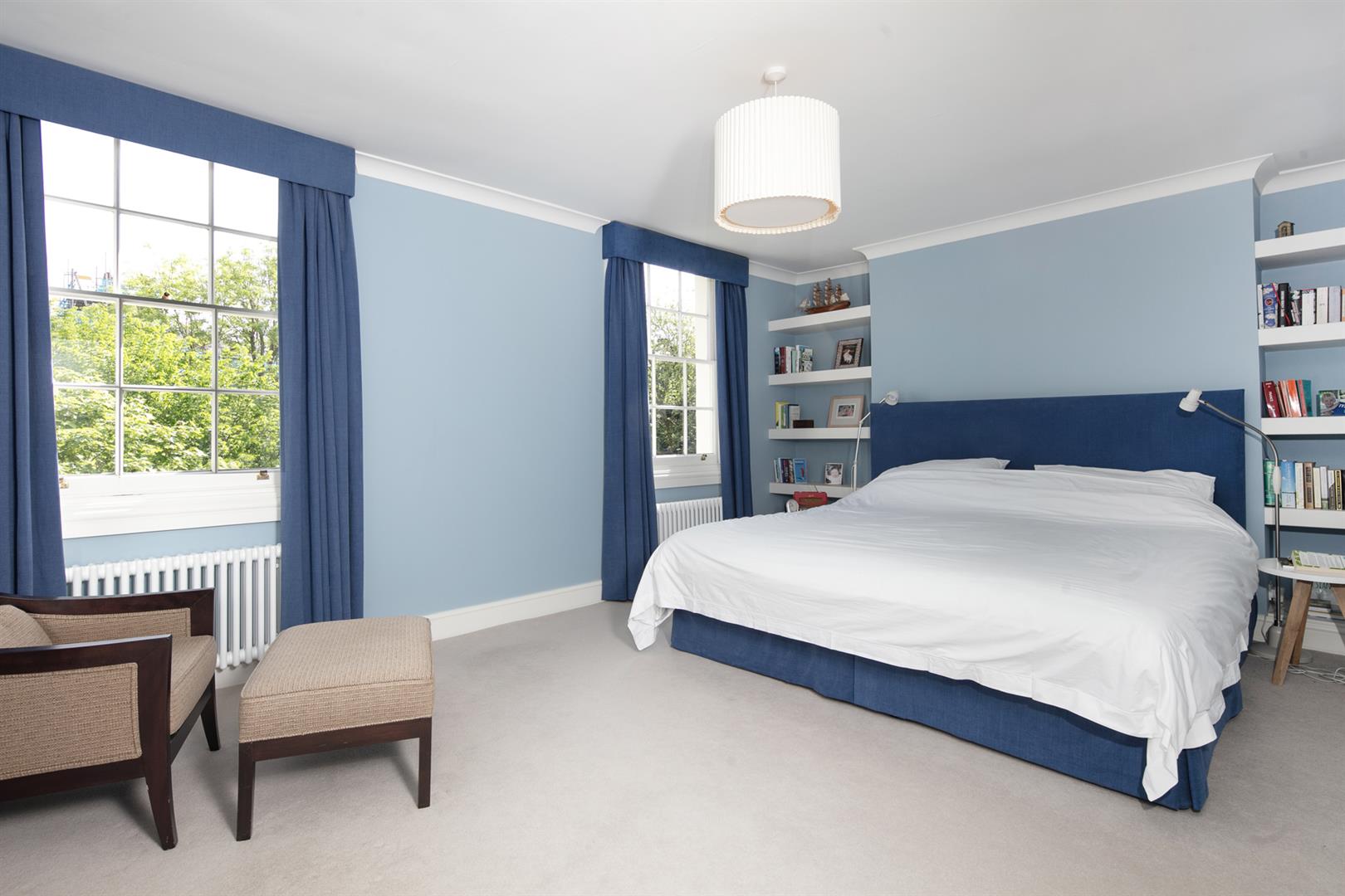 Taking the staircase up to the first floor you reach a gloriously airy and spacious half-landing with plentiful custom built shelving. A great sized bathroom with separate shower cubicle is first left. The drawing room gracefully fronts the street with more sublime views over the Grove through tall French doors. Shelving and cupboard space adorns the chimney recesses. Out of here and left is the first of five double bedrooms. Upward to the second floor you find a sensationally proportioned master suite with sunken en-suite bathroom and adjoining dressing room. A third double bedroom completes this floor nicely. Opposite the top landing is a good sized bathroom, to your left is a cupboard followed by a door leading out onto a fab terrace with superb views. The last two double bedrooms bear right and both have double sets of fitted wardrobes. The top floor terrace is accessed off the landing and supplies the perfect spot for watching the fireworks on New Year's Eve.