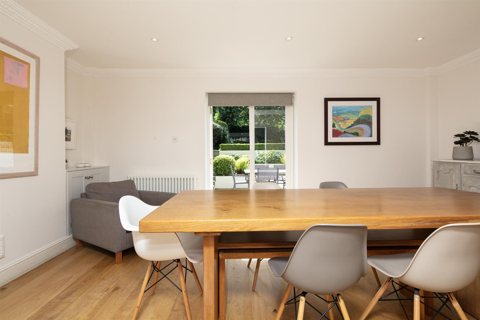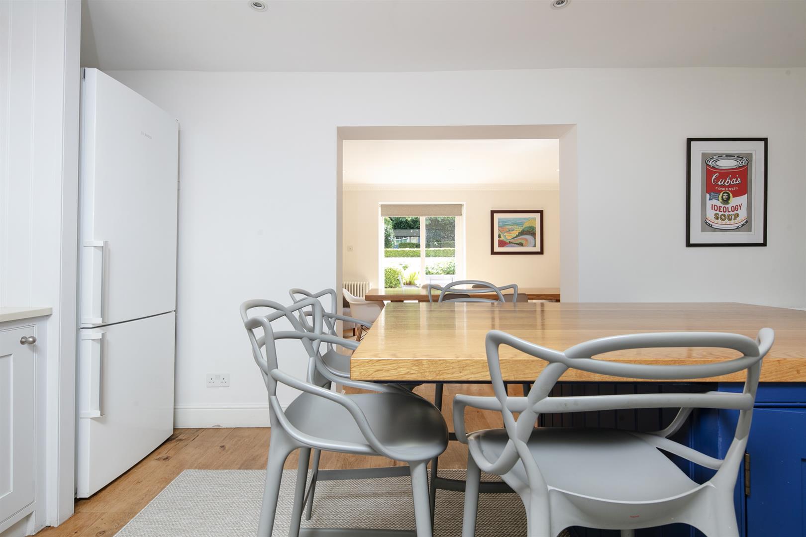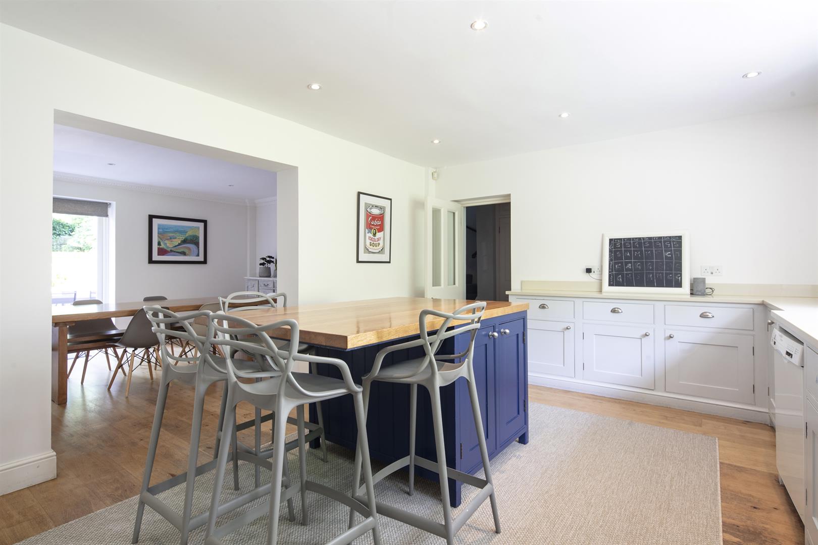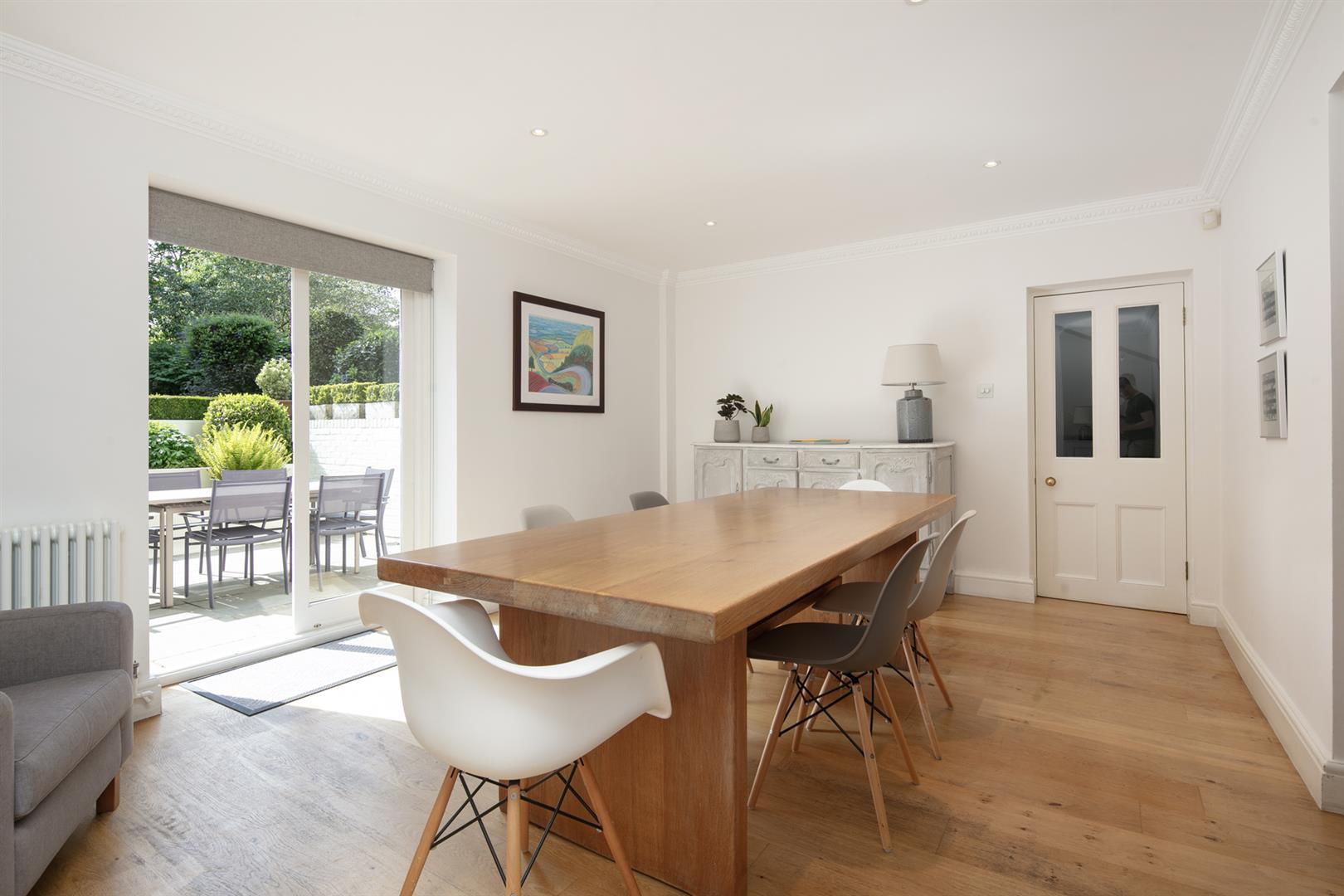 The garden is accessed from the rear of the entrance hall. It's a very good size with mature shrubbery, lower patio and expansive healthy lawn. Back inside head down to the lower ground floor to find an impressively proportioned kitchen/diner with hand-built shaker style units. A beautiful range-style electric oven with induction hob is set into the chimney breast and there's a sizeable island for dicing, slicing and dining. An open arch leads through to the formal dining area which enjoys French doors opening onto the patio. Completing the lower ground floor is a handy utility/wc and a wine cellar/larder.