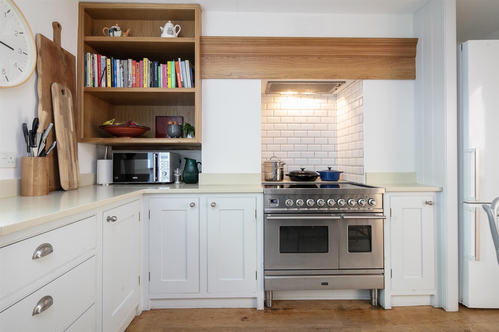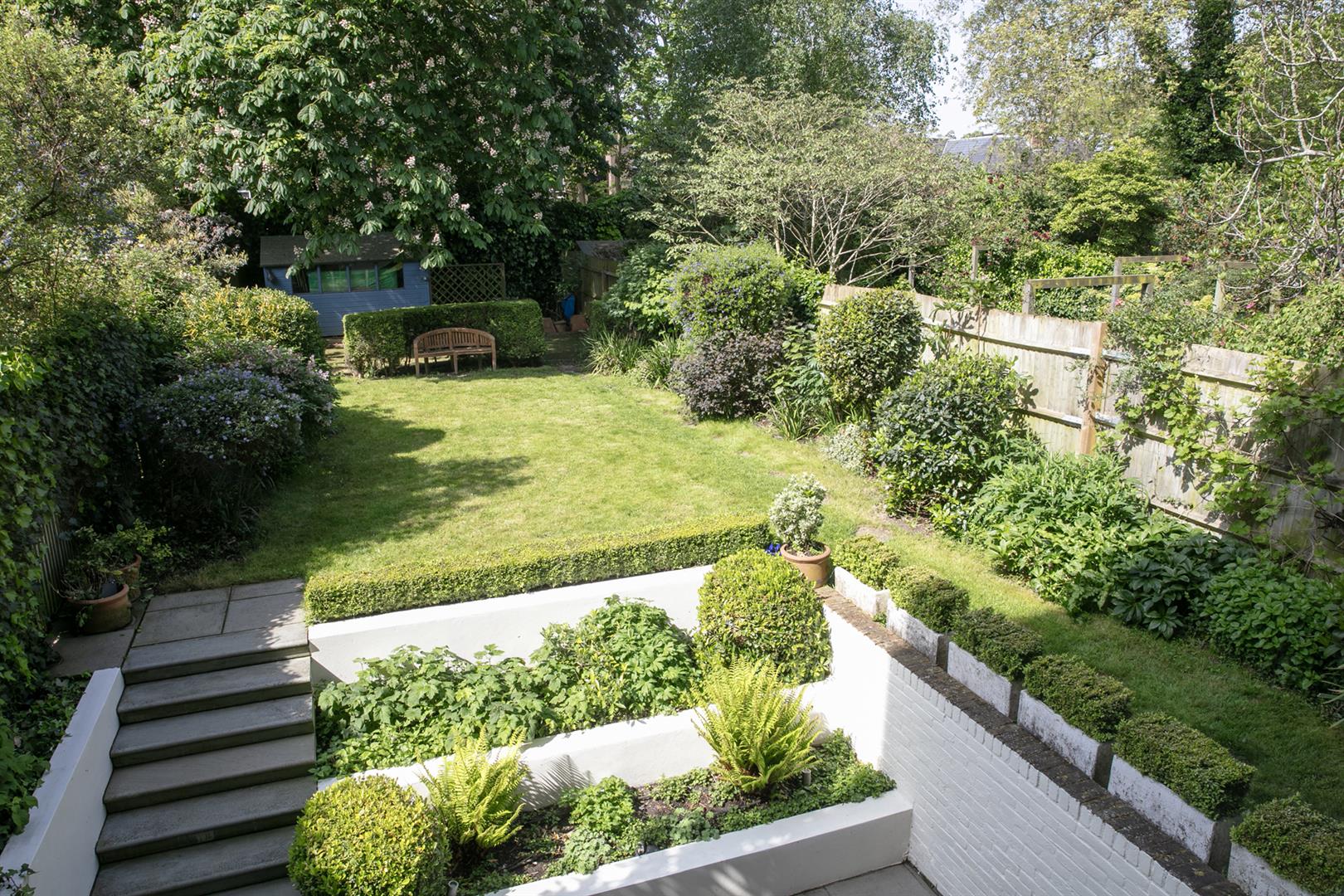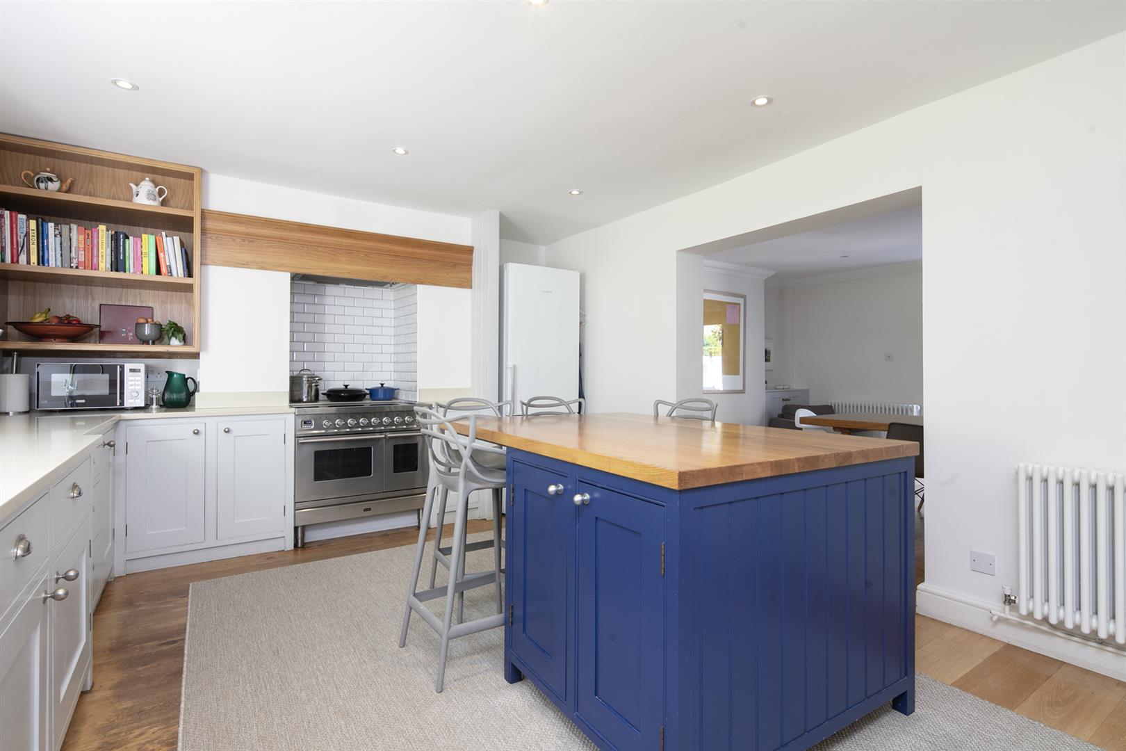 The garden is accessed from the rear of the entrance hall. It's a very good size with mature shrubbery, lower patio and expansive healthy lawn. Back inside head down to the lower ground floor to find an impressively proportioned kitchen/diner with hand-built shaker style units. A beautiful range-style electric oven with induction hob is set into the chimney breast and there's a sizeable island for dicing, slicing and dining. An open arch leads through to the formal dining area which enjoys French doors opening onto the patio. Completing the lower ground floor is a handy utility/wc and a wine cellar/larder.