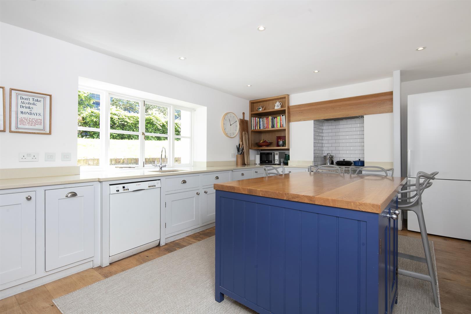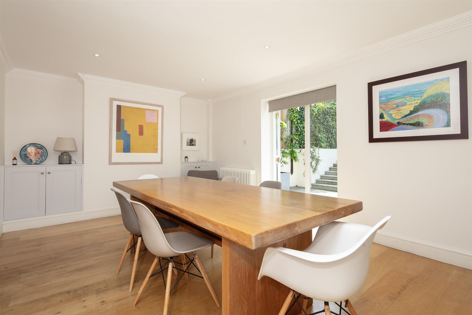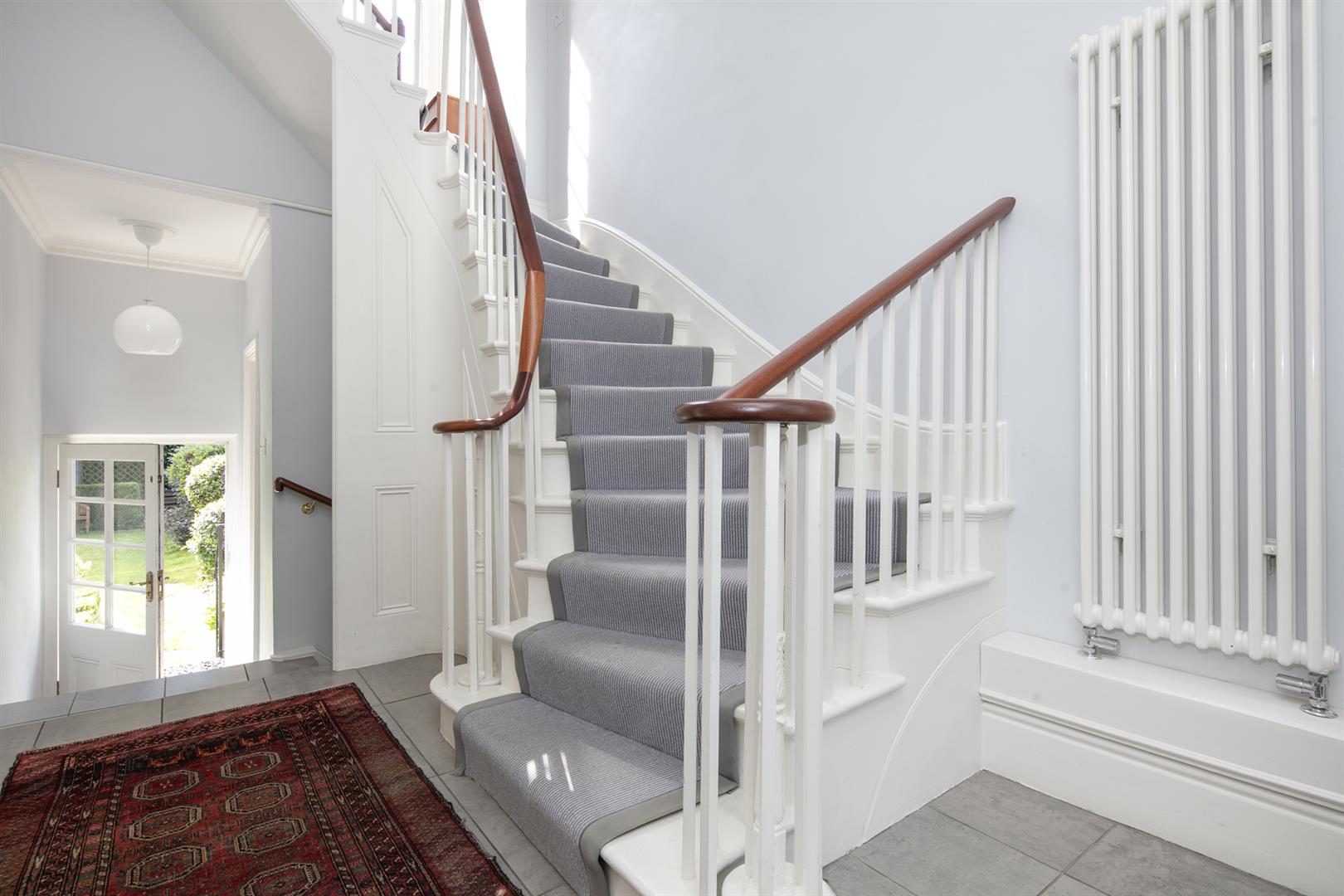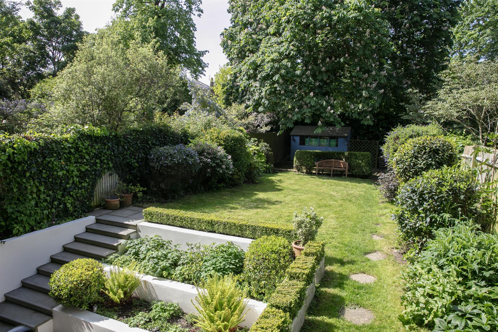 The garden is accessed from the rear of the entrance hall. It's a very good size with mature shrubbery, lower patio and expansive healthy lawn. Back inside head down to the lower ground floor to find an impressively proportioned kitchen/diner with hand-built shaker style units. A beautiful range-style electric oven with induction hob is set into the chimney breast and there's a sizeable island for dicing, slicing and dining. An open arch leads through to the formal dining area which enjoys French doors opening onto the patio. Completing the lower ground floor is a handy utility/wc and a wine cellar/larder.