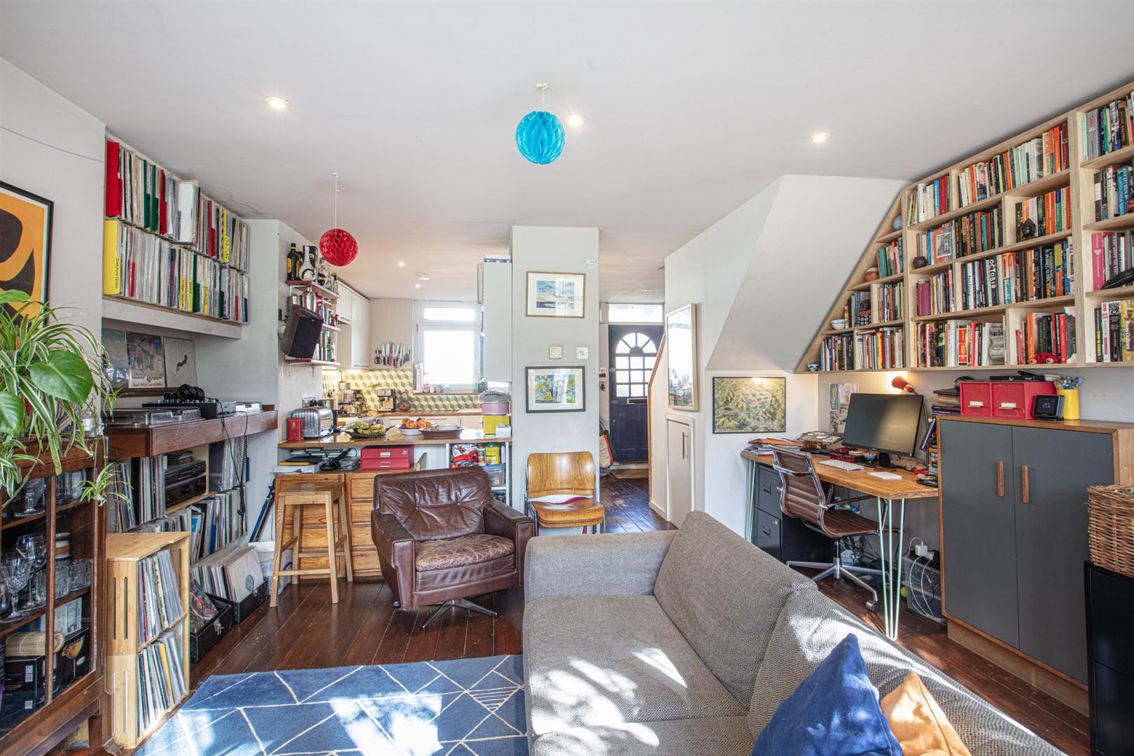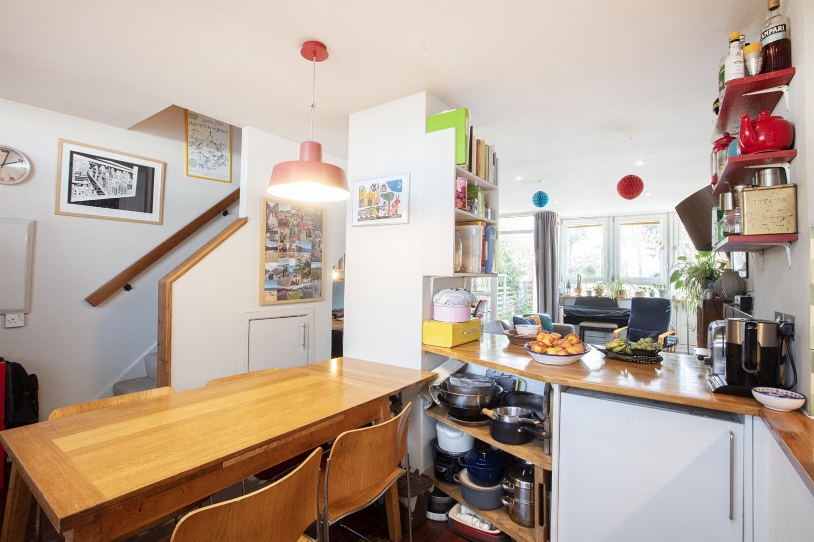 Enter directly into a fabulous open-plan living space which spans the entire ground floor footprint. A modern kitchen with comfortable dining area sits immediately on the right hand side. There is plenty of cabinet and counter space, a four ring gas hob, oven and some funky geometric splash back tiling. A comfortable lounge proceeds the kitchen, again spanning the full width of the property. It enjoys bespoke shelving and storage and opens onto a rear Yorkstone paved patio which leads onward to the amazingly expansive and peaceful communal garden. We can't think of a better place to unwind in the milder months.