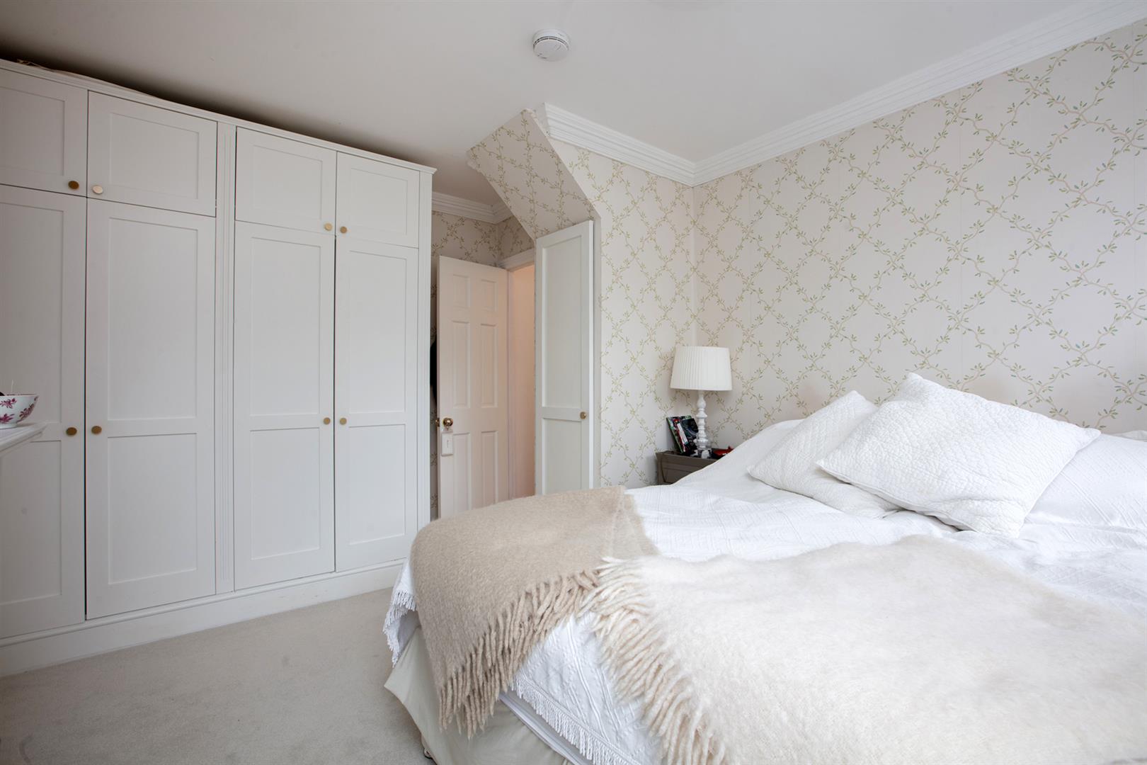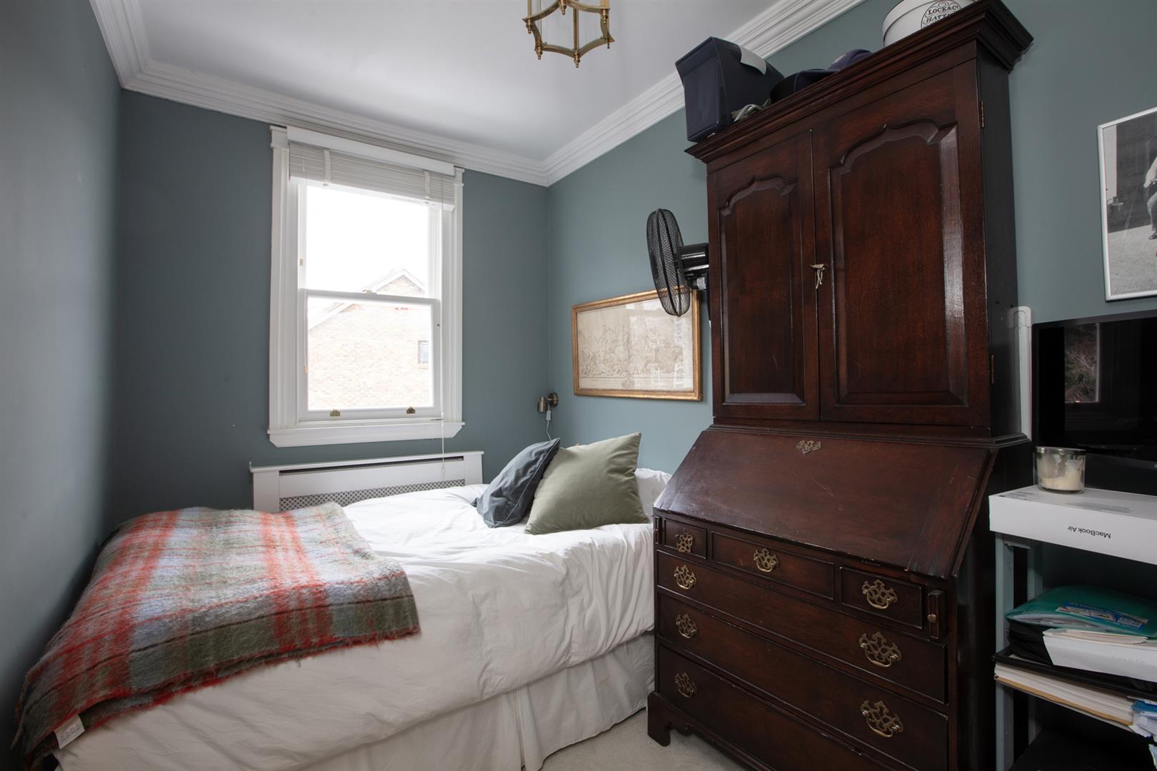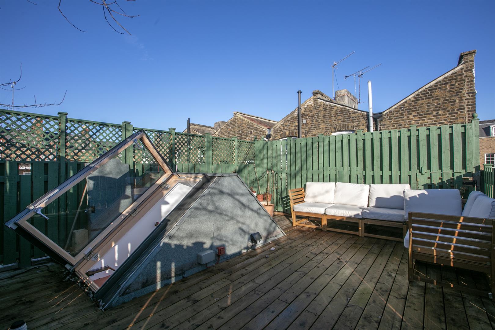 The first floor follows a pleasant linear formation with all the main rooms enjoying a front aspect. a carpeted landing first gives leave to a mostly tiled bathroom with contemporary suite and drencher over the bath. A large skylight ensures bright and airy ablutions. Bedroom one has dado rails separating subtle shades and will comfortably house a double bed and storage. Bedroom two has dusky blue walls and cornicing whilst bedroom three, the master, boasts a pretty fireplace and oodles of fitted storage. Floral wallpaper adds to the ambience. The roof terrace is simply delightful with panoramic roof top views over Grove Lane. Plenty of mature leafiness and smart timber flooring and fencing. A handy butler sink with antique taps will make hosting the summer BBQ even easier. The space is accessed from the landing up carpeted stairs and through a nifty glass door with easy-open hydraulics.