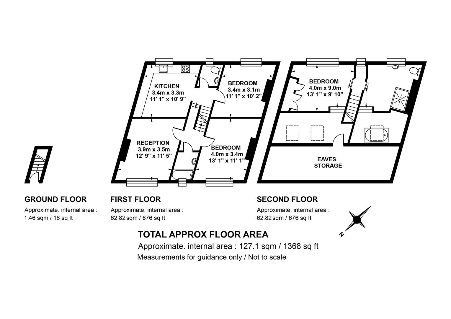 Opposite this is the first of your double bedrooms. Currently used as a living space it faces rear and has a pretty feature fireplace. A cute wc completes this level with more marmoleum underfoot. Ascending two steps you reach a bright landing stealing light from the opaque glass doors of the front-facing bathroom dead ahead. It's a neat room with cute bath and matching wash hand basin. A second double bedroom sits to the left enjoying a feature fireplace and a fab triptych of front-facing sash windows. Opposite this and completing the first floor is the similarly sized reception with tonnes of light and a pretty feature fireplace. The accommodation is entirely versatile allowing you mix and match room usage as required.