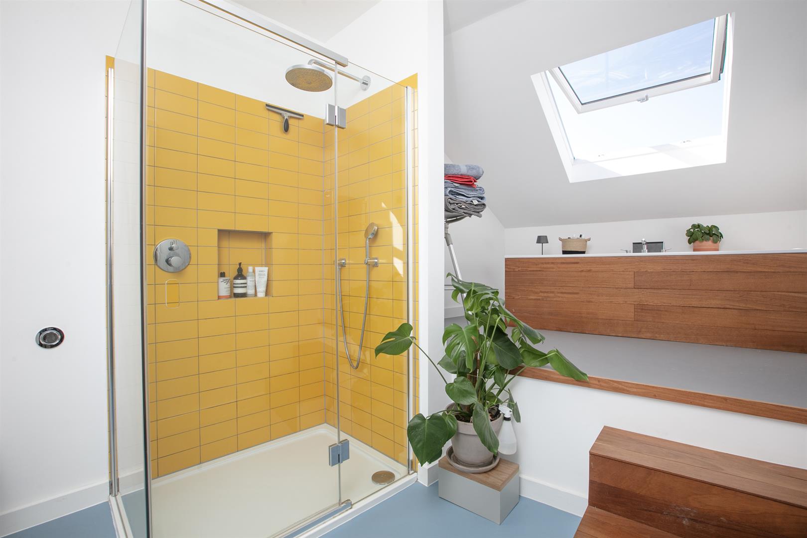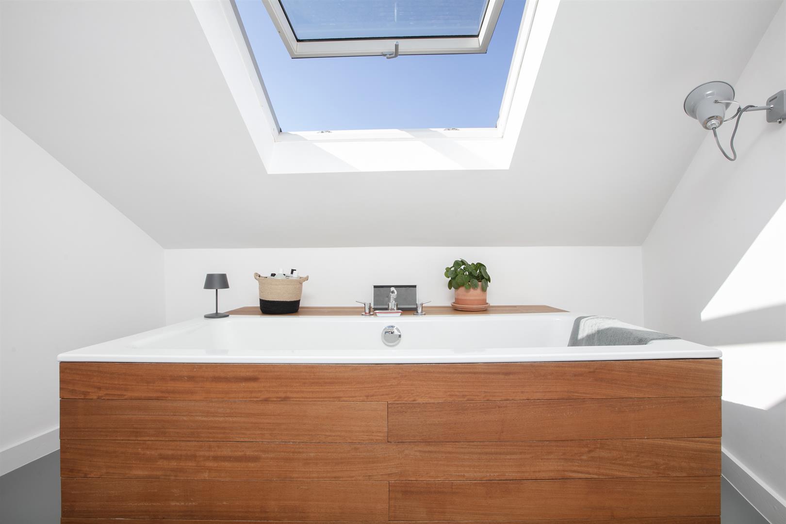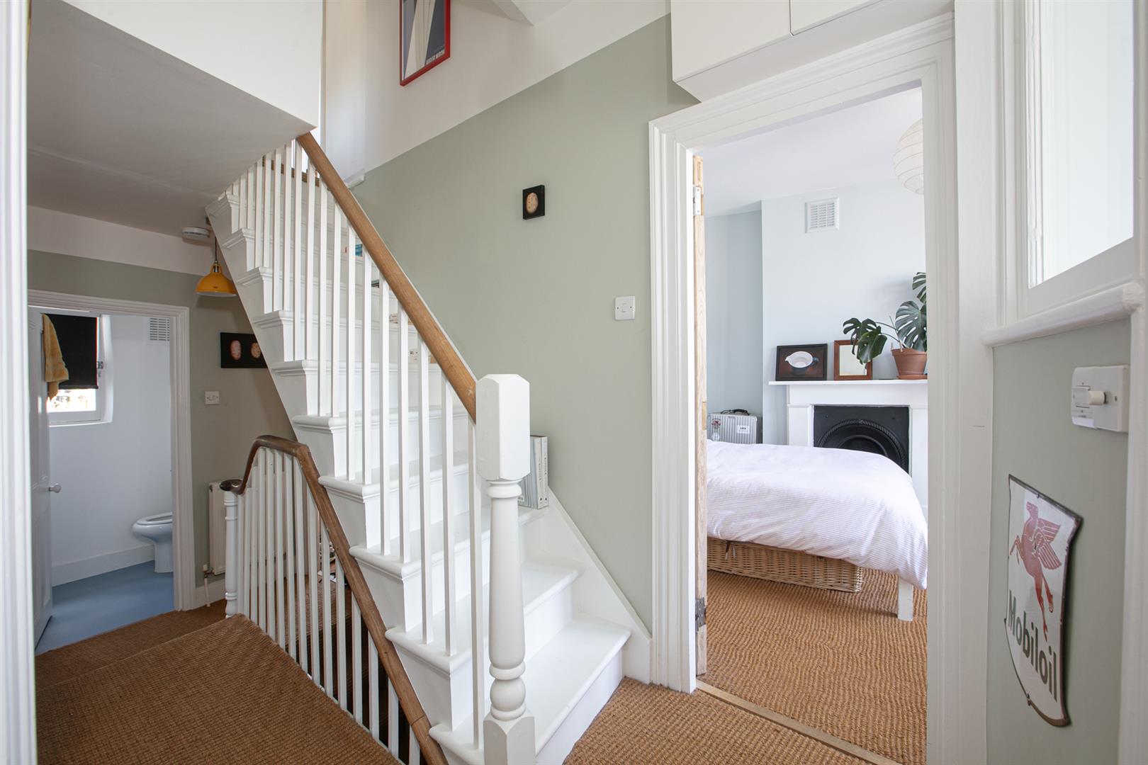 The staircase has been painted white and has a lovely solid wooden handrail. Your upper landing enjoys Sisal flooring and a large rear-facing casement with integrated internal blinds. To the right sits a split level, dual aspect bathroom with magnificent double walk-in shower, trough-style wash hand basin, wall mounted loo and flush recessed storage for the lotions and potions. A large rear-facing picture window supplies lovely leafy views. The wood-panneled bath is raised up two steps under a large Velux which supplies sweeping views as far as the London Eye. It's a great spot for a soak under the stars! Blue flooring and excellent yellow shower tiles finish the space perfectly. Across from this is the split-level master bedroom with that utterly impressive Juliette balcony. The bi-fold glass doors open full width for maximum airiness. Two further Velux on the raised sleeping platform adds to the charm. There's plenty of fitted and eaves storage.