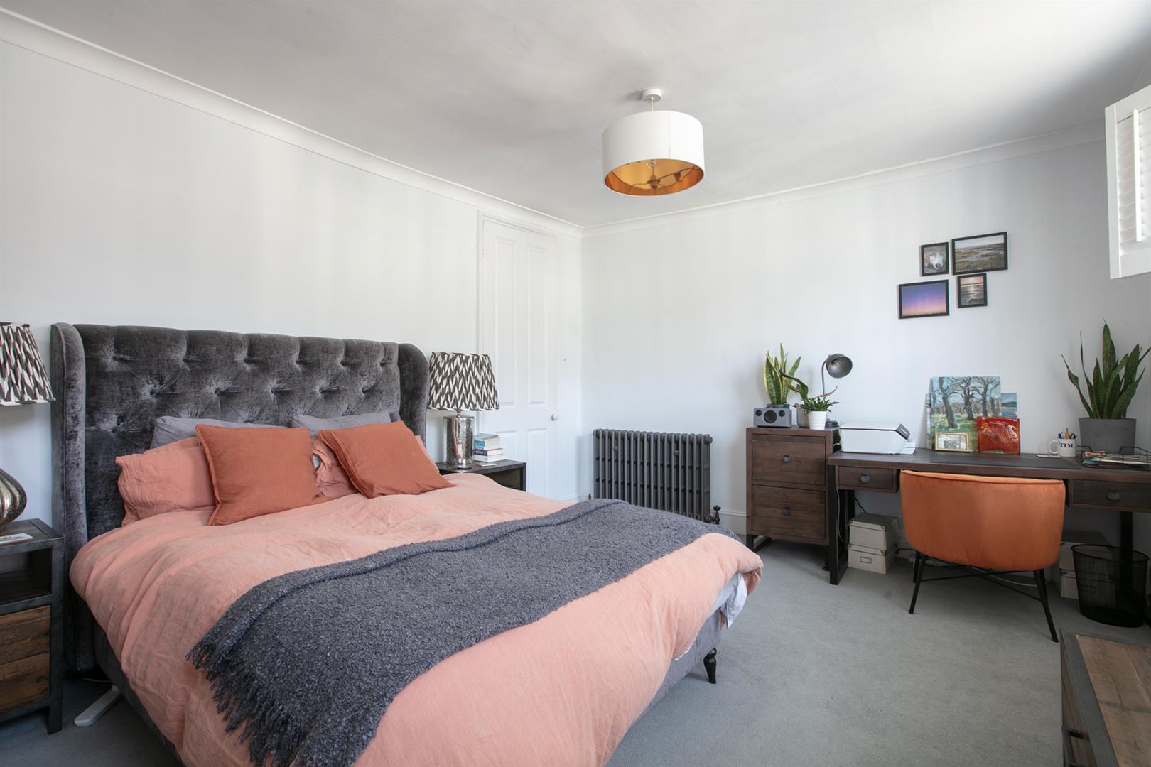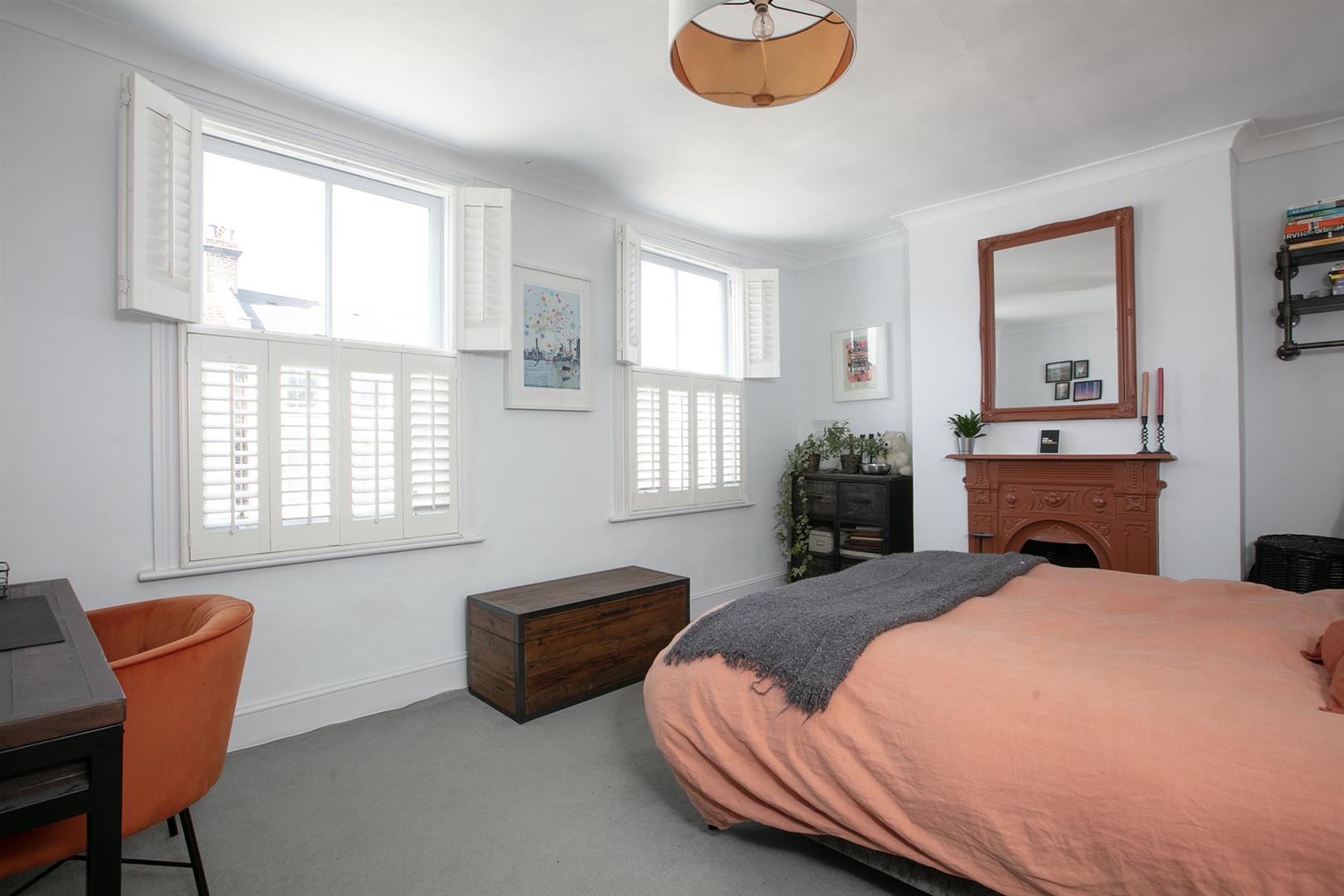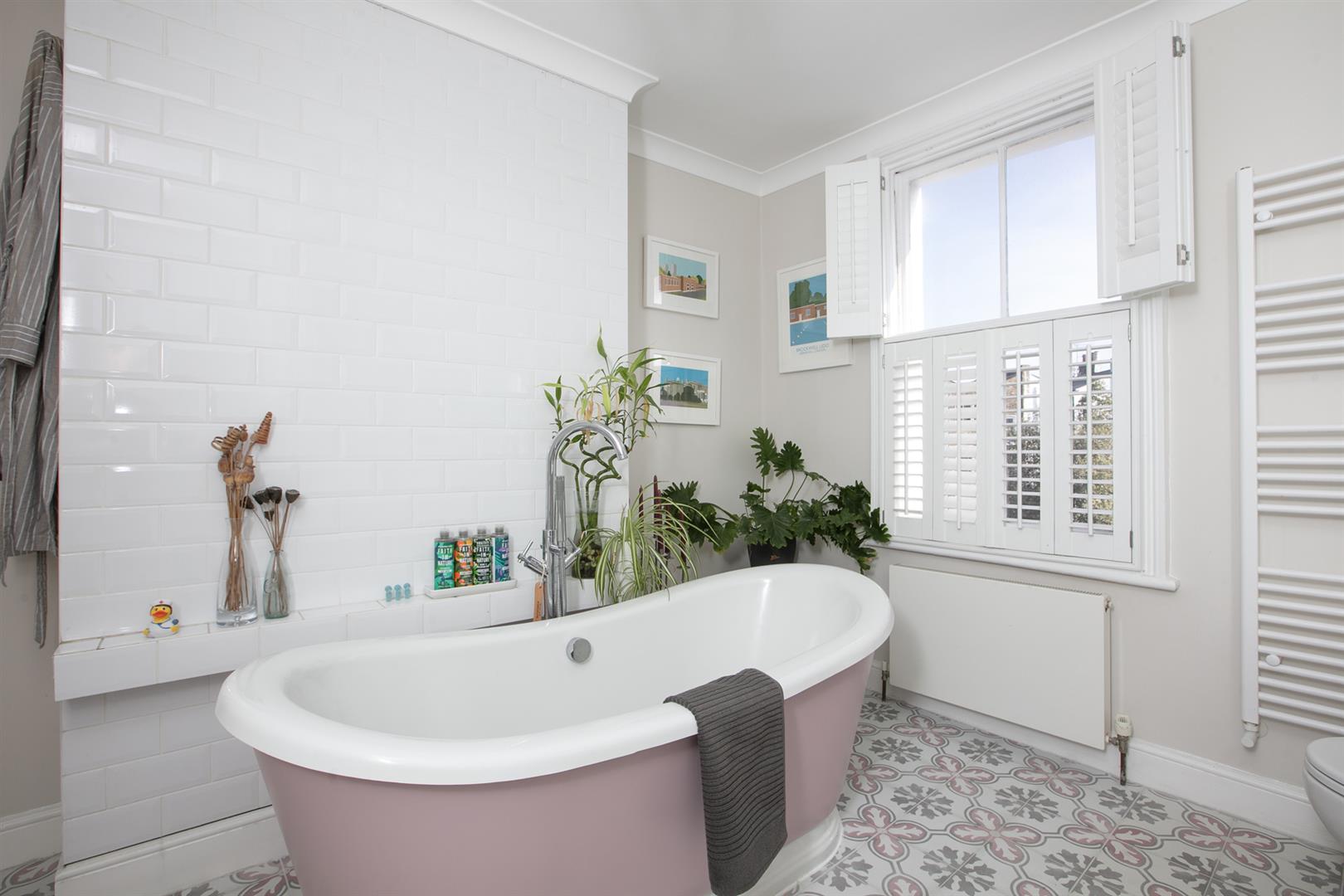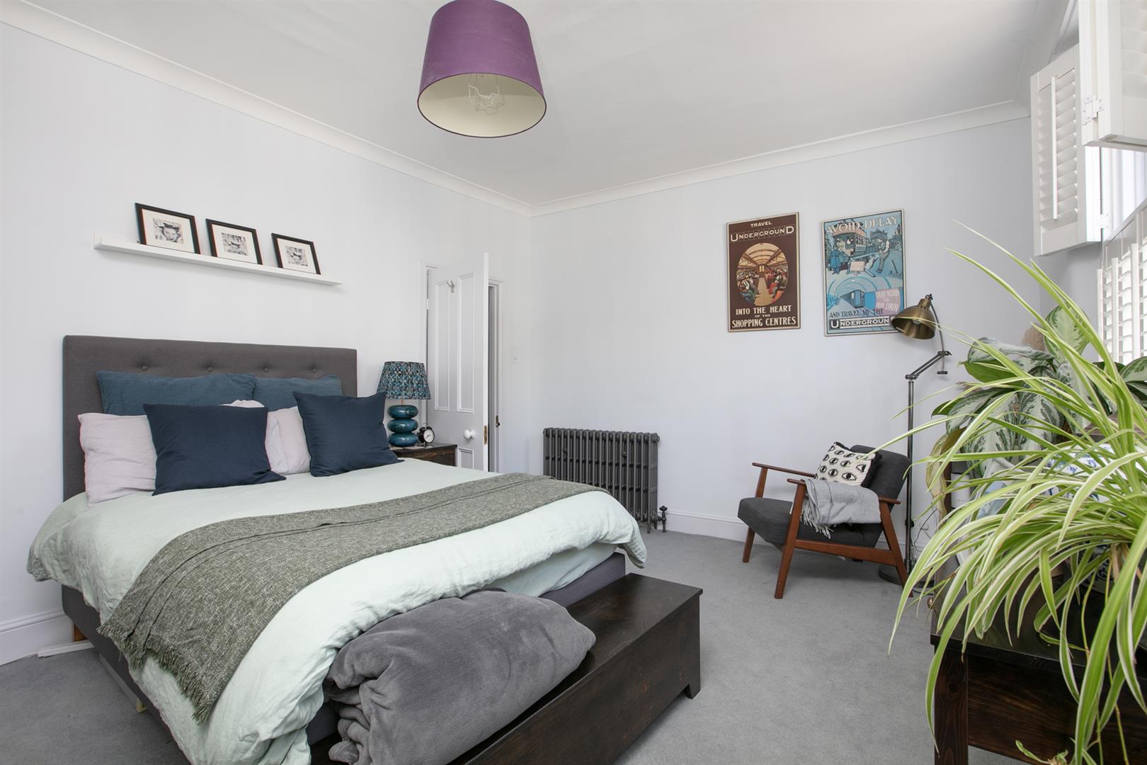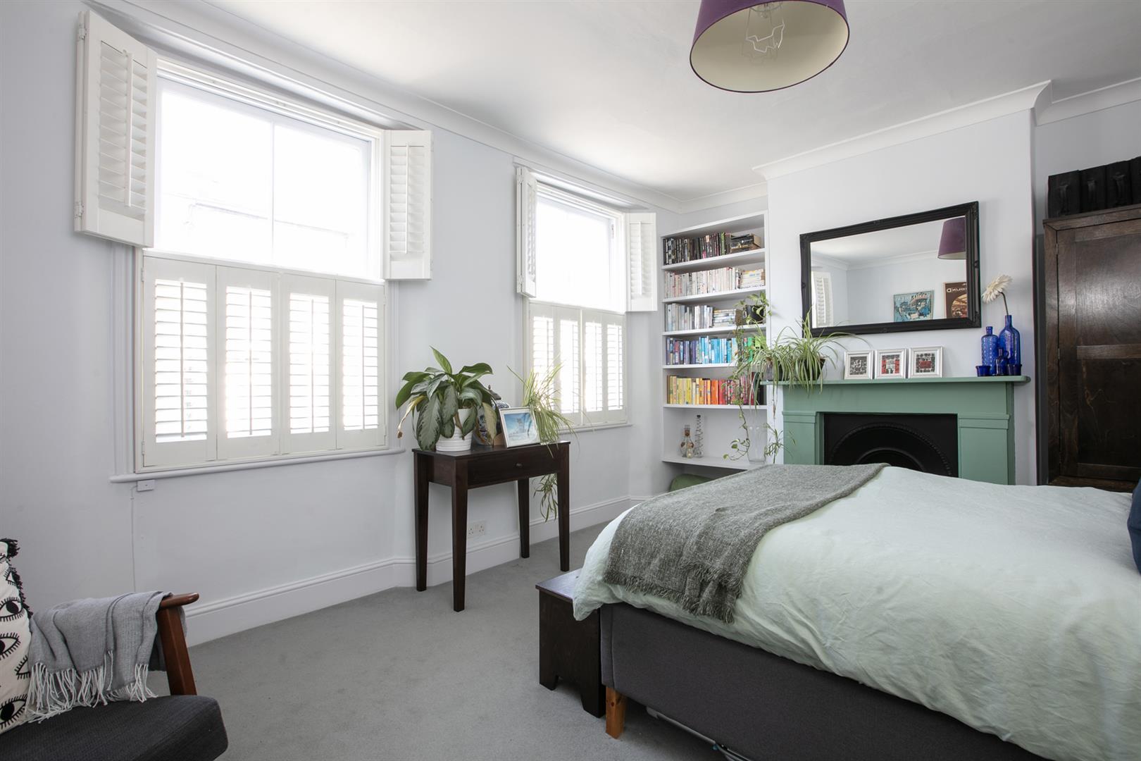 The second floor landing is carpeted and bright with a rear facing sash window and tonnes of hanging space for your works of art. Another gorgeous wide and airy double bedroom fronts the street through two sash windows with more plantation shutters. There's a pretty feature fireplace, simple coving and school house radiator. A fantastic family sized bathroom with roll top, contemporary suite and wall of fitted storage completes the tour.