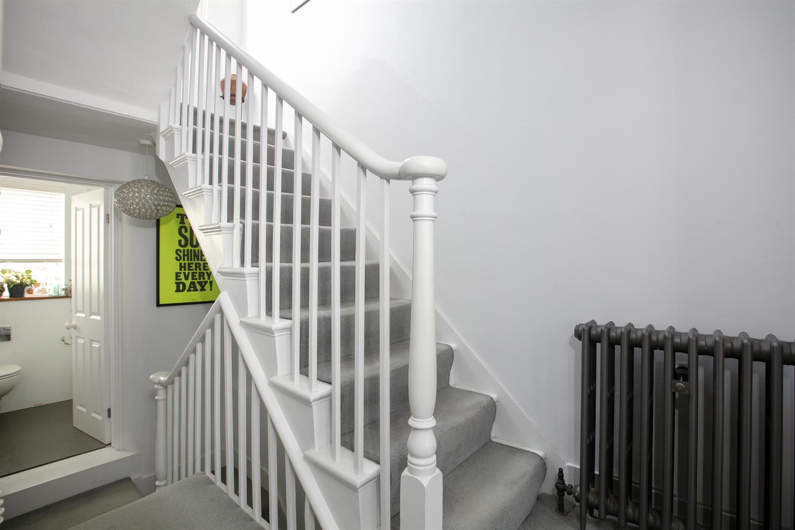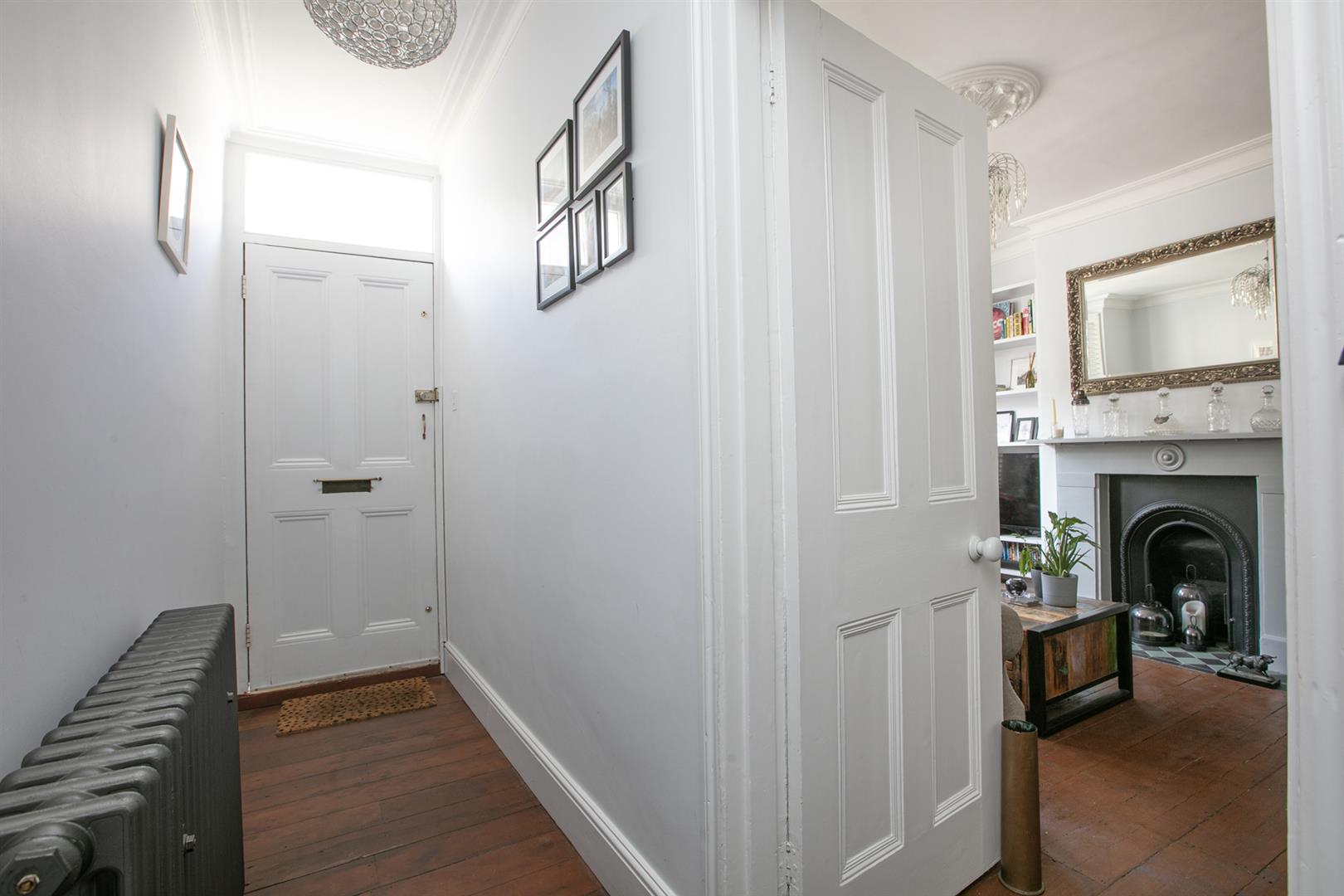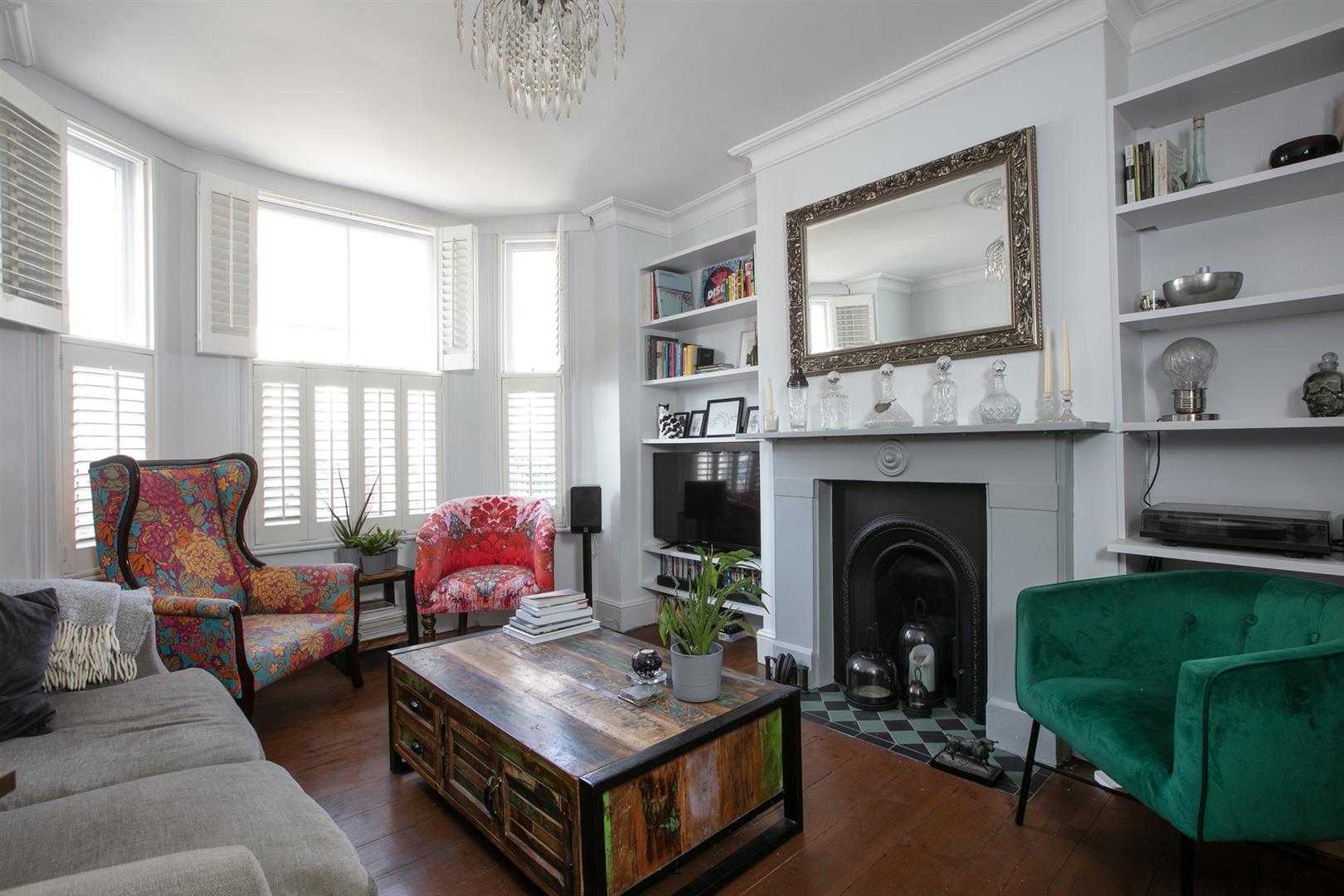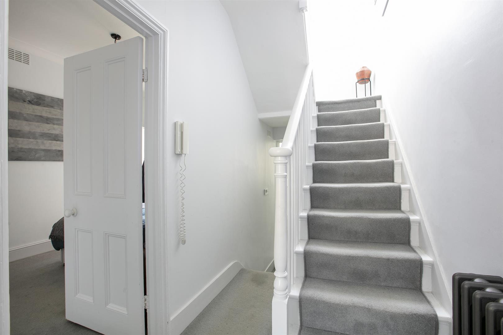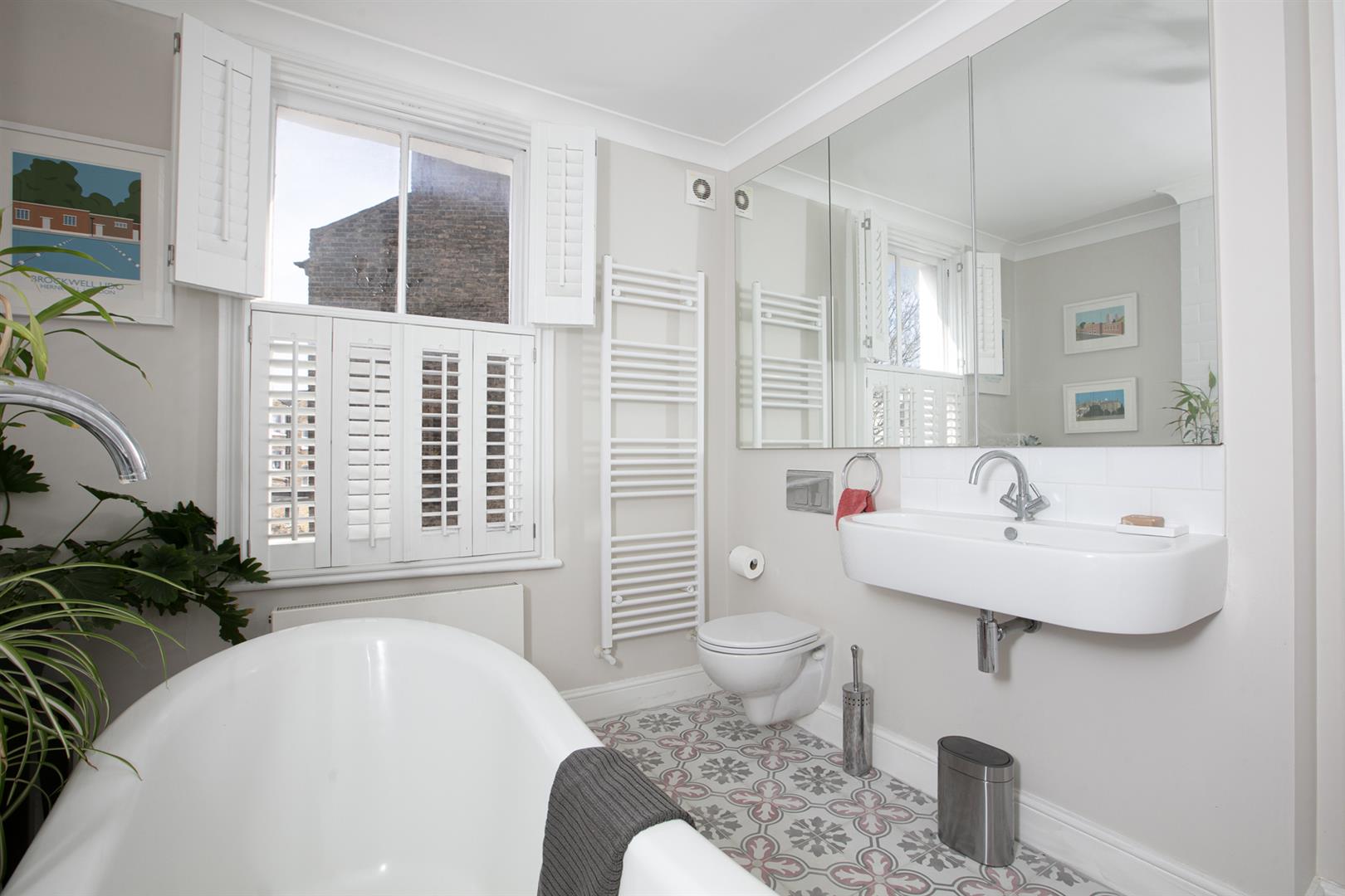The second floor landing is carpeted and bright with a rear facing sash window and tonnes of hanging space for your works of art. Another gorgeous wide and airy double bedroom fronts the street through two sash windows with more plantation shutters. There's a pretty feature fireplace, simple coving and school house radiator. A fantastic family sized bathroom with roll top, contemporary suite and wall of fitted storage completes the tour.