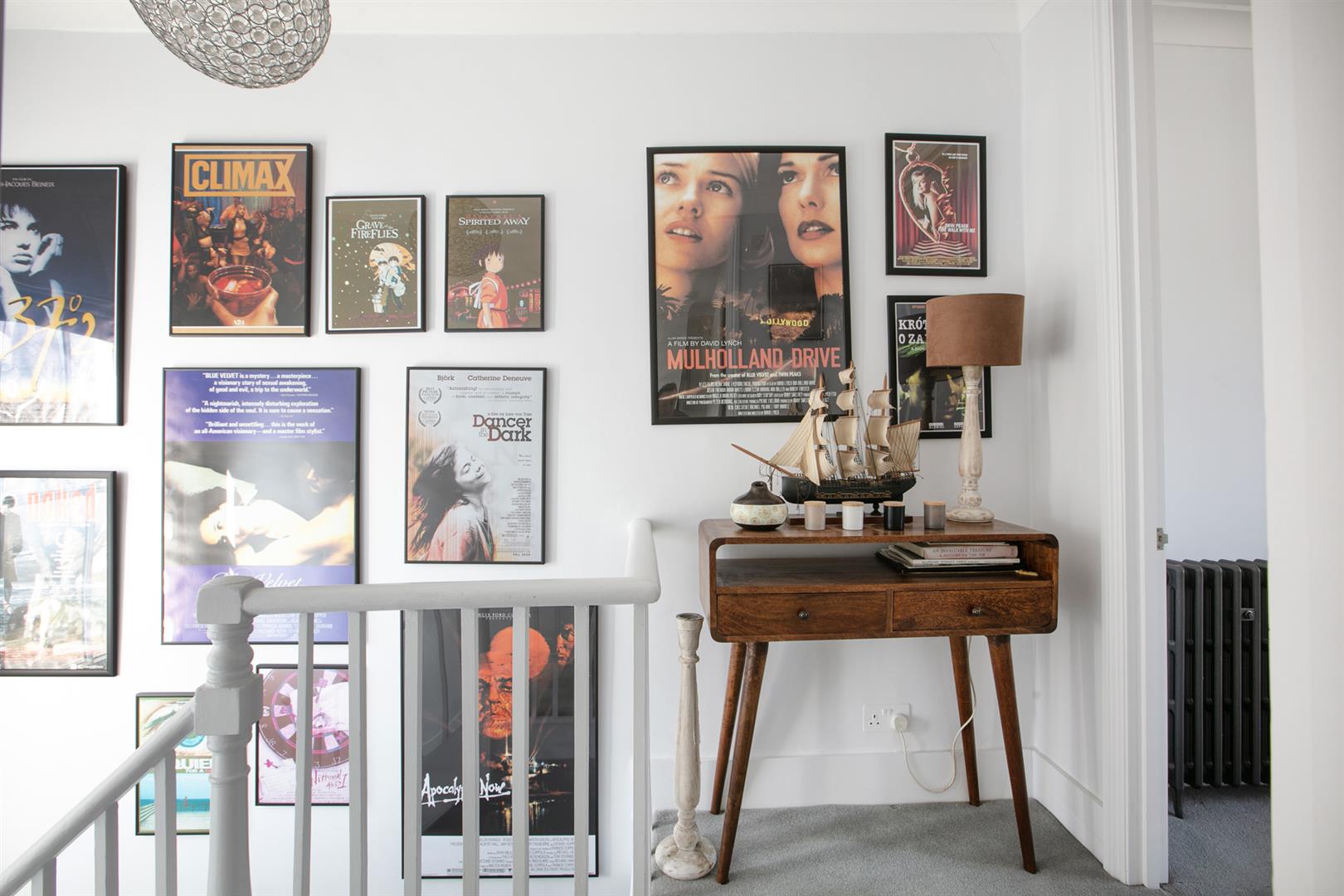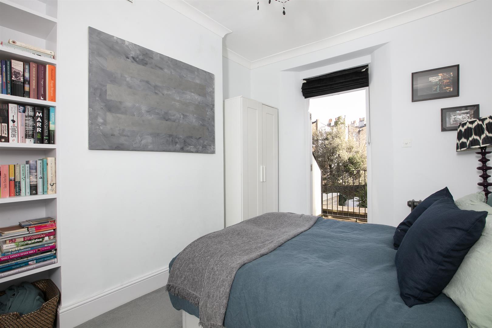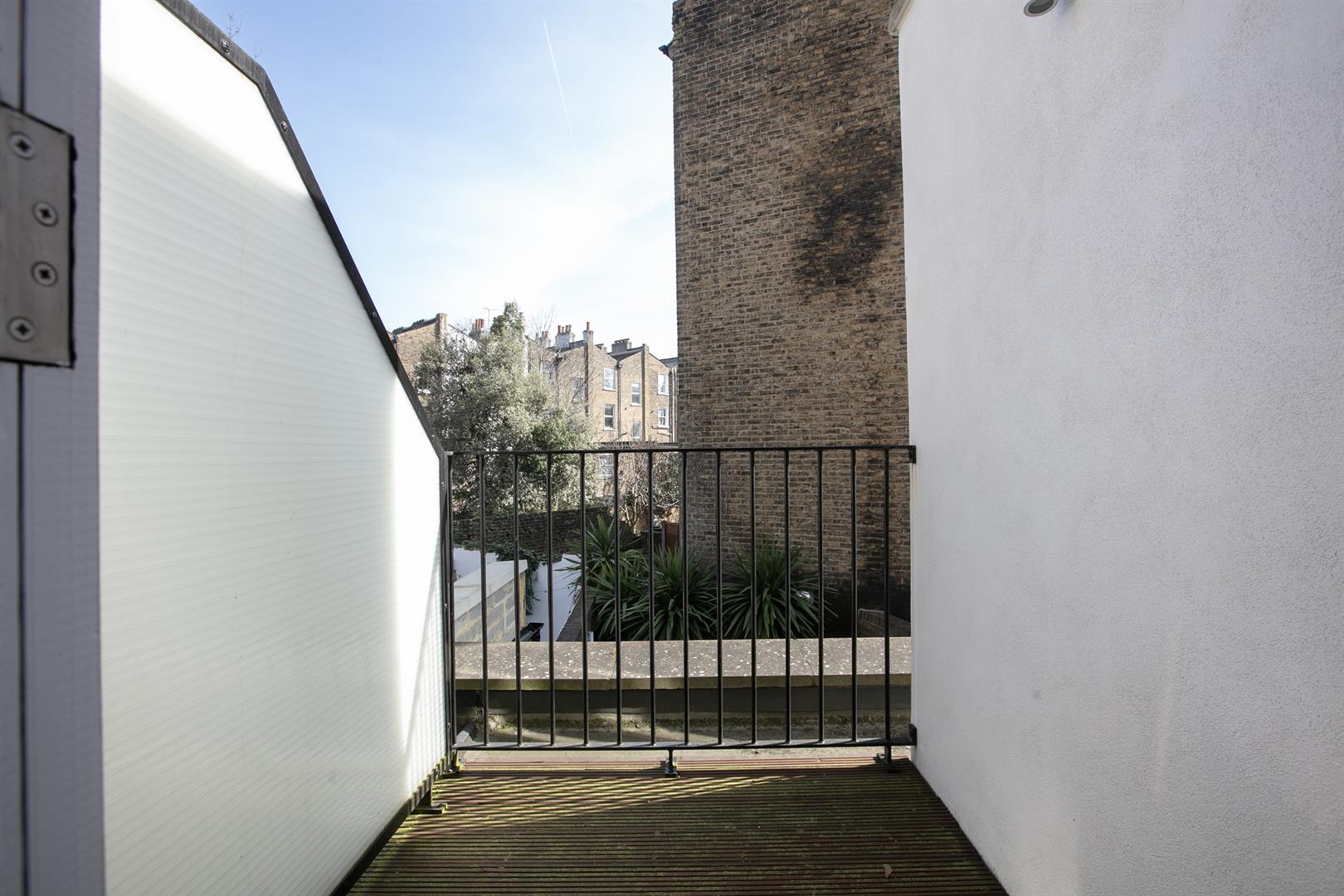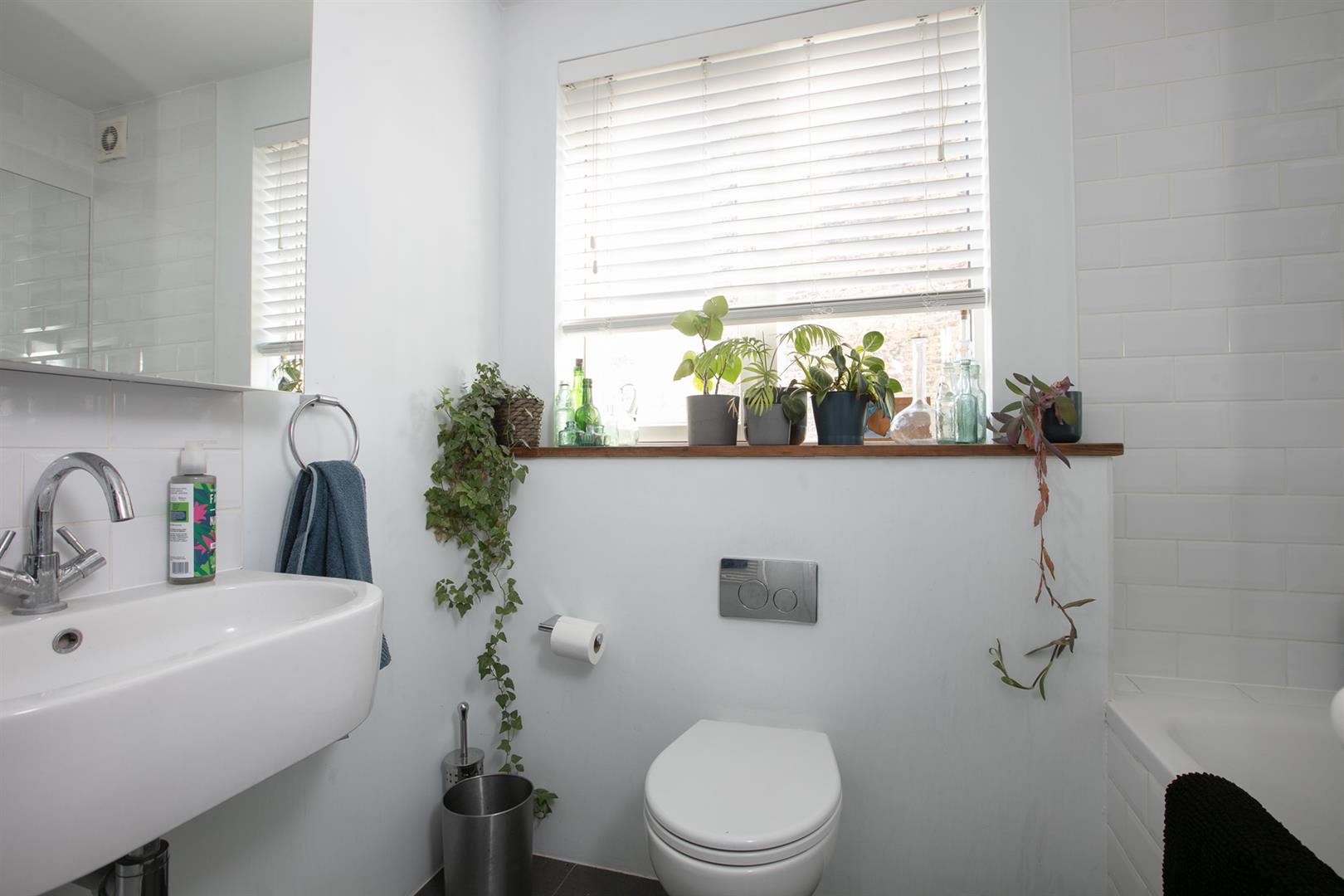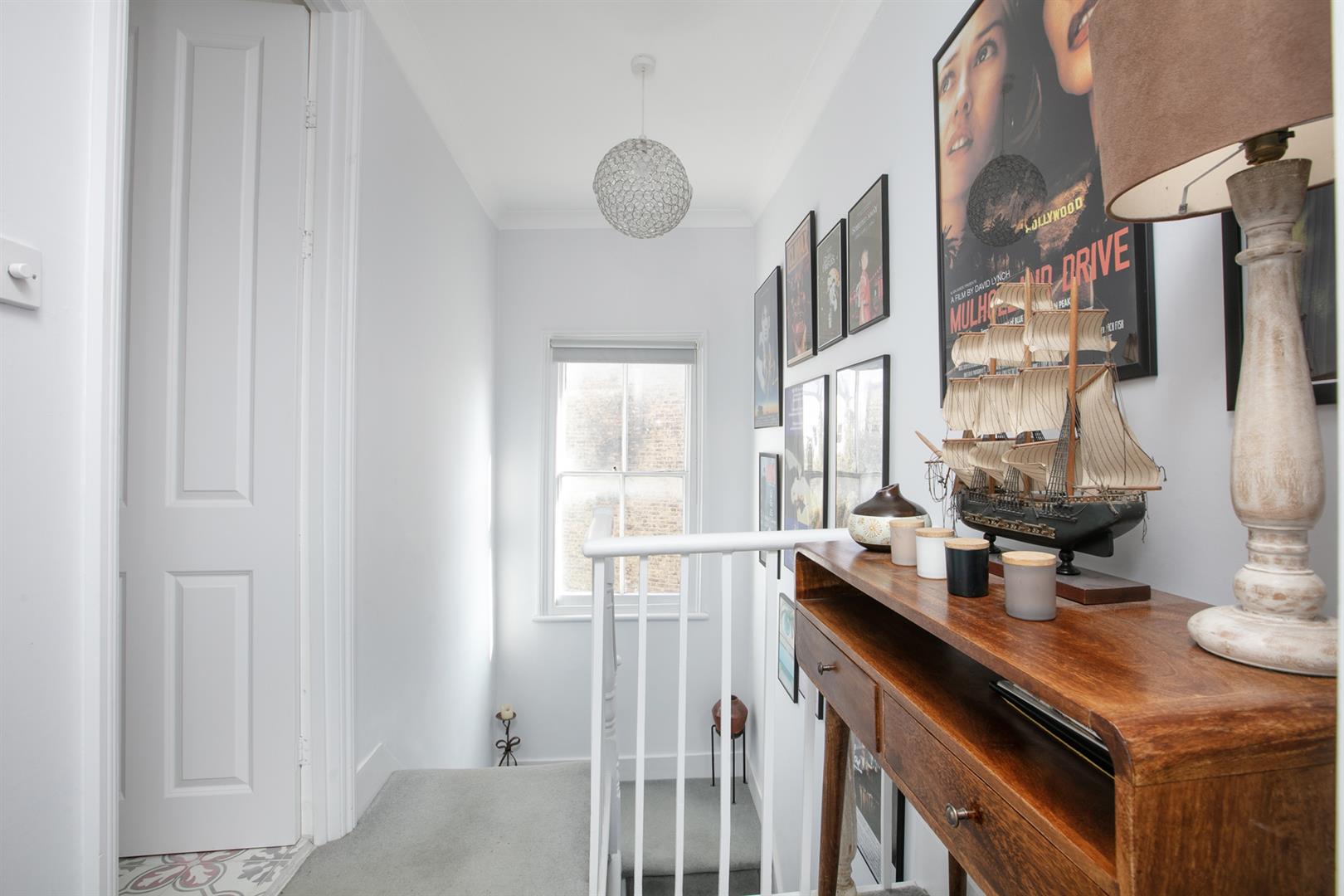 The second floor landing is carpeted and bright with a rear facing sash window and tonnes of hanging space for your works of art. Another gorgeous wide and airy double bedroom fronts the street through two sash windows with more plantation shutters. There's a pretty feature fireplace, simple coving and school house radiator. A fantastic family sized bathroom with roll top, contemporary suite and wall of fitted storage completes the tour.