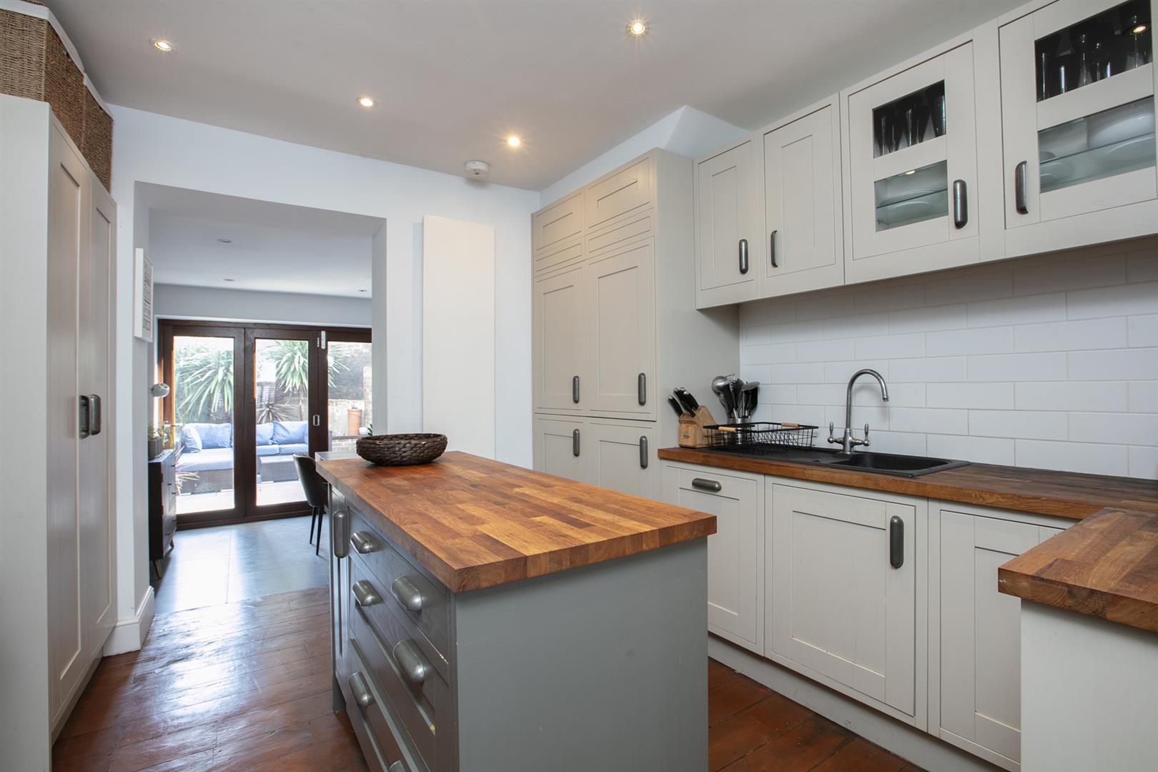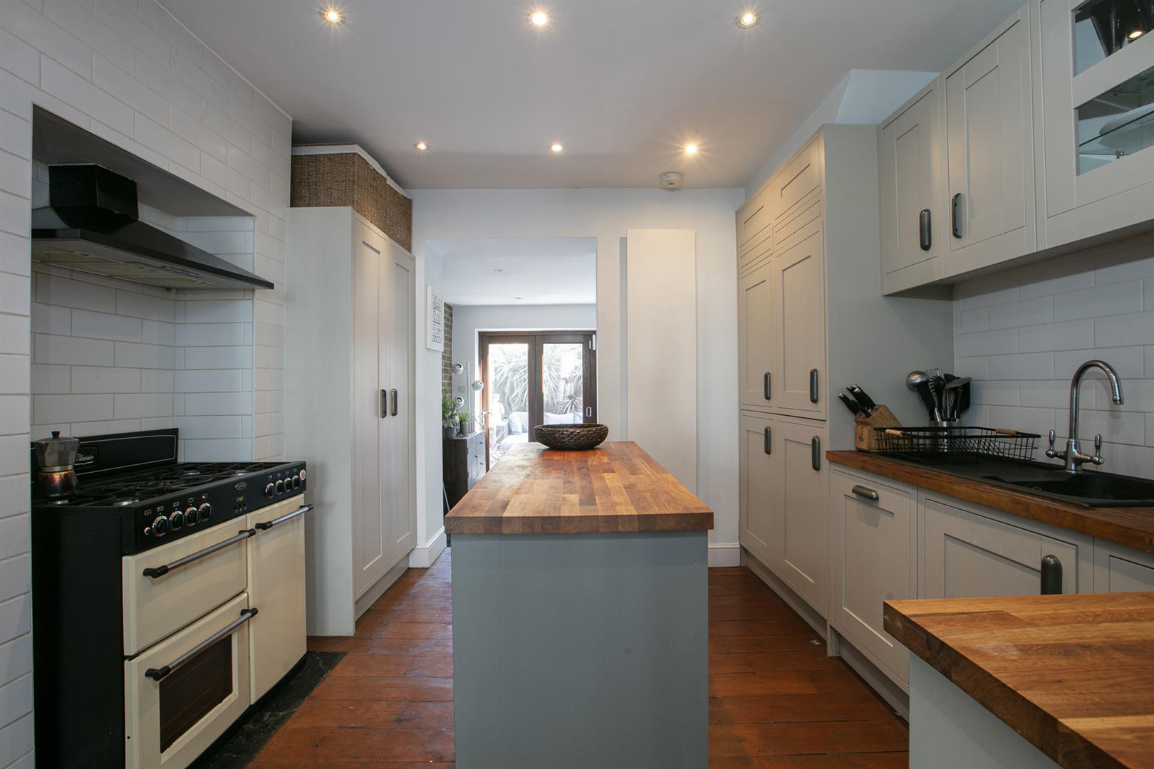 Upward to the first floor you find the first of your noticeably generous double bedrooms stretching to the full width of the property with two double glazed sash windows each enjoying blinds on upper and lower panes. There's a handsome period feature fireplace with fitting mantel. Bedroom two is a nicely sized double with French doors leading to a decked terrace. A handy bathroom with underfloor heating sits on the return.
