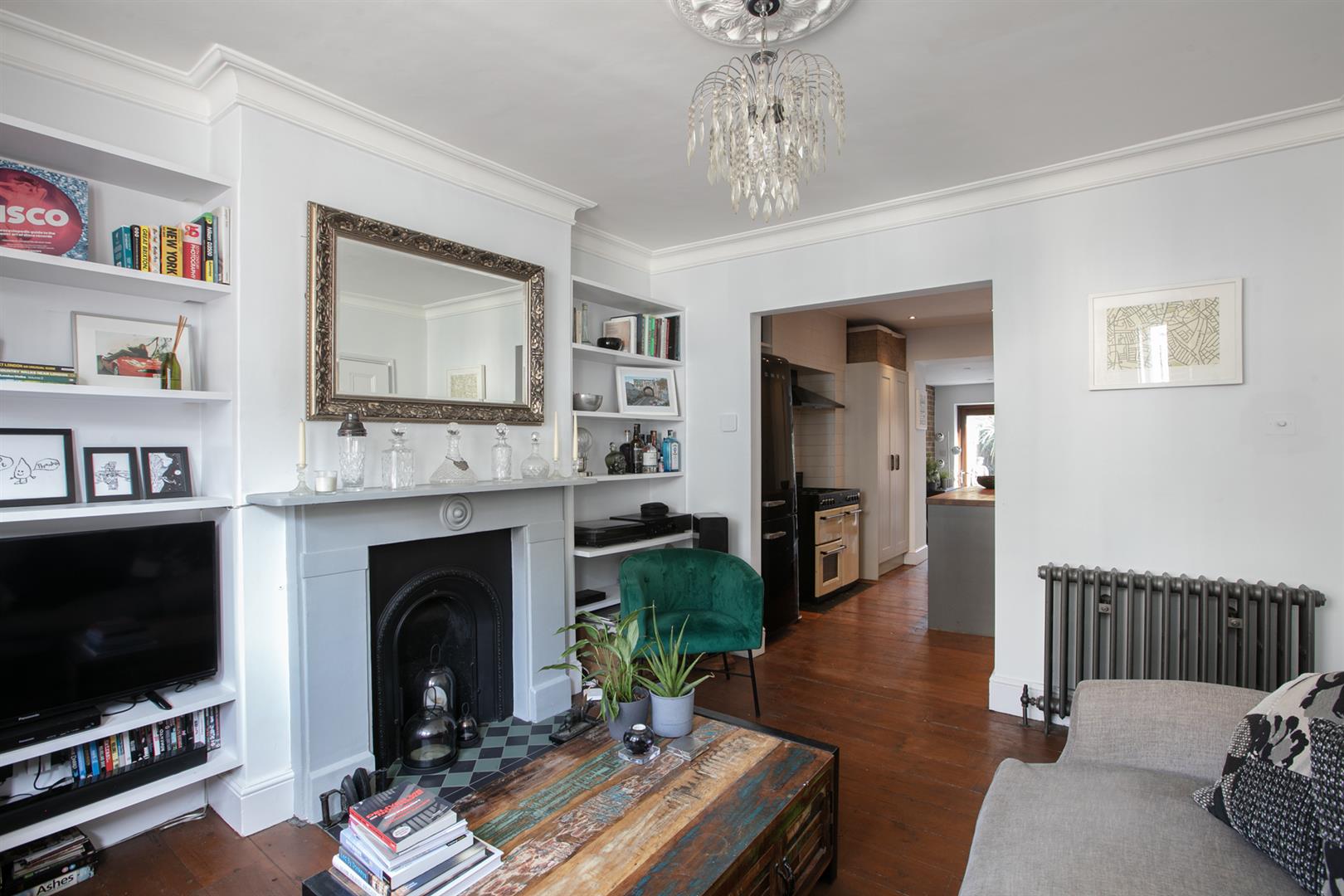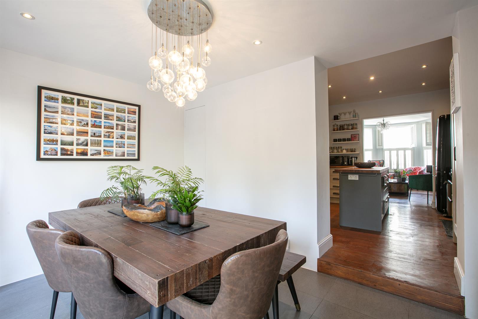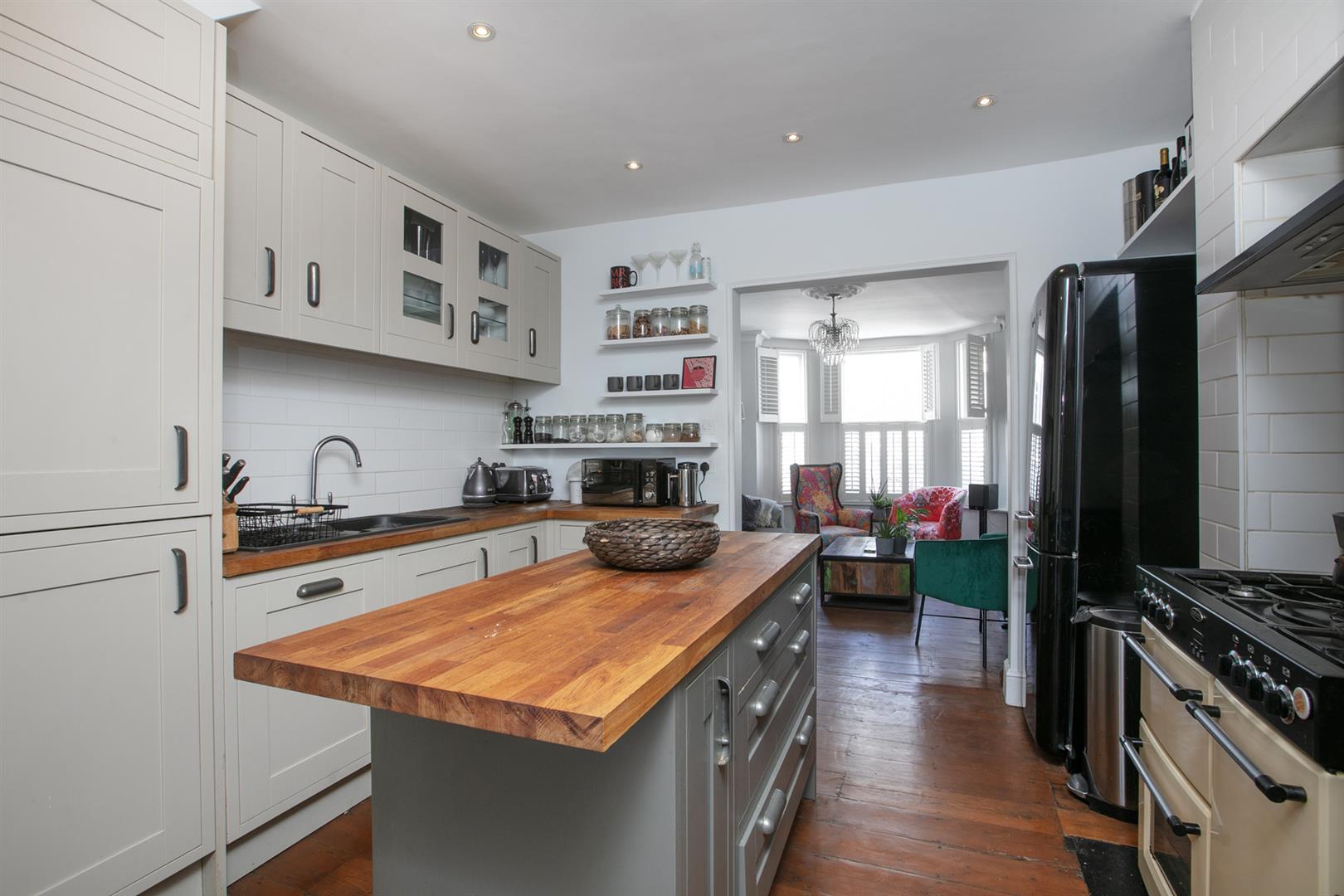 The hall is tastefully presented with stained original timber floors and crisp white walls. Simple coving and original corbels are also painted white. To the left is the fantastic living room which runs open-plan the full depth of the ground floor. The lounge enjoys the wide front aspect bay window and a stunning period feature fireplace with tiled hearth. This is flanked on either side by fitted shelving. A well stocked contemporary kitchen adjoins to the rear boasting solid oak counters, shaker style cabinets and integrated appliances including dishwasher and fridge/freezer. A gorgeous five ring gas range will help you cook up a serious storm. Adjoining the kitchen is a magnificent full-width dining/conservatory which opens, via quad-fold glass doors to your paved patio garden. Underfloor heating in this area ensures a cosy vibe whatever the weather.