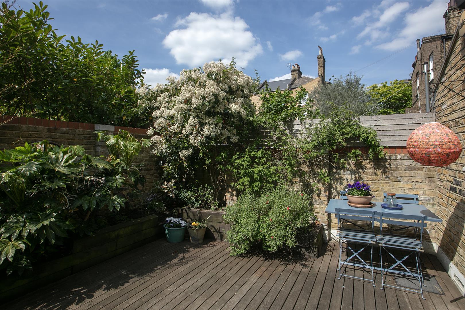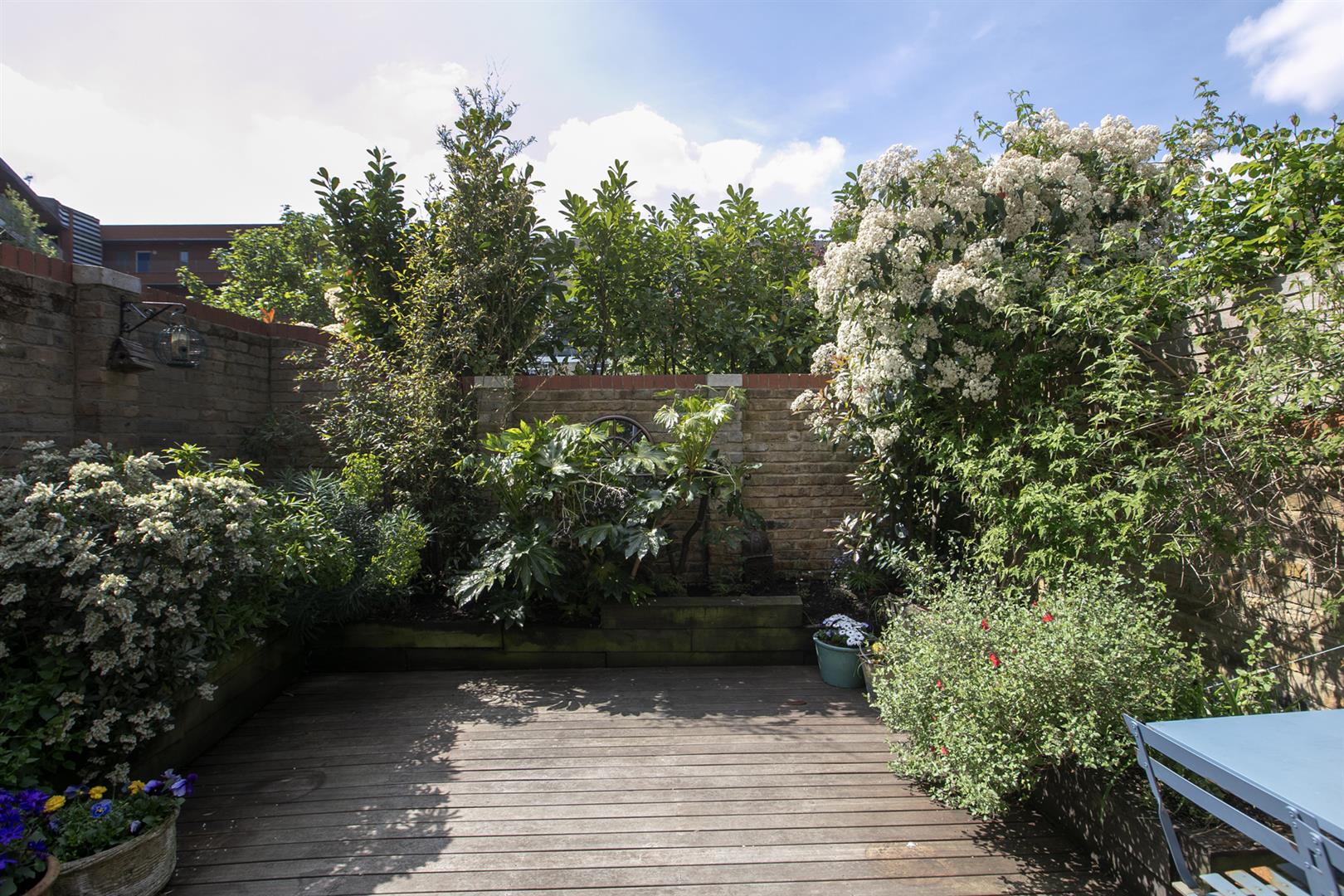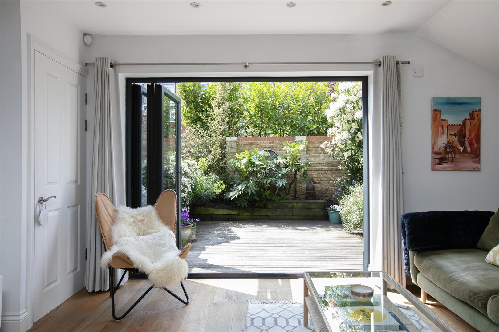 The living area greets you with a long run of solid oak worktops and plenty of storage. Appliances include a four ring induction hob, oven, integrated dishwasher and fridge/freezer. The dining space sits over by the access to your first patio space. Original BTC light fittings are installed above the current dining table. Toward the end of the living area the space widens to accommodate a magically bright and airy lounging space. Bi-fold doors open to the main garden which is awash with mature flora and shrubs. It's a sunny pleasant space for al-fresco dining and chilling out. The rear outside space enjoys that nifty irrigation system and both benefit from beautiful Ipe hardwood decking.