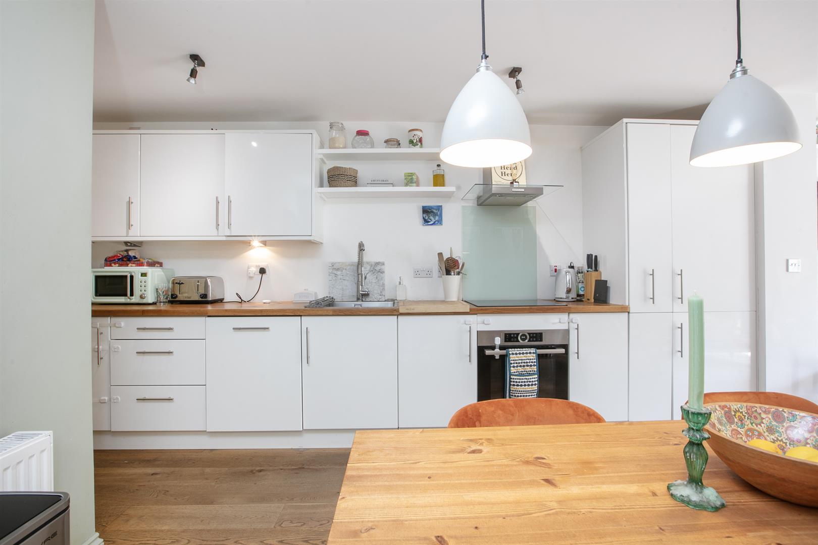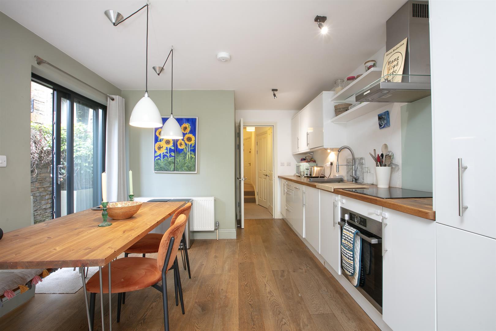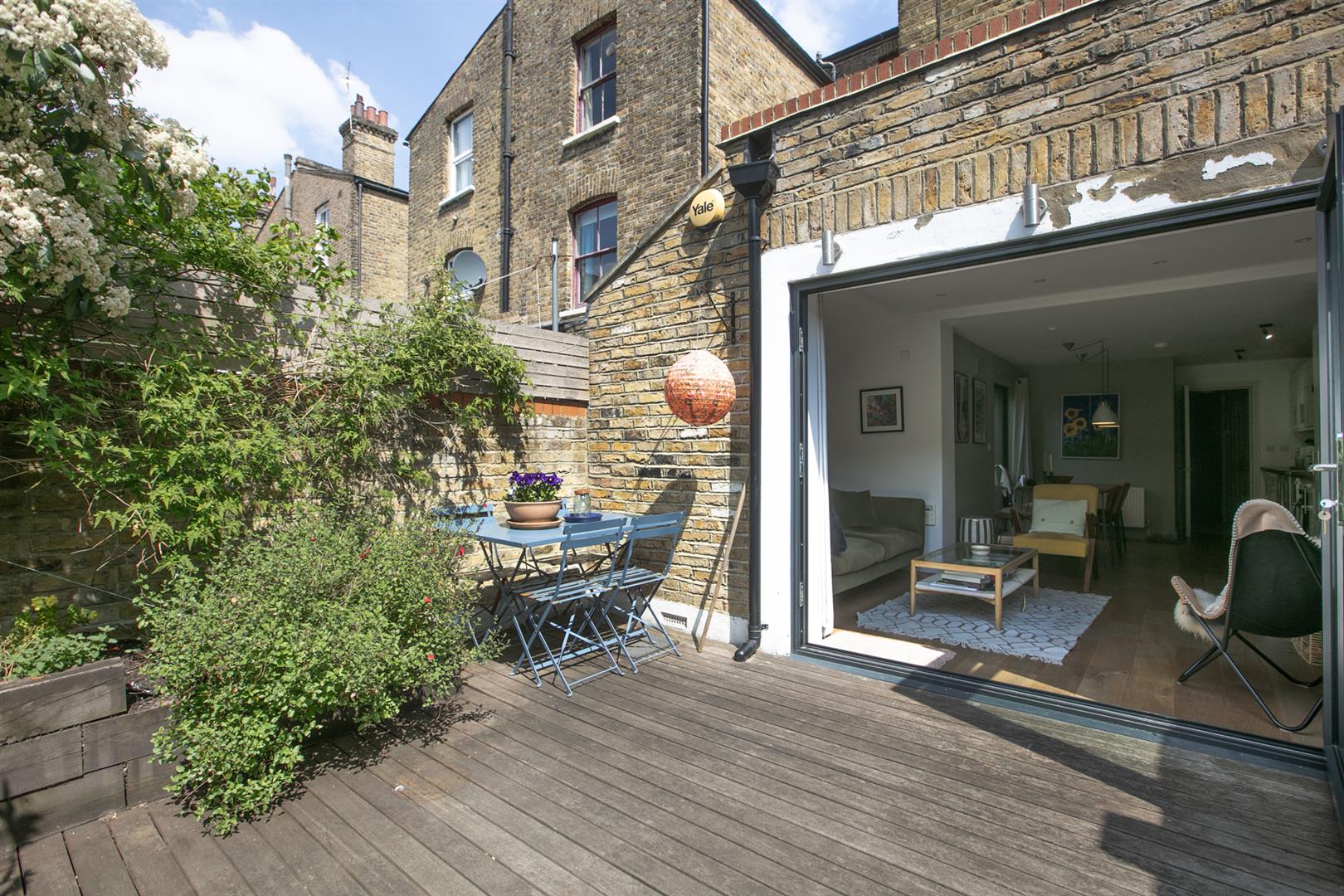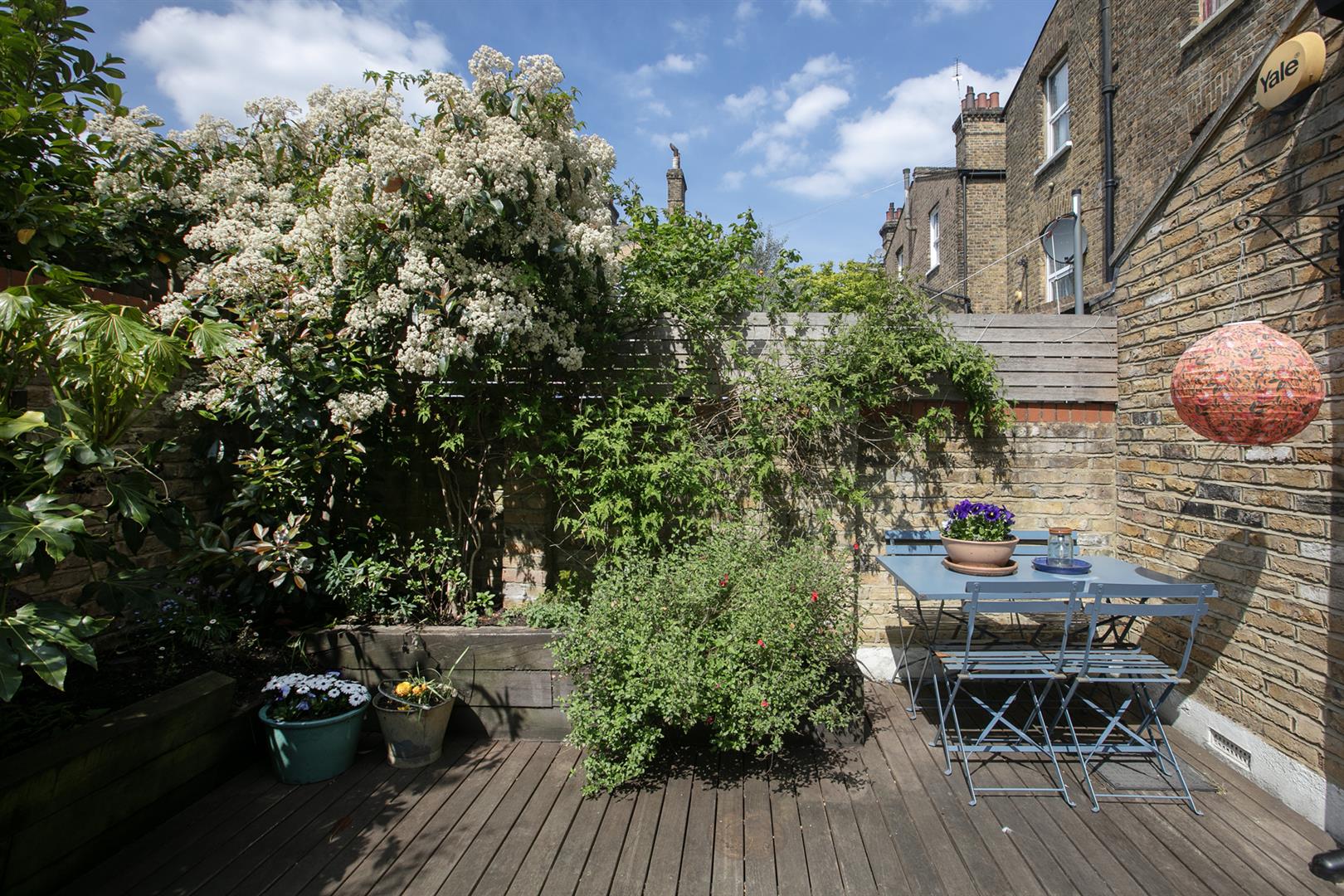 The living area greets you with a long run of solid oak worktops and plenty of storage. Appliances include a four ring induction hob, oven, integrated dishwasher and fridge/freezer. The dining space sits over by the access to your first patio space. Original BTC light fittings are installed above the current dining table. Toward the end of the living area the space widens to accommodate a magically bright and airy lounging space. Bi-fold doors open to the main garden which is awash with mature flora and shrubs. It's a sunny pleasant space for al-fresco dining and chilling out. The rear outside space enjoys that nifty irrigation system and both benefit from beautiful Ipe hardwood decking.