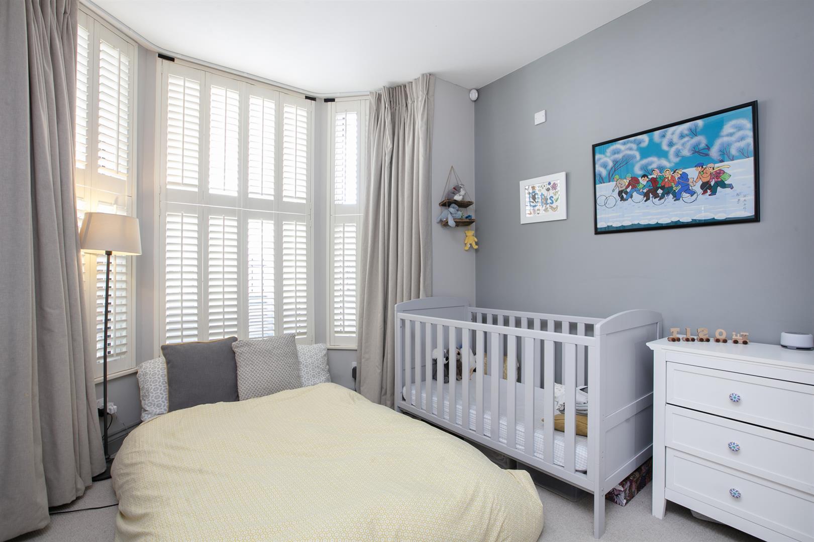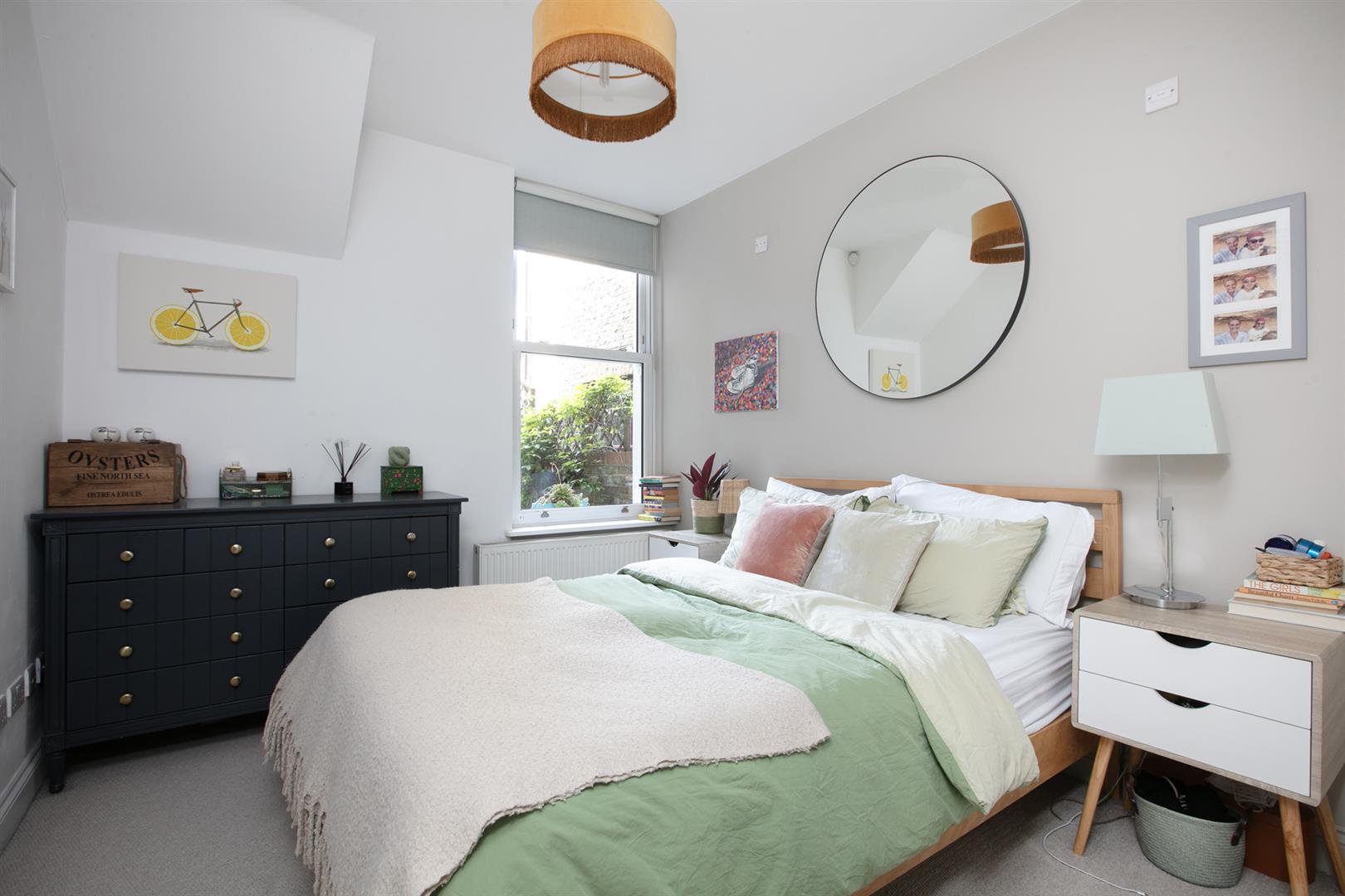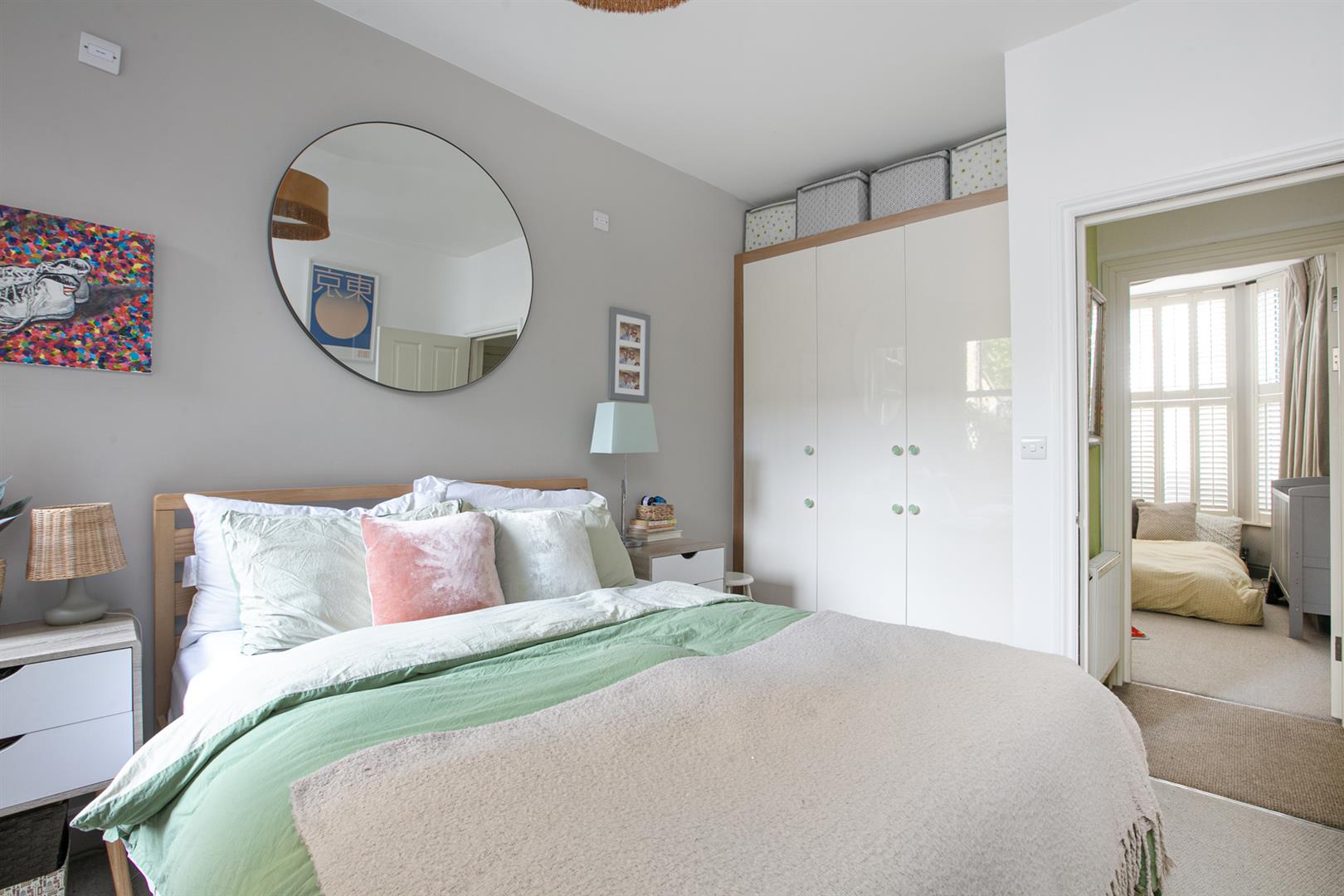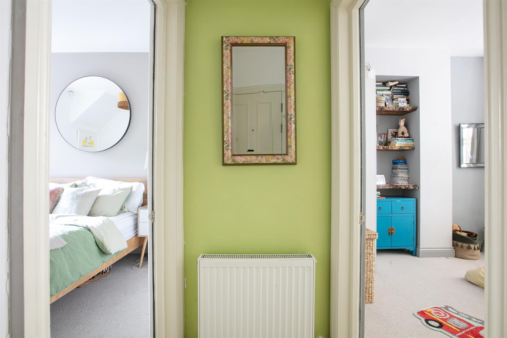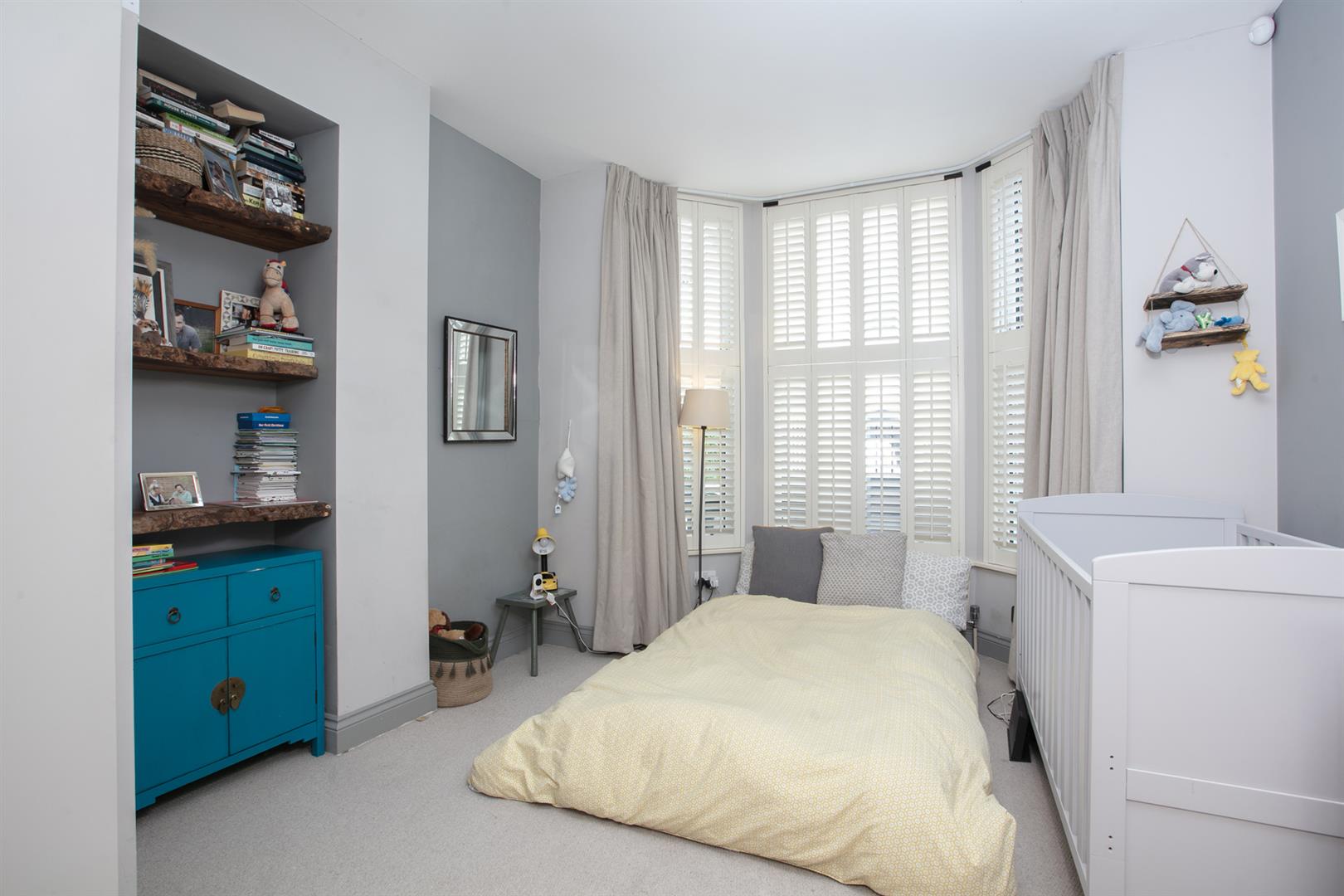 The exterior enjoys some handsome high railings and a shared front garden with communal bicycle storage (shared with the two other apartments). This leads inward to your ground floor hallway. The front aspect double bedroom is carpeted and has plantation shutters on both the upper and lower panes of the wide bay window. There's floor to ceiling fitted storage and elegant wall tones. Rustic shelving, reclaimed from the grounds of a Rolls Royce factory sit beautifully into the alcove.