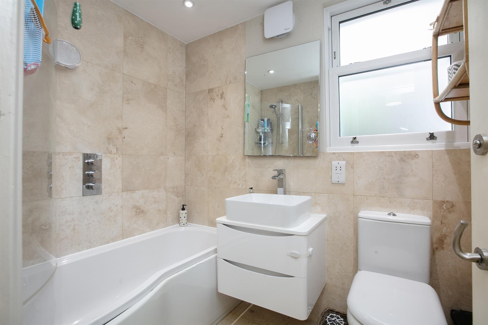 A second, even larger double bedroom comes next along the hall with fully fitted recessed wardrobes and views over the first of your two patio gardens. Continuing down the carpeted hall you find a fully plumbed utility cupboard opposite a fancy stone-tiled bathroom. There's a white suite, tear-drop bath and heated towel rail. A Nest learning thermostat in the hall controls the central heating enabling connection to other 'smart' devices. The cellar, also accessed off the hall has electrical sockets and lighting and supplies an invaluable storage spot with built-in storage running all along the left side.