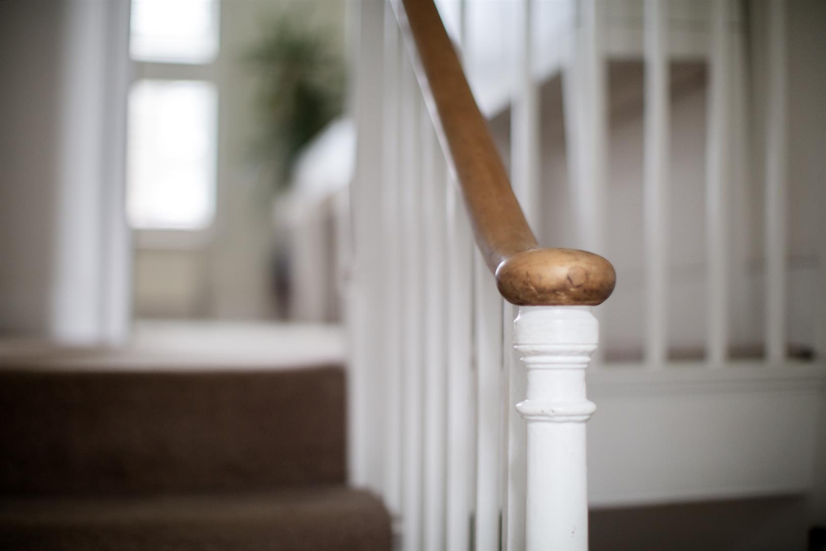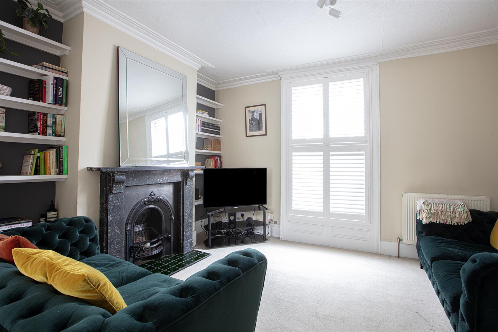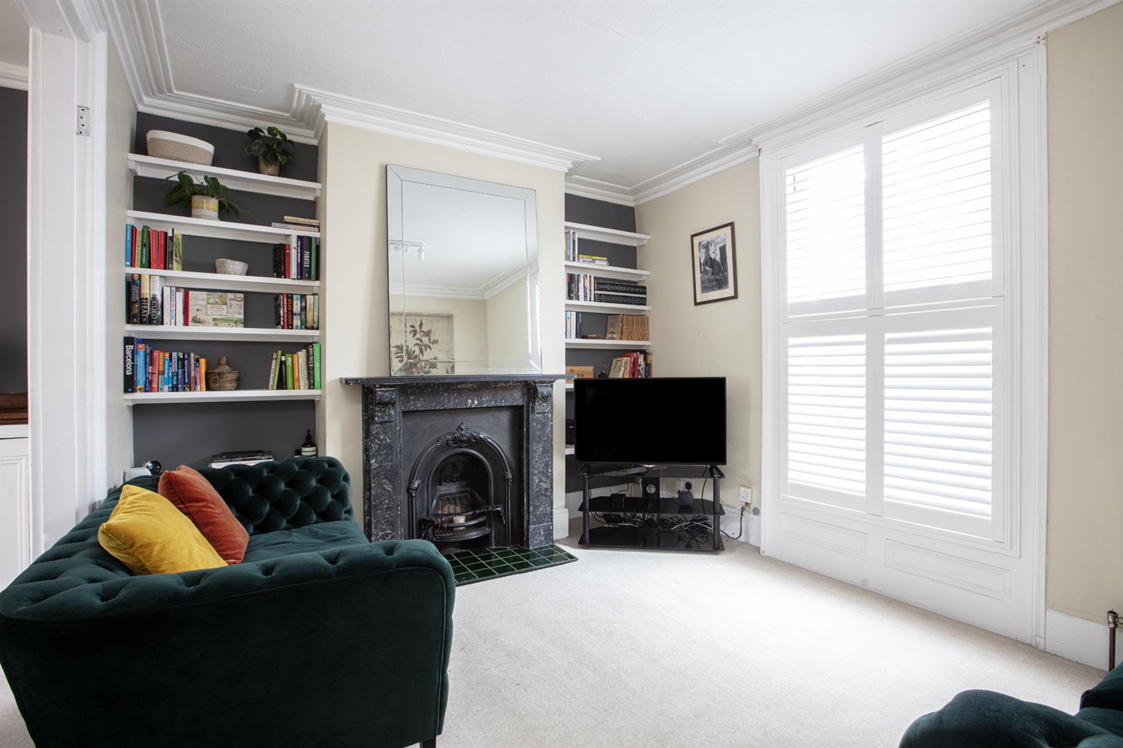 A handsome exterior sits behind period railings and invites you up a set of stairs to the original front door. The inner hall is carpeted and leads first to your double reception which sits to the right and enjoys an aspect to front and rear. Twin feature fireplaces, shelving and low level storage units add to original cornicing and modern louvered blinds for a tasteful finish. Upward bound you meet a bright, modern bathroom on the upper return. It enjoys a fresh white suite, tiling and grey wash hand basin. The top floor master bedroom fronts the street with an original feature fireplace, twin contemporary fitted storage and more louvered blinds. The final bedroom, another double, has more bespoke storage and a rear aspect sash window.