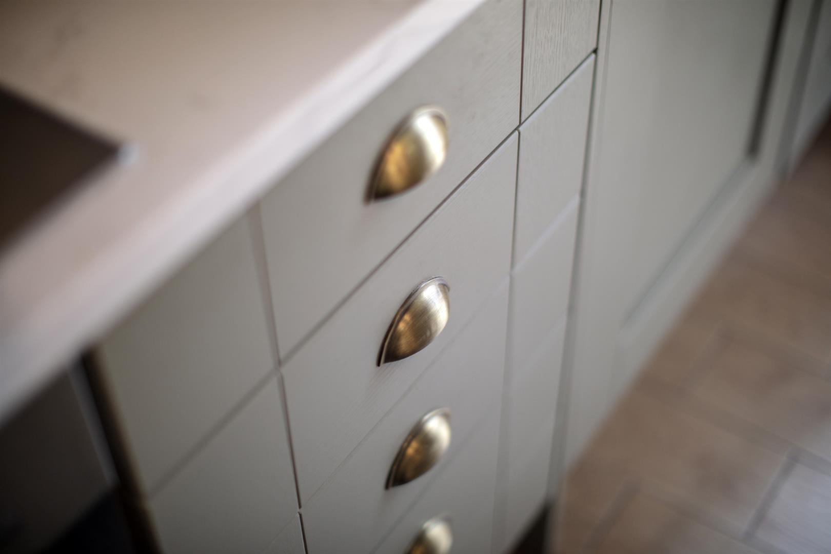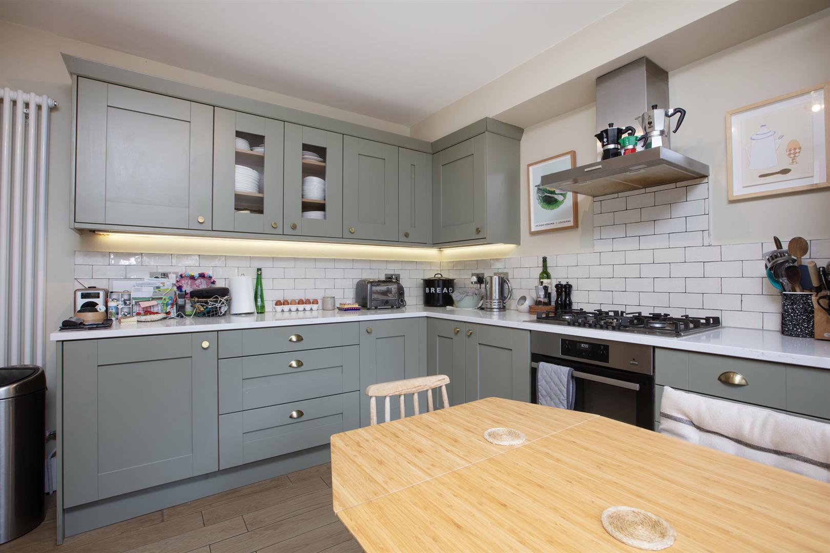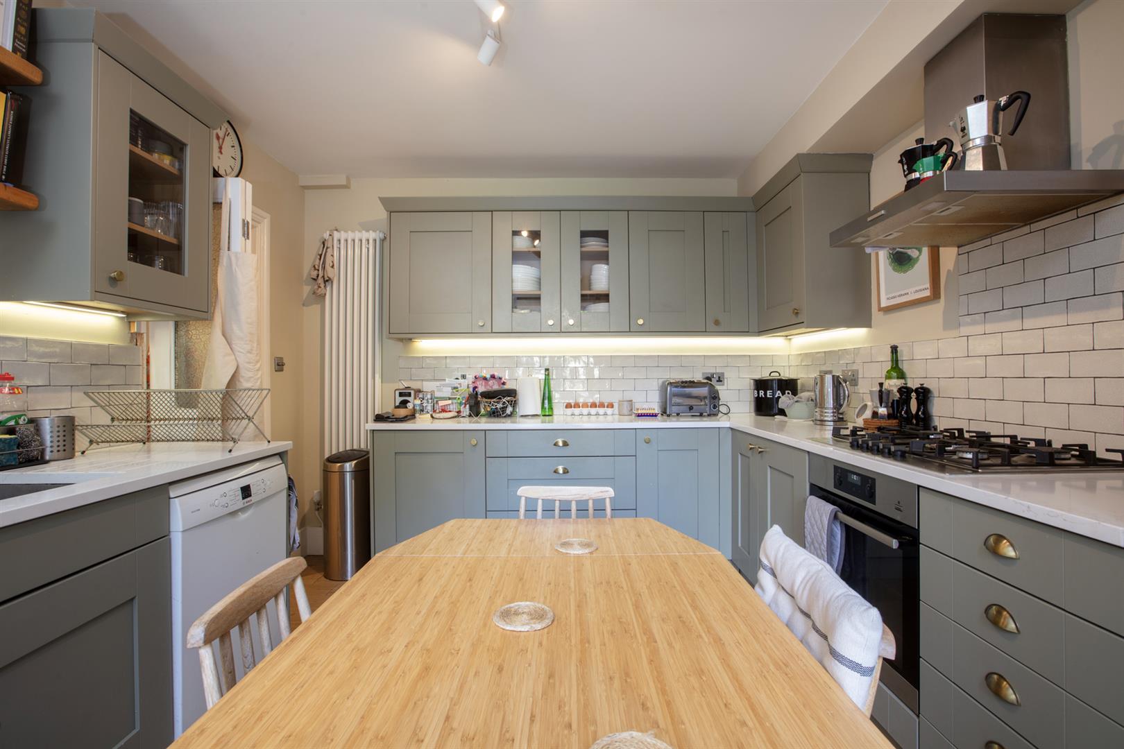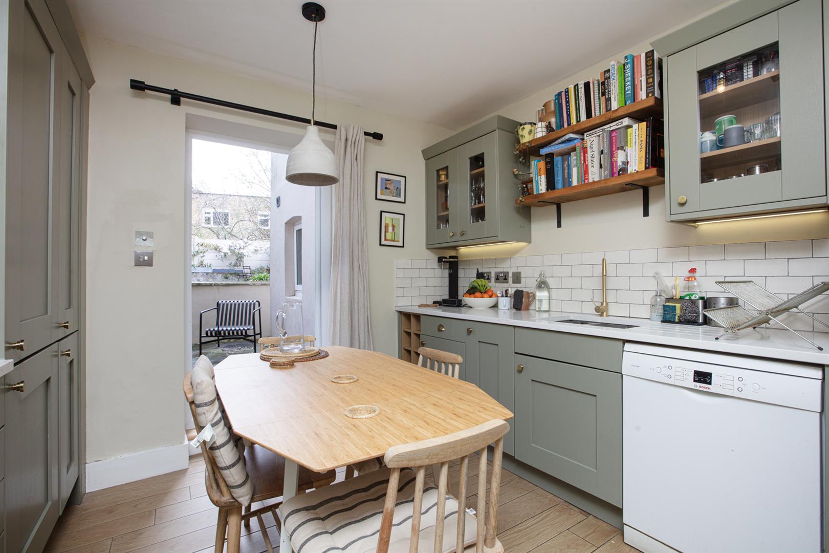 The exterior is tall and handsome with similarly attractive period houses to either side. The private entrance is on the lower ground floor. An inviting inner hall with recessed storage, tasteful neutral décor and original timber floors greets you. To the left you find a bright front facing reception with pretty feature fireplace, low level storage units, integrated shelving and louvered blinds on the bay window. The kitchen/diner is next along the hall and has lovely sage green shaker style cabinets with quartz counters, plentiful storage and abundant food prep space. Appliances include a five ring NEFF hob, AEG oven, dishwasher and fridge freezer. There's also a fancy tiled splashback with grey grouting. French doors lead rear from here to the lower patio - great for morning coffee.