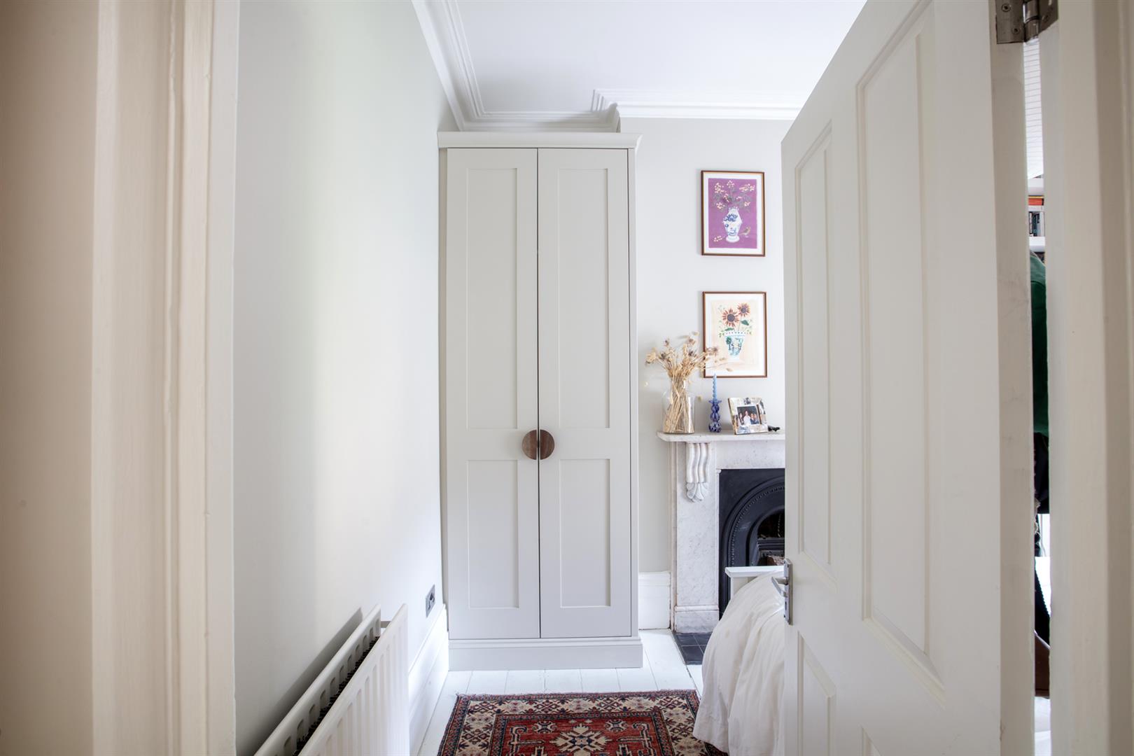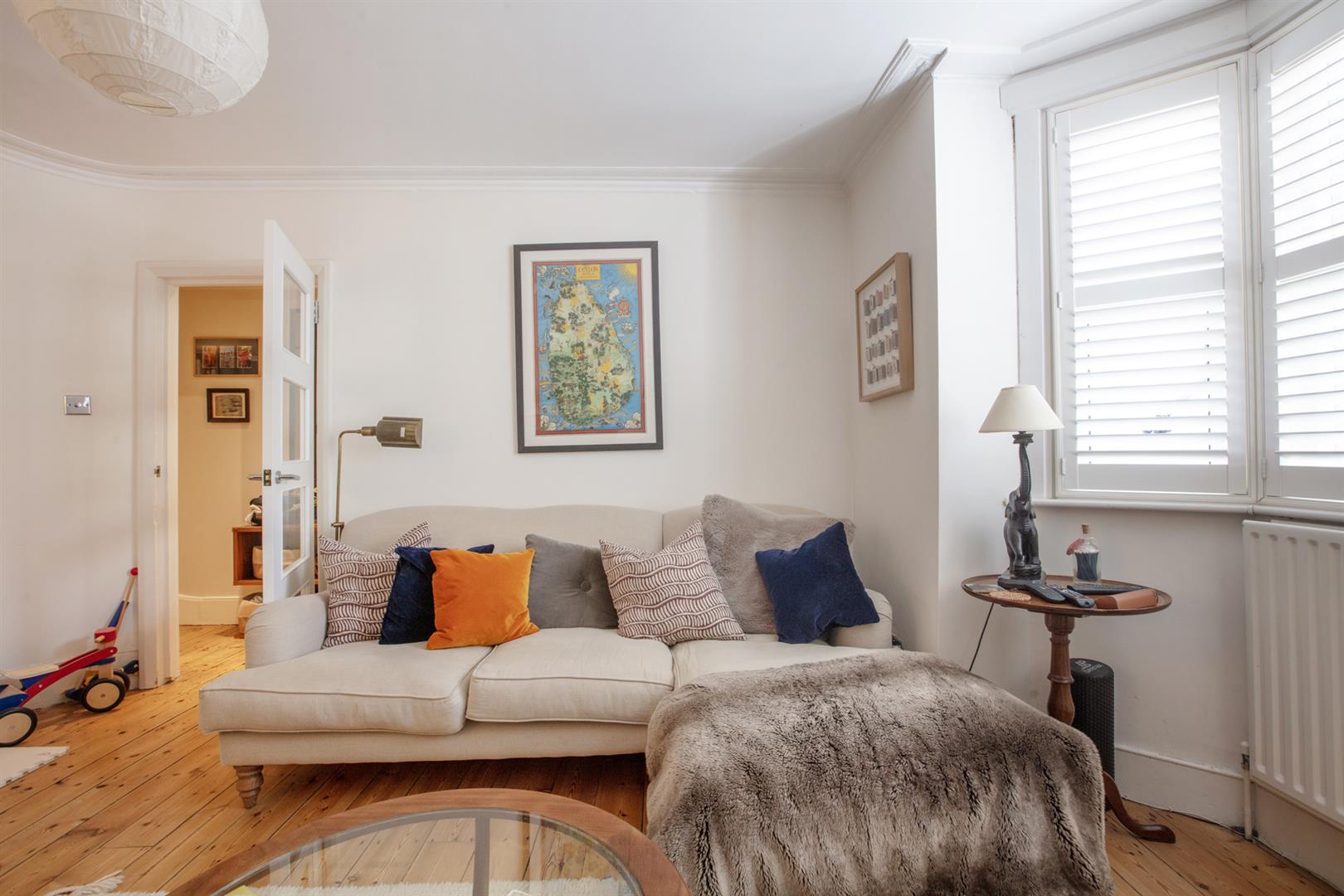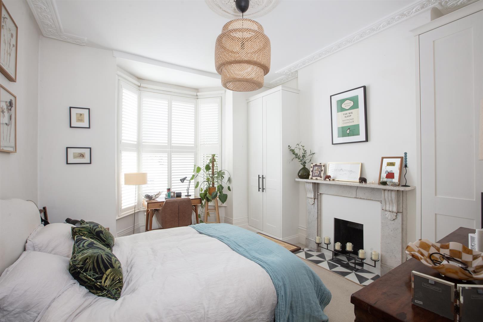 To the rear of the hall you find a handy laundry cupboard tucked under the stairs. There's a tiled recessed area beyond this - ripe for further storage and it sits opposite further garden access. The bathroom completes this level. Upward bound you find the first of your bedrooms - a sweet room with pretty garden views. Painted floorboards and neutral décor make the most of the space. Bedroom two is a nicely sized double with more garden views and bespoke storage either side of a wide feature fireplace with ornate mantel. Last but certainly not least comes a wonderful front-facing master bedroom with high ceilings, wide bay windows and some glorious original cornicing.