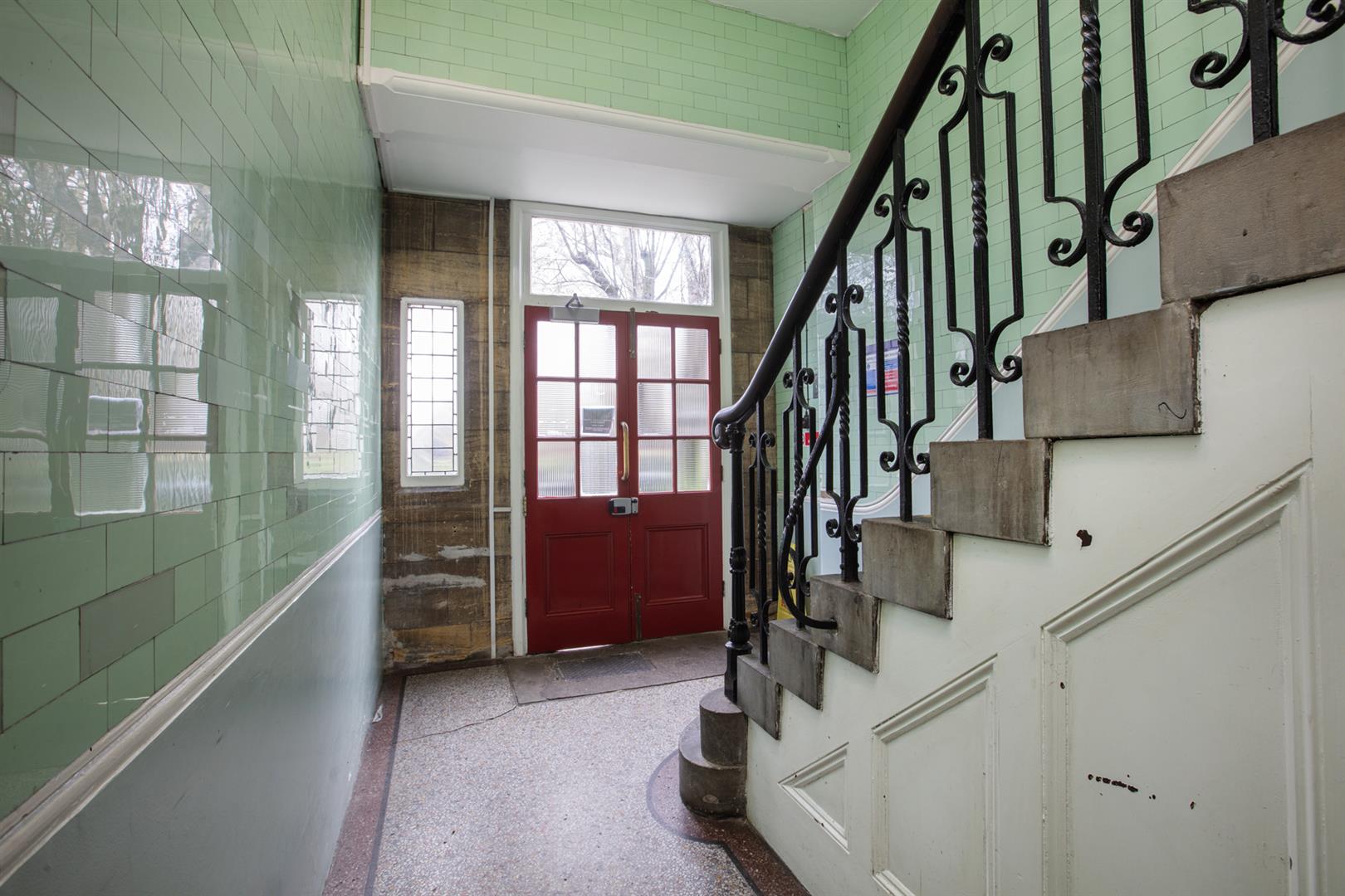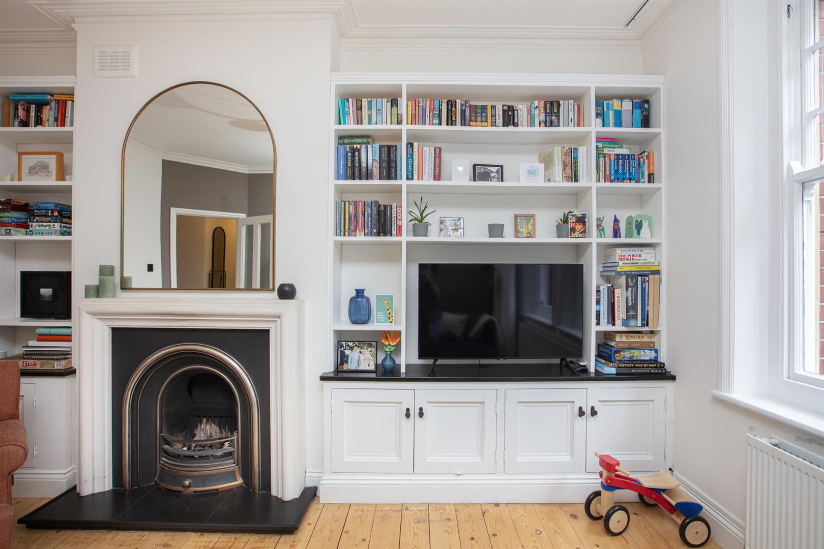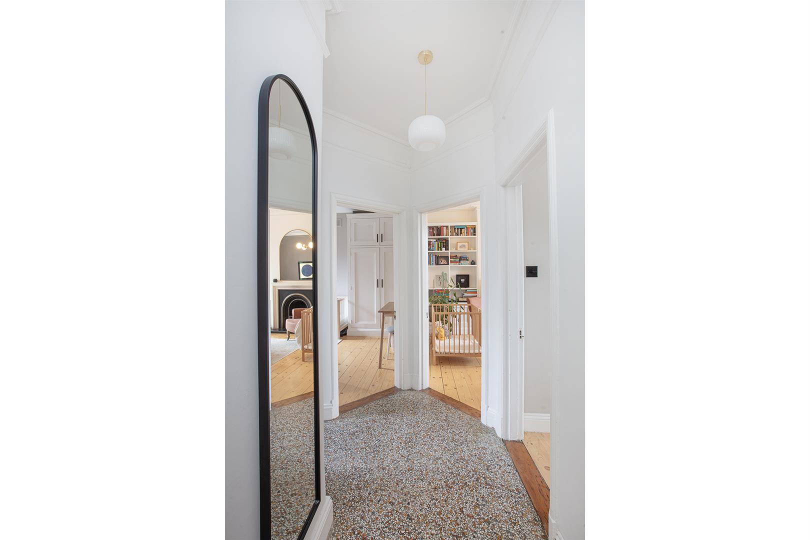 The flat is accessed at the beginning of the development, next to abundant period loveliness. A shared entrance leads inward to a handsome communal hall which boasts an elaborate original staircase and dishy period tiling. The L-shaped inner hall introduces itself with that show-stopping Terrazzo flooring and tasteful neutral styling. You find the reception fronting the development with park views through two lovely sash windows. There are bespoke wooden media units either side of the working fireplace. A splash of Farrow and Ball's 'Charleston Grey' on the walls along with original cornicing finishes the space perfectly.