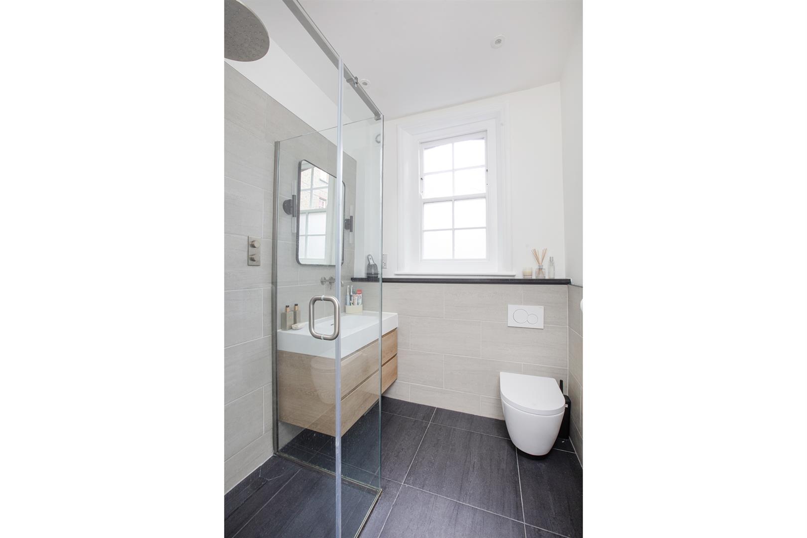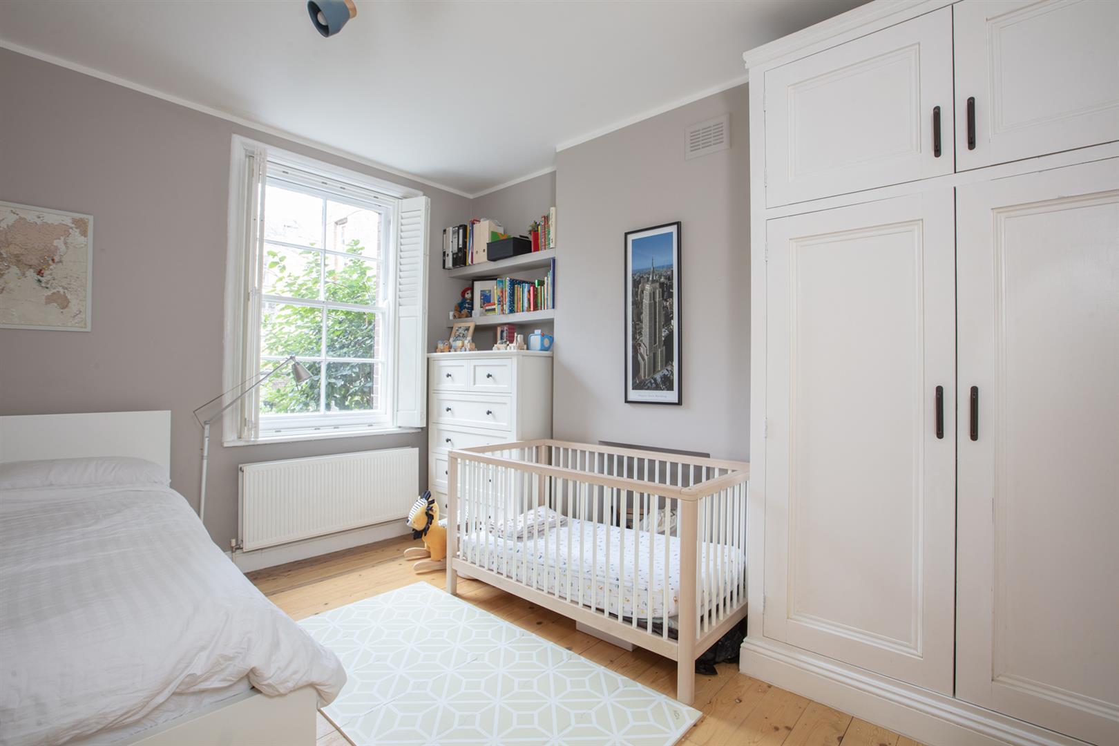 The first bedroom also faces the park through two more sash windows - each with louvered blinds. Wide fitted wardrobes sits seamlessly into the alcove. Bedroom two faces rear over the communal green space and has more lush storage. The semi-tiled shower room sits off the hall and has a large walk-in shower, wall-hung loo and modern trough-style wash hand basin with storage. The dining room is delightful with wonderfully tonal 'Cardroom Green' on two walls. There's a super-deep recessed storage unit and an integrated desk space - perfect for the work-from-home days. Adjoining this to the rear is a long and well stocked kitchen with more terrific Terrazzo flooring. Granite counters sit over modern cabinets and the appliances include a five ring gas range and double oven. An exposed brick wall has been gifted some more 'Cardroom Green' and you can access the communal garden from here.