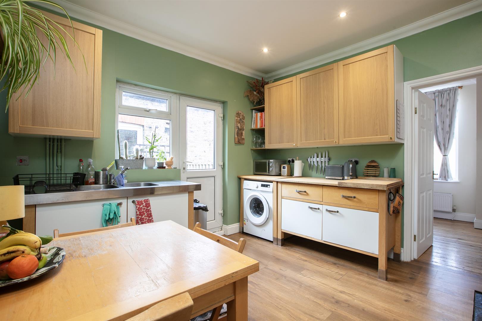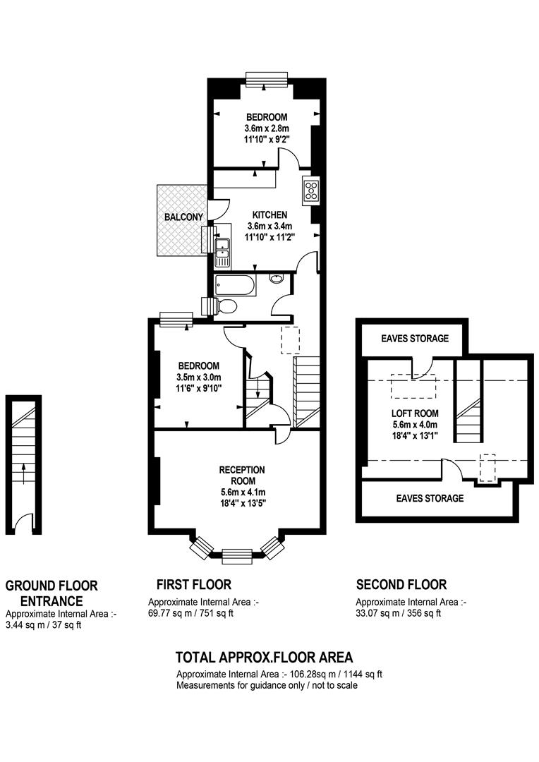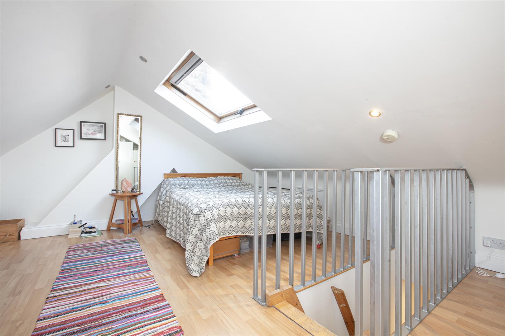 A private entrance leads off the street where original wall tiles and an original door with stained glass greet you warmly. The first floor landing is bright and airy with a fab vaulted ceiling and skylight. At the property's front is a large reception with bay window and oodles of lounging and entertaining space. It sprawls generously across the width of the building. Further along the hall is bedroom one, a neat rear-facing double. Next to this, through a separate door, is access to that bright, dual aspect loft room. Next along the hall is the semi-tiled bathroom which has a modern white suite and shower over the bath. The kitchen/diner is a great size with ample counter and cabinet space and room for a family dining table. A doorway leads off to the balcony which will host your summer vino sessions. To the rear of the kitchen is the second bedroom, good as either a bedroom or a large office - you choose!