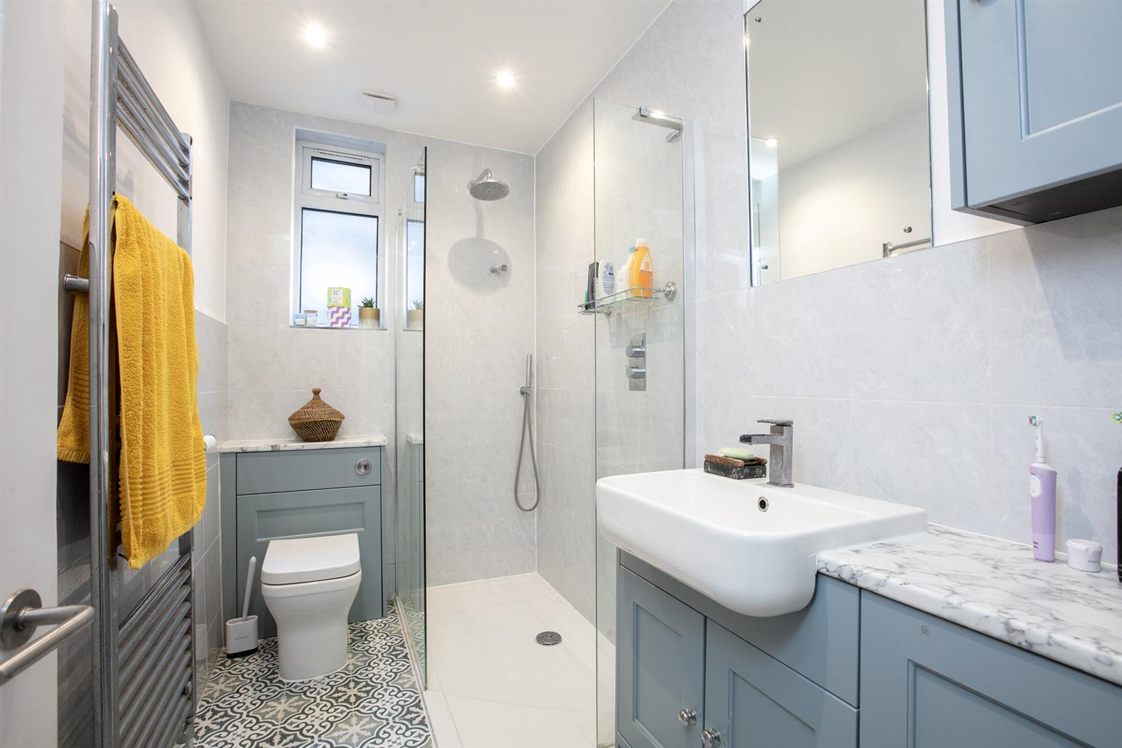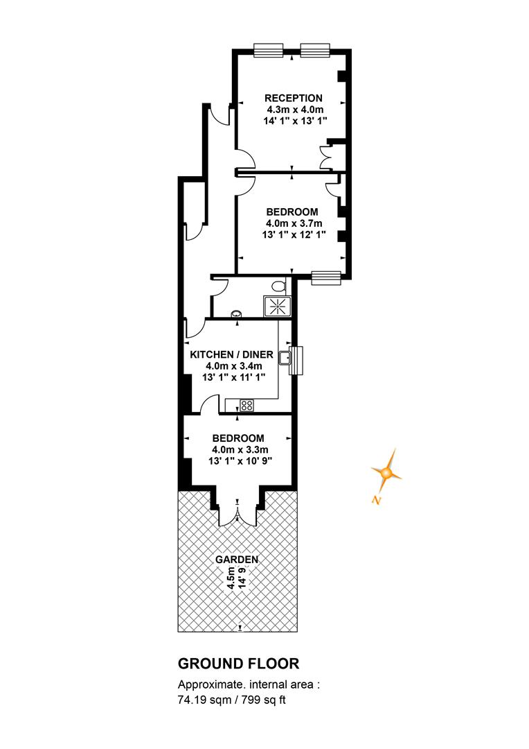 A private entrance with original tiling invites you inward. A large reception fronts the street with twin sets of sash windows and fitted storage. There's plenty of space for lounging and dining. Bedroom one comes next along the hall. It's a fine double with peaceful rear aspect view and more fitted storage. There's yet more storage to be found further along the hall. This sits next to the chic and contemporary shower room which boasts a crisp white suite and heated towel rail. The kitchen/diner is also a great size with plenty of cooking and dining space. An original tiled feature fireplace adds to the charm. Beyond this is your second double bedroom which benefits from French doors that open to your peaceful, private patio garden.