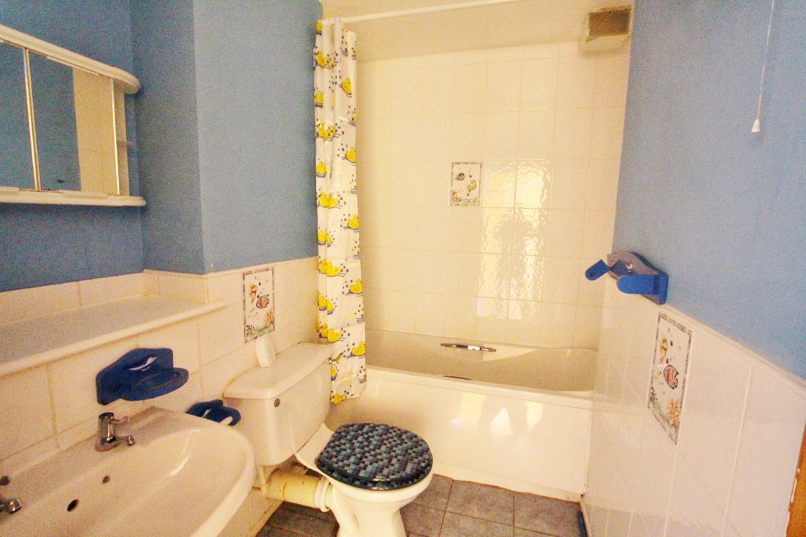 Panel enclosed bath, hand wash basin, low level flush WC, Tiled flooring,