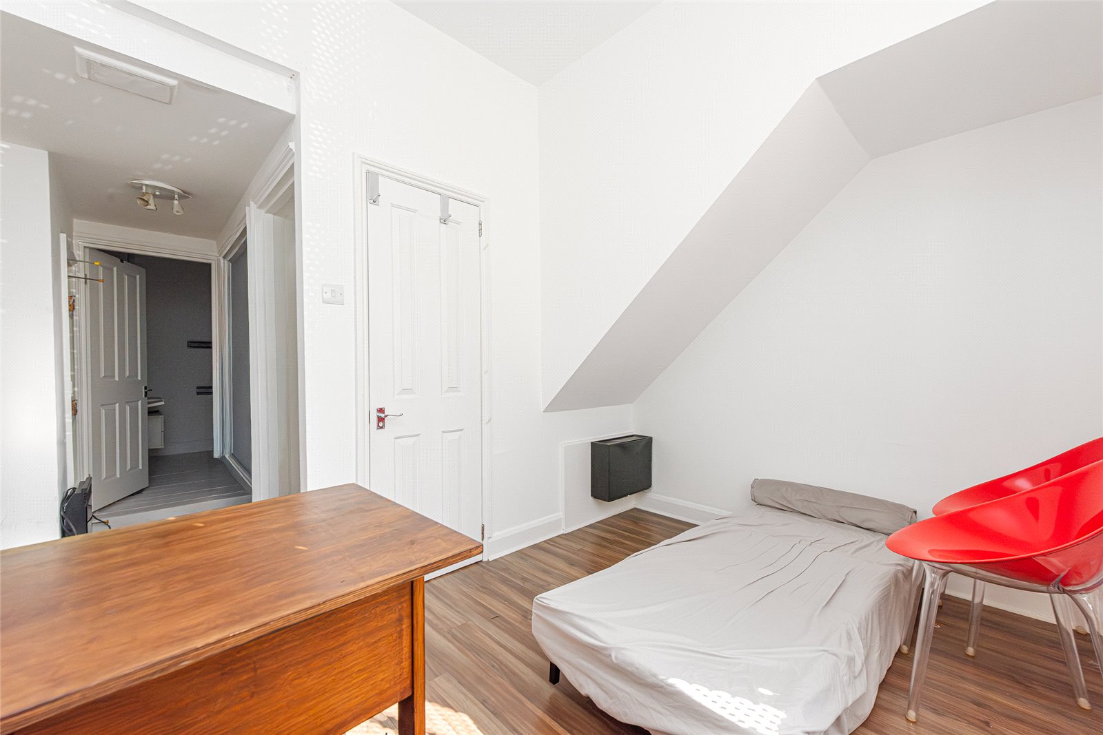 Upon entering the property, the hallway leads to a generous double bedroom positioned at the rear, enjoying a peaceful outlook away from the street. The ground floor also features a fully fitted bathroom suite and a versatile study or home office to the front, which could also serve as a guest room or occasional second bedroom—ideal for modern flexible living.