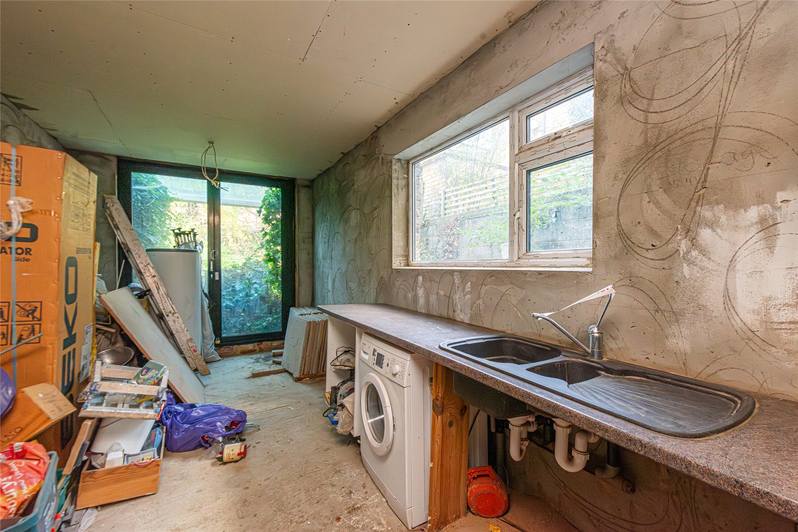 Upon entering, the ground floor features a spacious open-plan reception and dining area, filled with natural light and offering a versatile layout. To the rear, a partially finished kitchen provides direct access to a private rear garden extending approximately 29 ft, offering plenty of outdoor space and excellent potential for landscaping or entertaining.