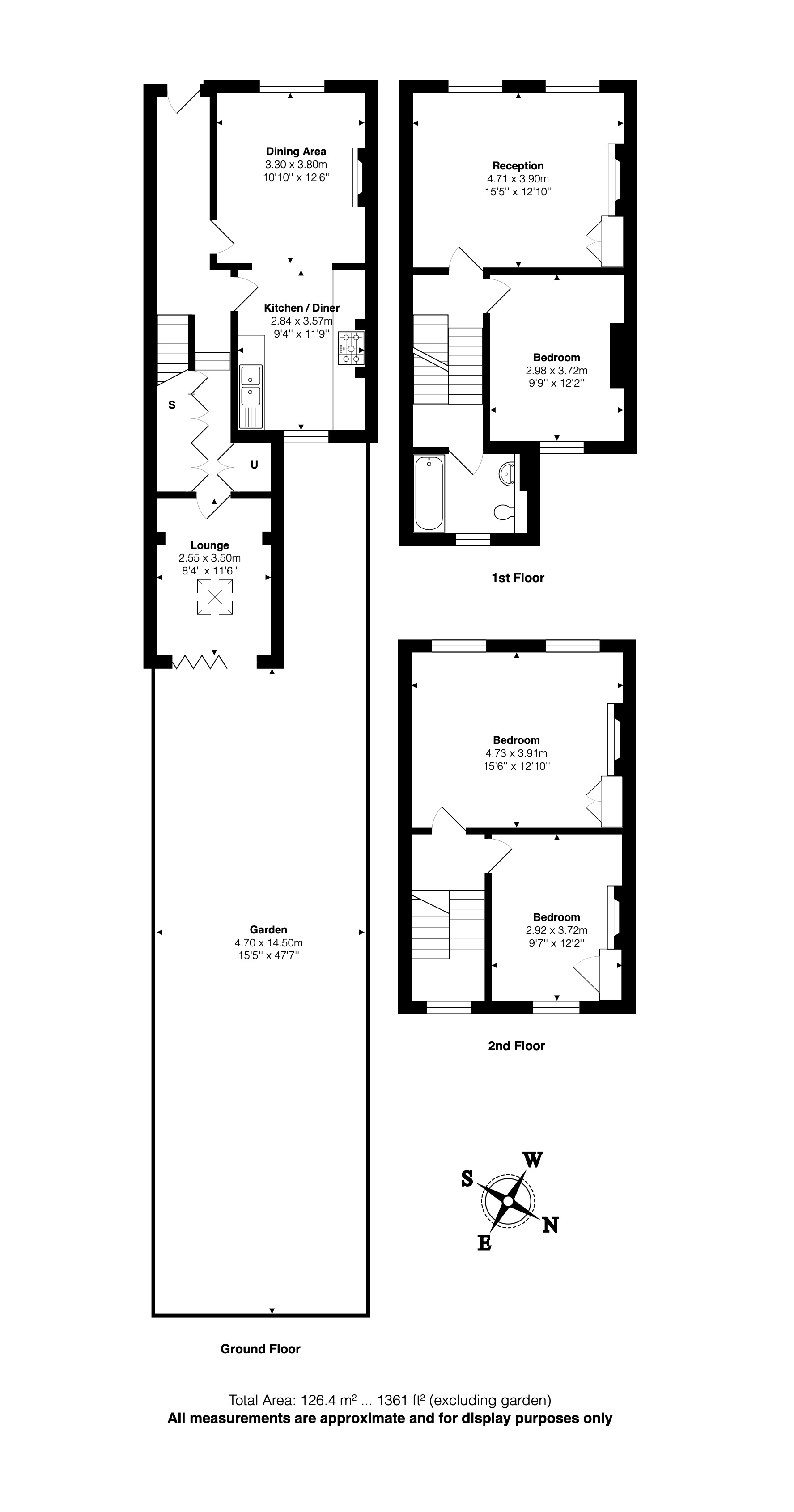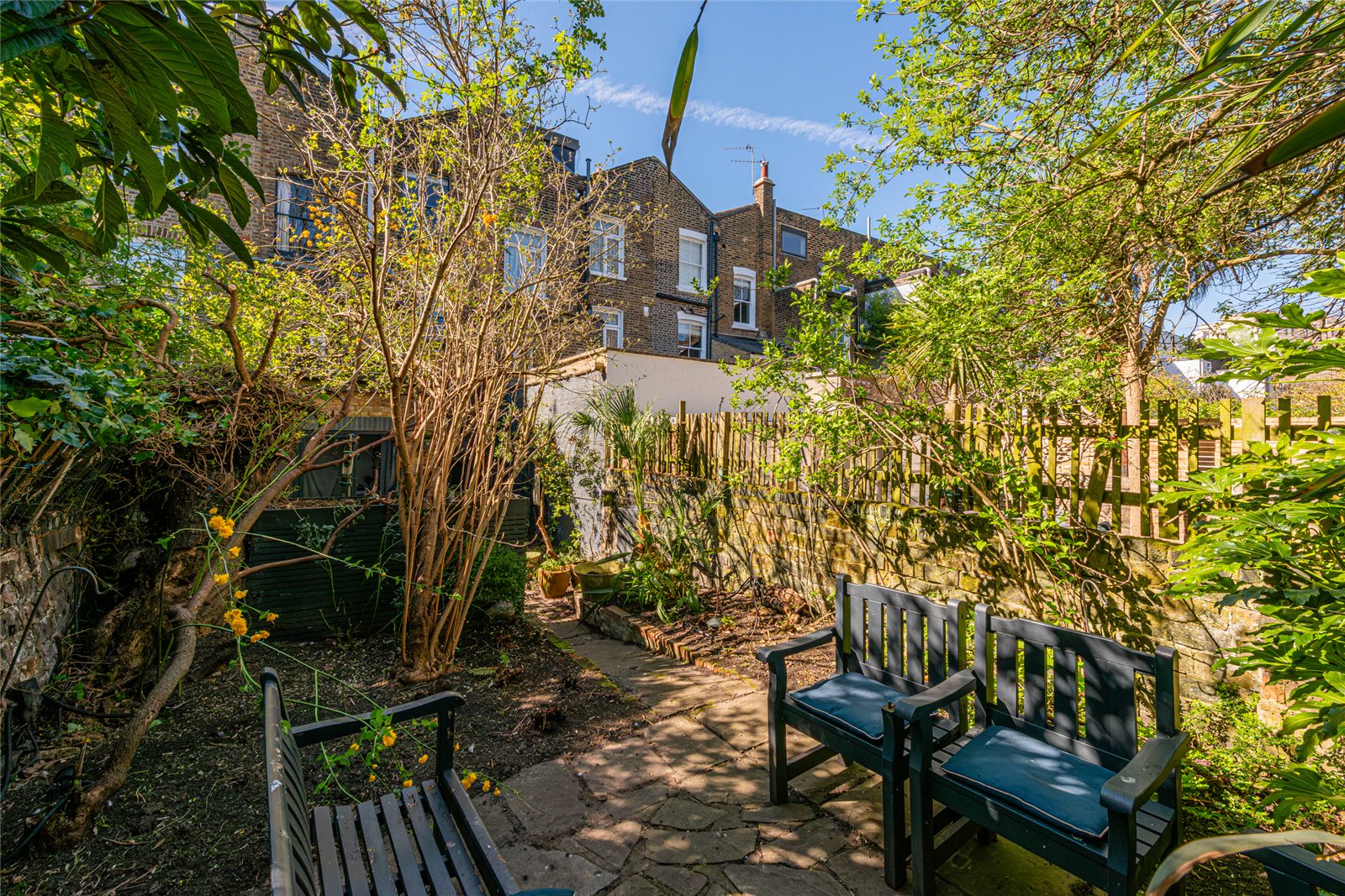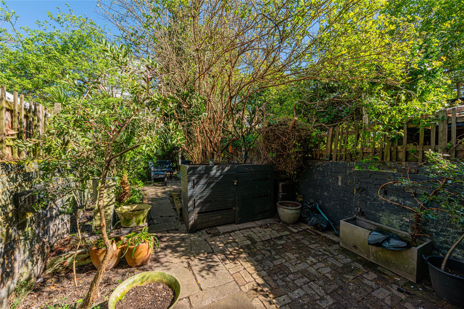 The garden extends to approximately 47 ft, offering a good sense of depth and privacy, with a combination of patio and established planting, ideal for outdoor dining and relaxed family living.