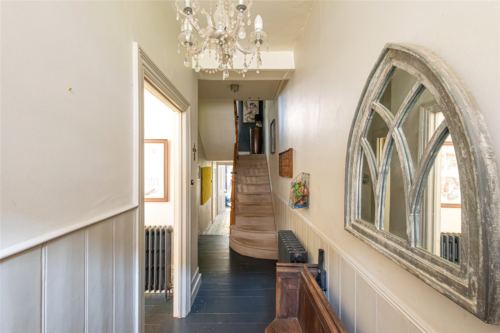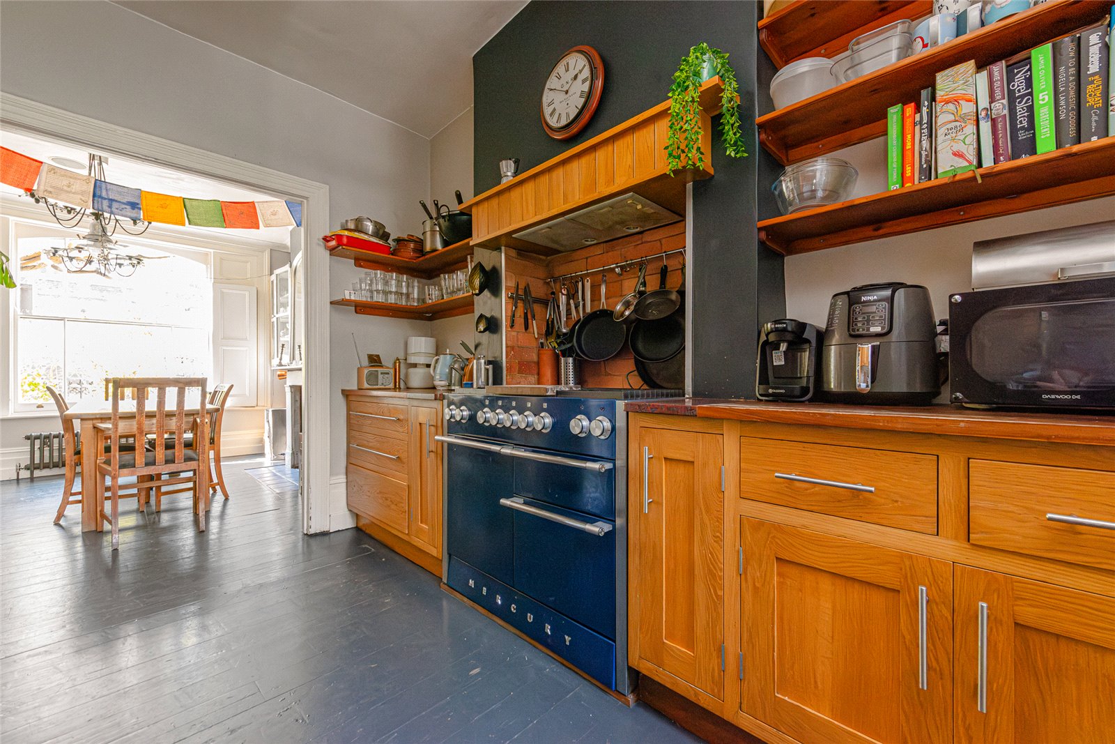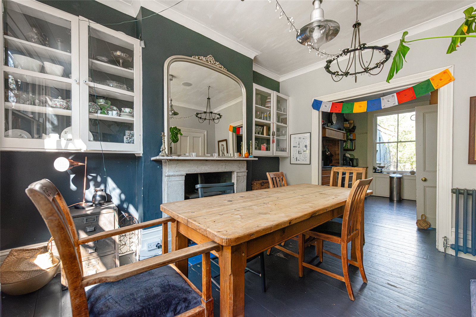 The ground floor is particularly well arranged, offering a natural and intuitive flow. A bright entrance hall sets the tone on arrival, with panelling detail and exposed floorboards underfoot, leading through to a beautifully presented dining room at the front of the house. This is a standout space, centred around a stunning decorative fireplace, with a gas fire set within the room adding both warmth and atmosphere, ideal for everyday living and entertaining.