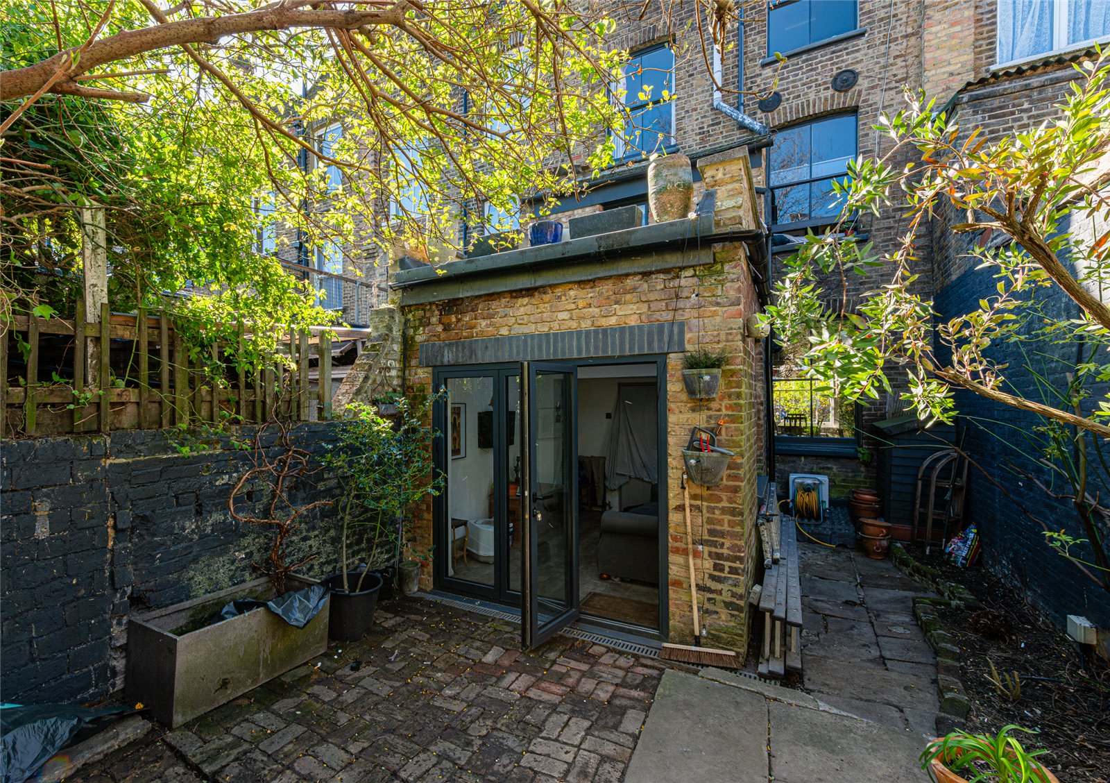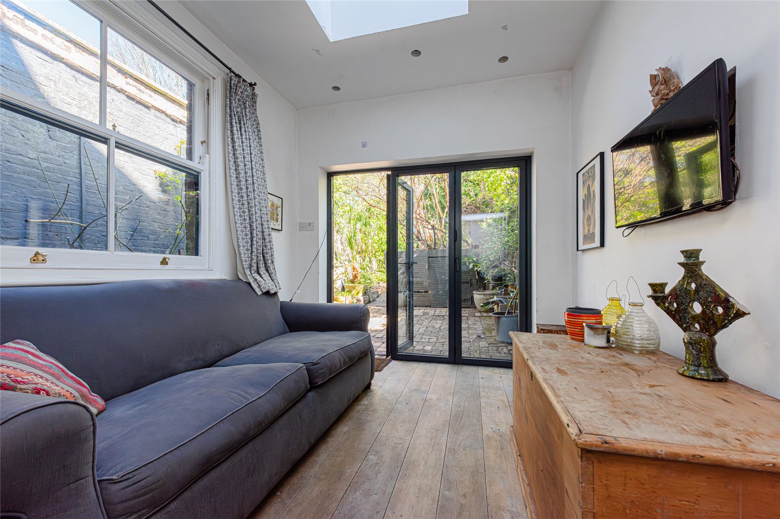 To the rear, a further living space provides a wonderful contrast, lighter in feel and designed around the garden. A skylight draws in excellent natural light, while bi fold doors open directly onto the outside space, creating a seamless indoor-outdoor connection.