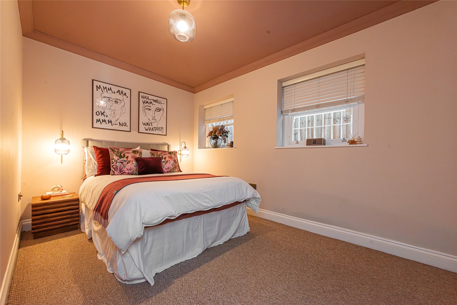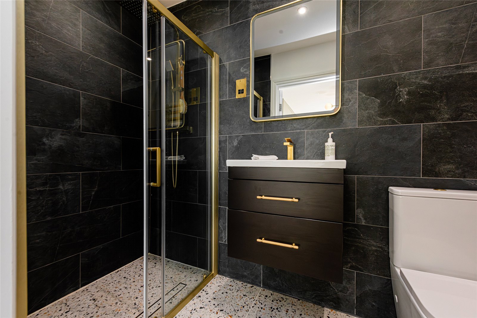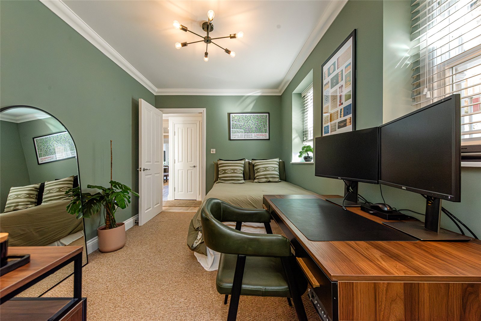 The three-bedroom, three-bathroom layout offers excellent flexibility for family living, hosting guests or working from home. The second bedroom to the front benefits from its own en suite bathroom, complete with a full shower and window, while the third bedroom also benefits from fitted wardrobes. The main bathroom is finished in a clean, timeless style, with a full bath and wall-mounted shower.
