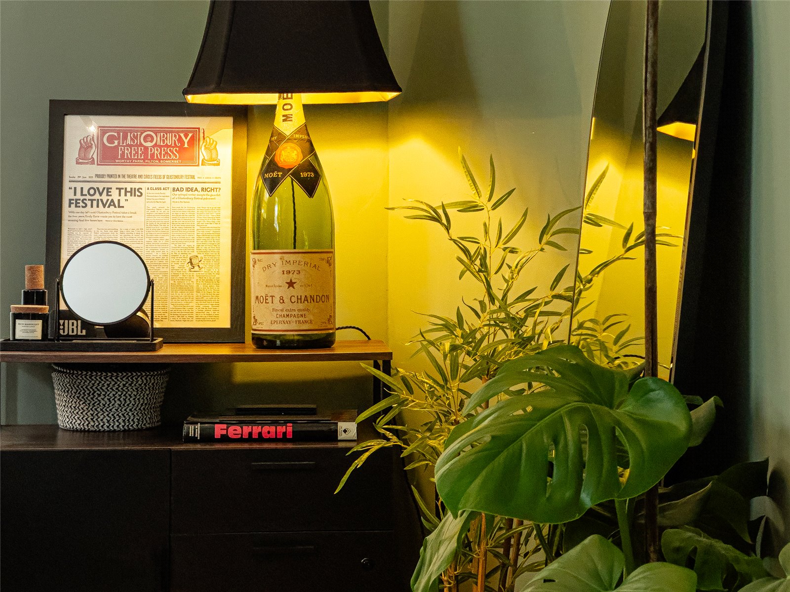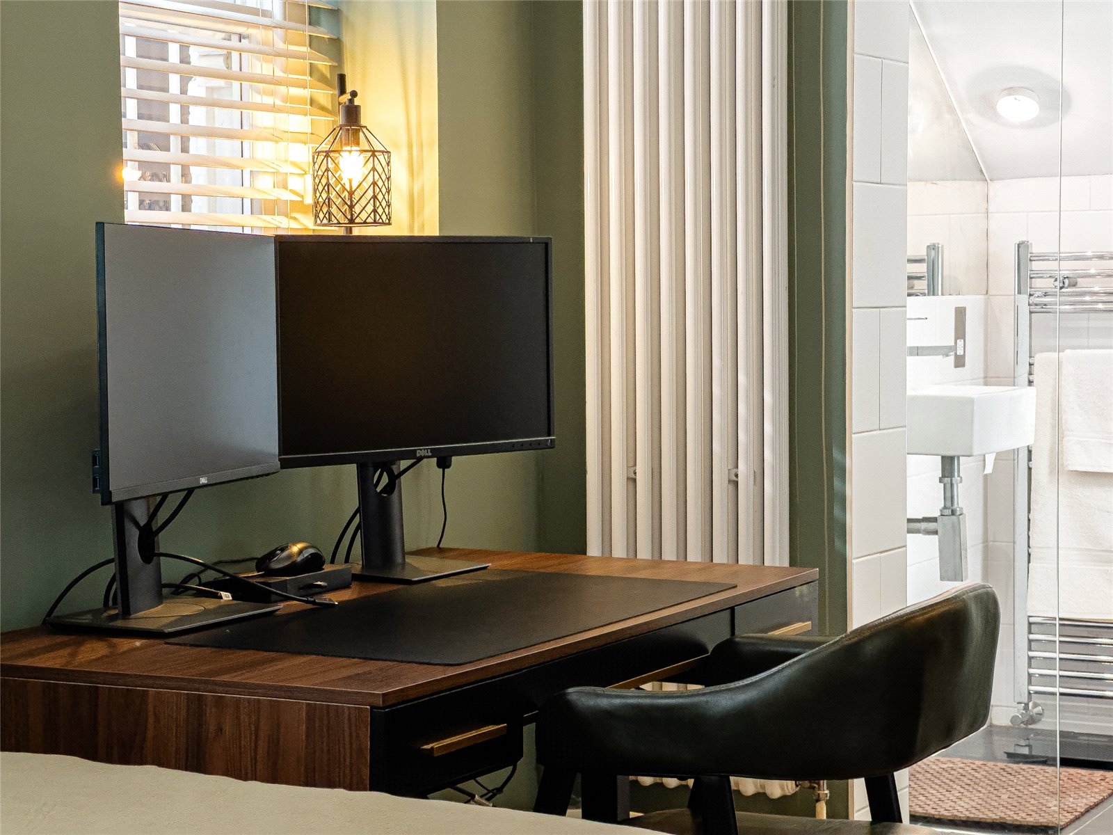 To the front, the principal bedroom is a generous, light-filled room, centred around a wide bay window and complemented by bespoke fitted wardrobes. The en suite bathroom has been recently installed in a sleek, contemporary style, featuring dark tiling, brass fittings and a walk-in shower.