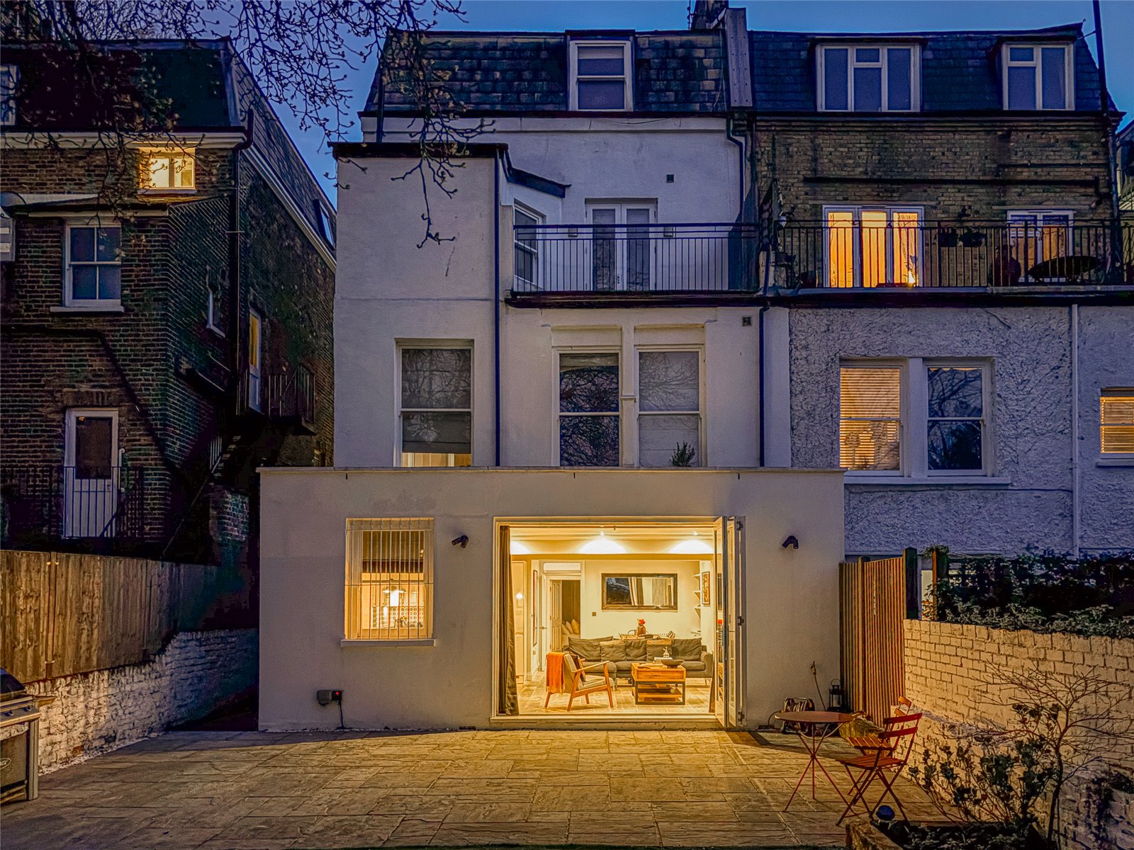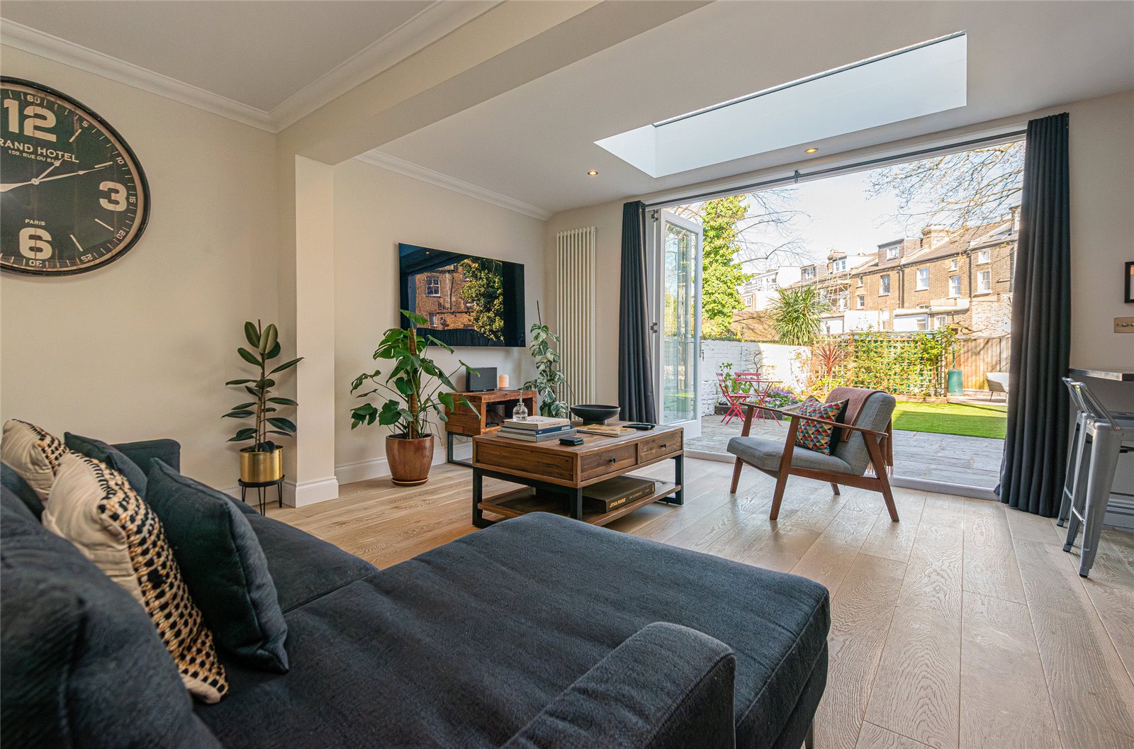 The plan unfolds naturally towards the rear, where a superb open-plan kitchen, dining and reception space spans over 27 ft, creating a bright and highly functional heart of the home. A large skylight draws daylight deep into the room, while bi-fold doors open directly onto the garden, creating a seamless connection between inside and out.