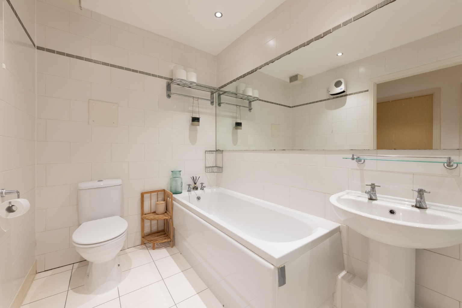 The large bathroom includes a four-piece suite comprising of WC, pedestal basin, bathtub and large separate shower cubicle with glazed screen.