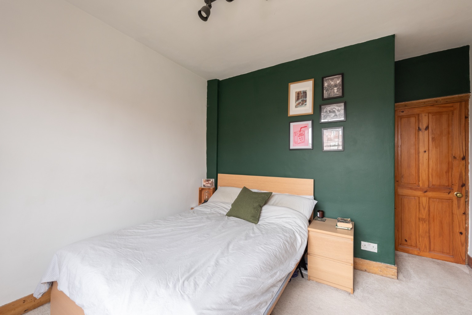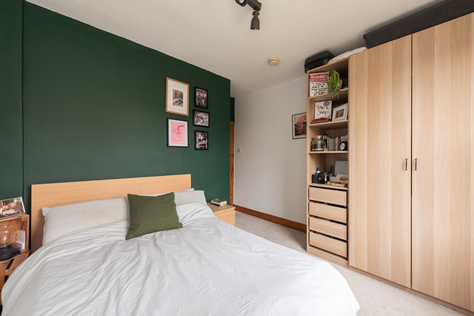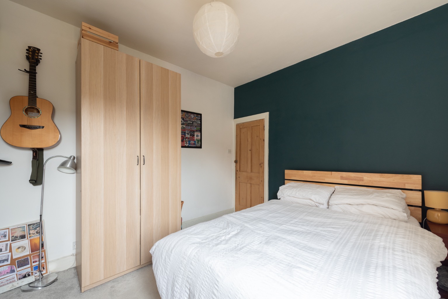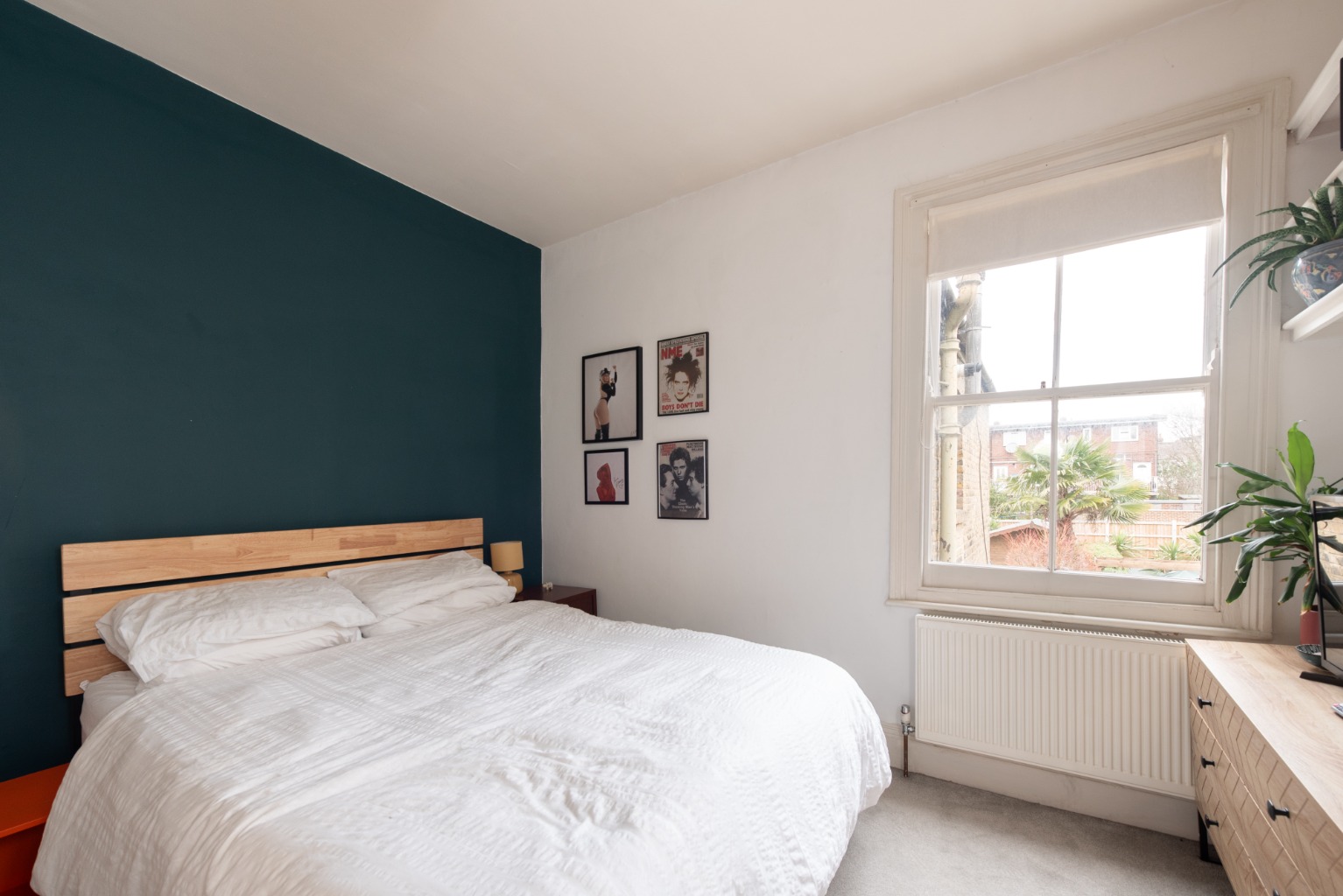 The next room along is the stylish kitchen which was fully re-fitted in 2021. The sage green shaker-style cabinets are complemented by solid timber work surfaces, bevelled tile backsplashes and geometric design floor tiles. There’s a gas hob with extractor above and integrated appliances which will remain for your use. At the end of the hallway is bedroom two – a double room with a radiator and large sash window, looking out to attractive gardens at the rear of the property. Back along the hallway and straight ahead is the large South-East facing reception room, which occupies the full width of the property and receives generous natural light from its feature bay window, plus an additional smaller window. There’s room for a large seating area and separate dining space, and a feature wall in dark teal provides an attractive focal point for the room. The final room in the property is bedroom one, which is a good-sized double room looking out towards the rear of the property, and benefits from a large radiator and alcoves for built-in storage.