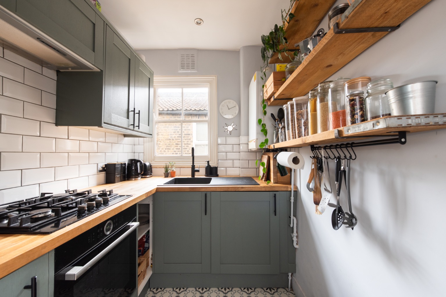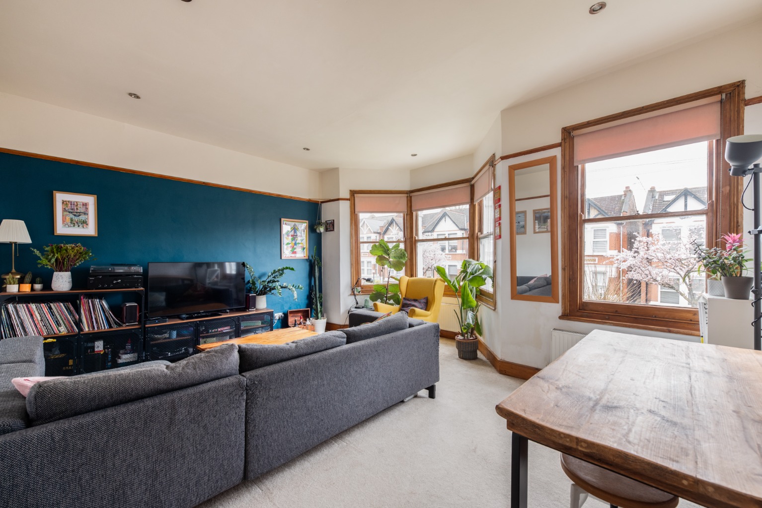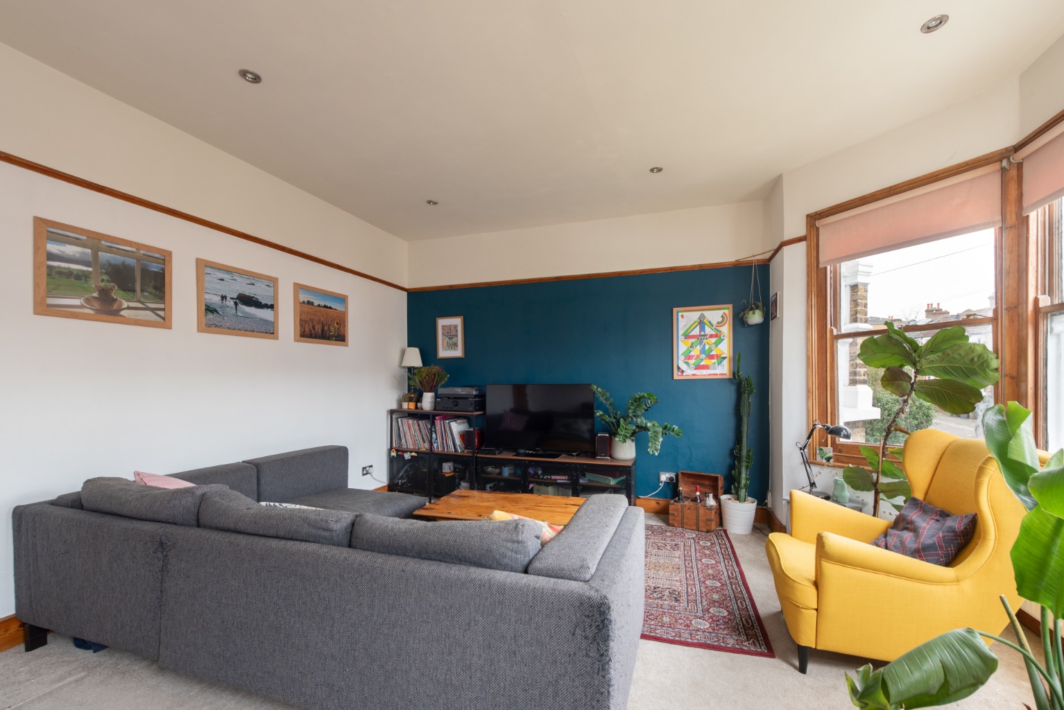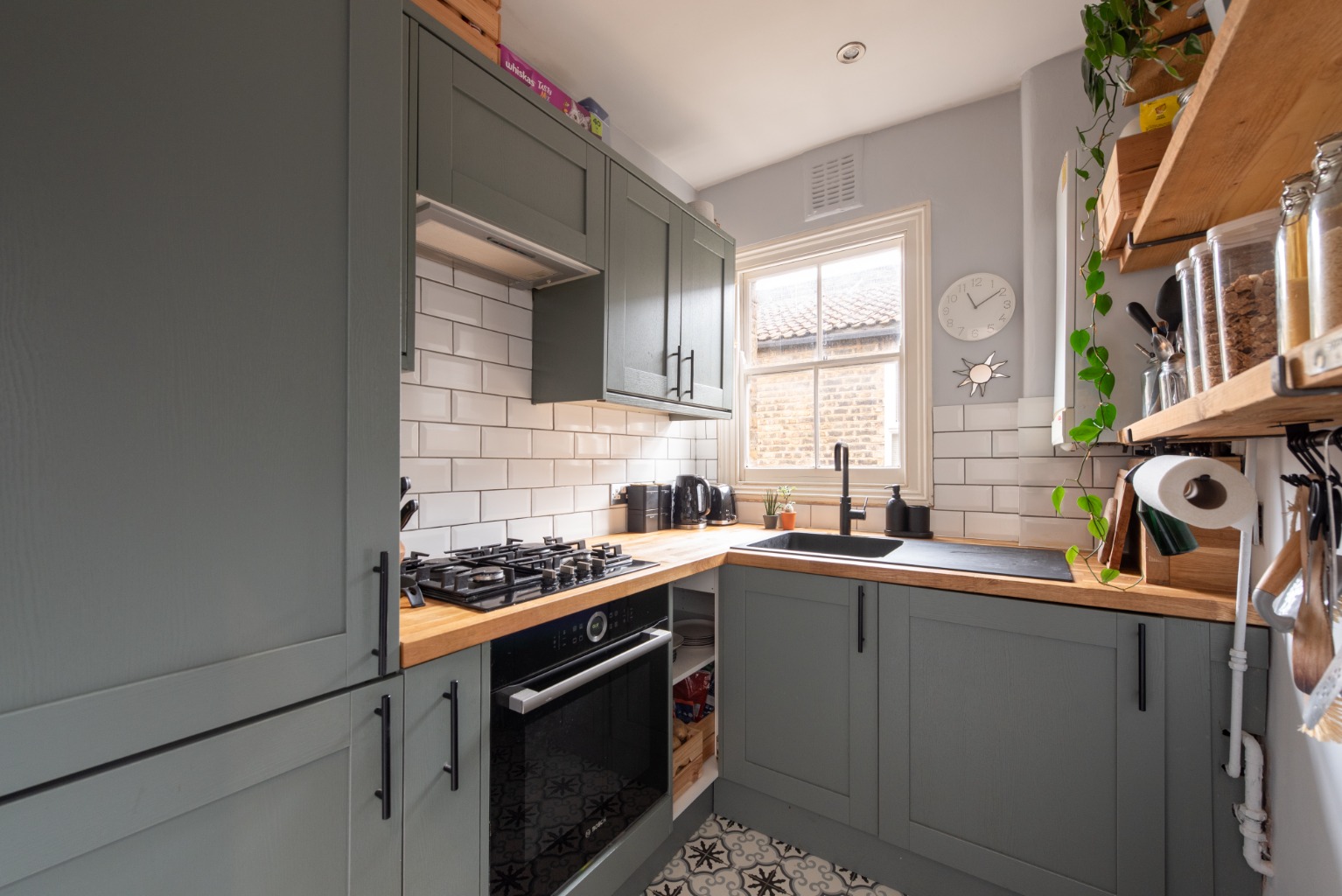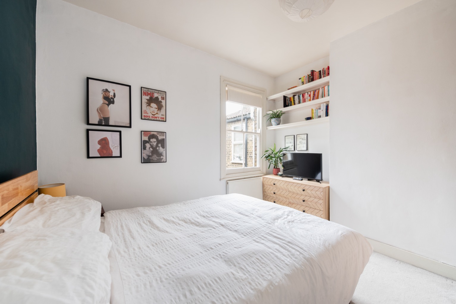 The next room along is the stylish kitchen which was fully re-fitted in 2021. The sage green shaker-style cabinets are complemented by solid timber work surfaces, bevelled tile backsplashes and geometric design floor tiles. There’s a gas hob with extractor above and integrated appliances which will remain for your use. At the end of the hallway is bedroom two – a double room with a radiator and large sash window, looking out to attractive gardens at the rear of the property. Back along the hallway and straight ahead is the large South-East facing reception room, which occupies the full width of the property and receives generous natural light from its feature bay window, plus an additional smaller window. There’s room for a large seating area and separate dining space, and a feature wall in dark teal provides an attractive focal point for the room. The final room in the property is bedroom one, which is a good-sized double room looking out towards the rear of the property, and benefits from a large radiator and alcoves for built-in storage.