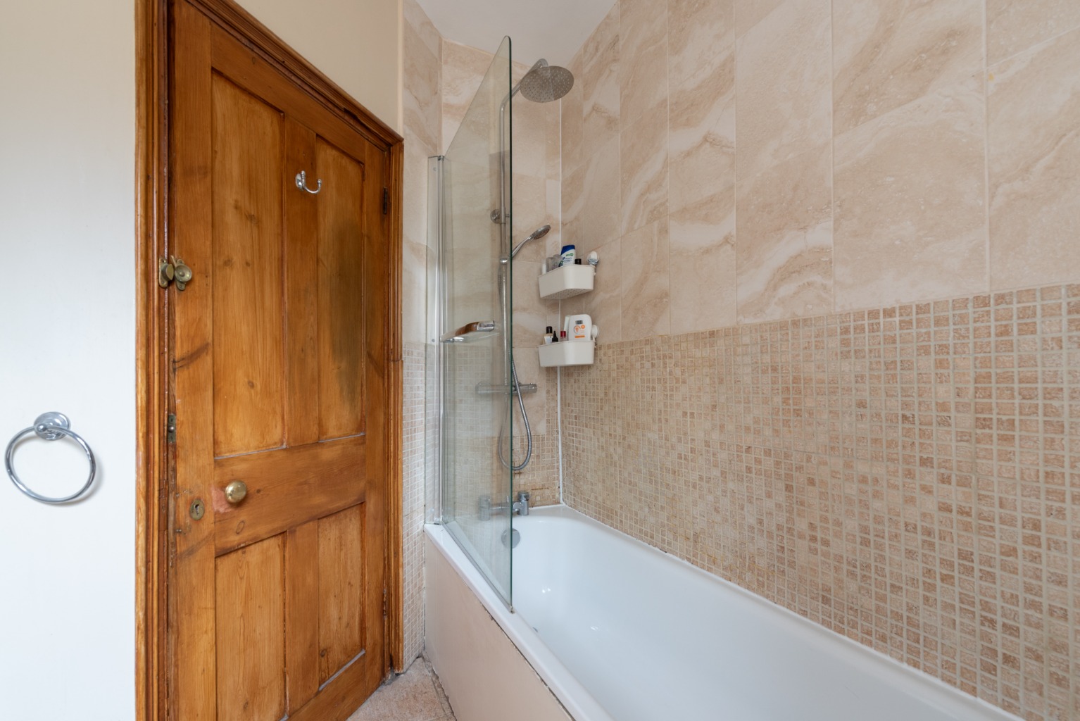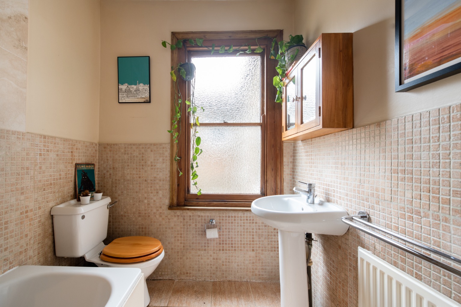 Occupying the entire first floor of a large Victorian terrace villa which retains many architectural details, the flat sits in a quiet street with residents-only parking. The front porch leads to a shared hallway with access up to the property and its own private hallway which offers independent access to each room. The staircase and hallway features a dado rail with white above and a warm dark teal below. The hallway also provides access to the attic storage space which, subject to the necessary permissions, could offer future potential for expansion of the accommodation. The first room to the right is the family bathroom with large frosted-glass window, mosaic tile splash backs and stone-effect floor tiles. There’s a three piece bathroom suite comprising of a W.C., a pedestal washbasin and a bathtub with shower above and glazed screen.