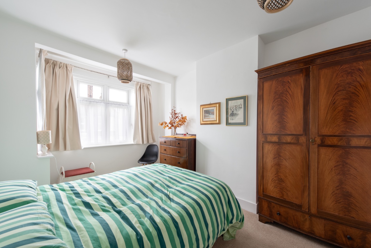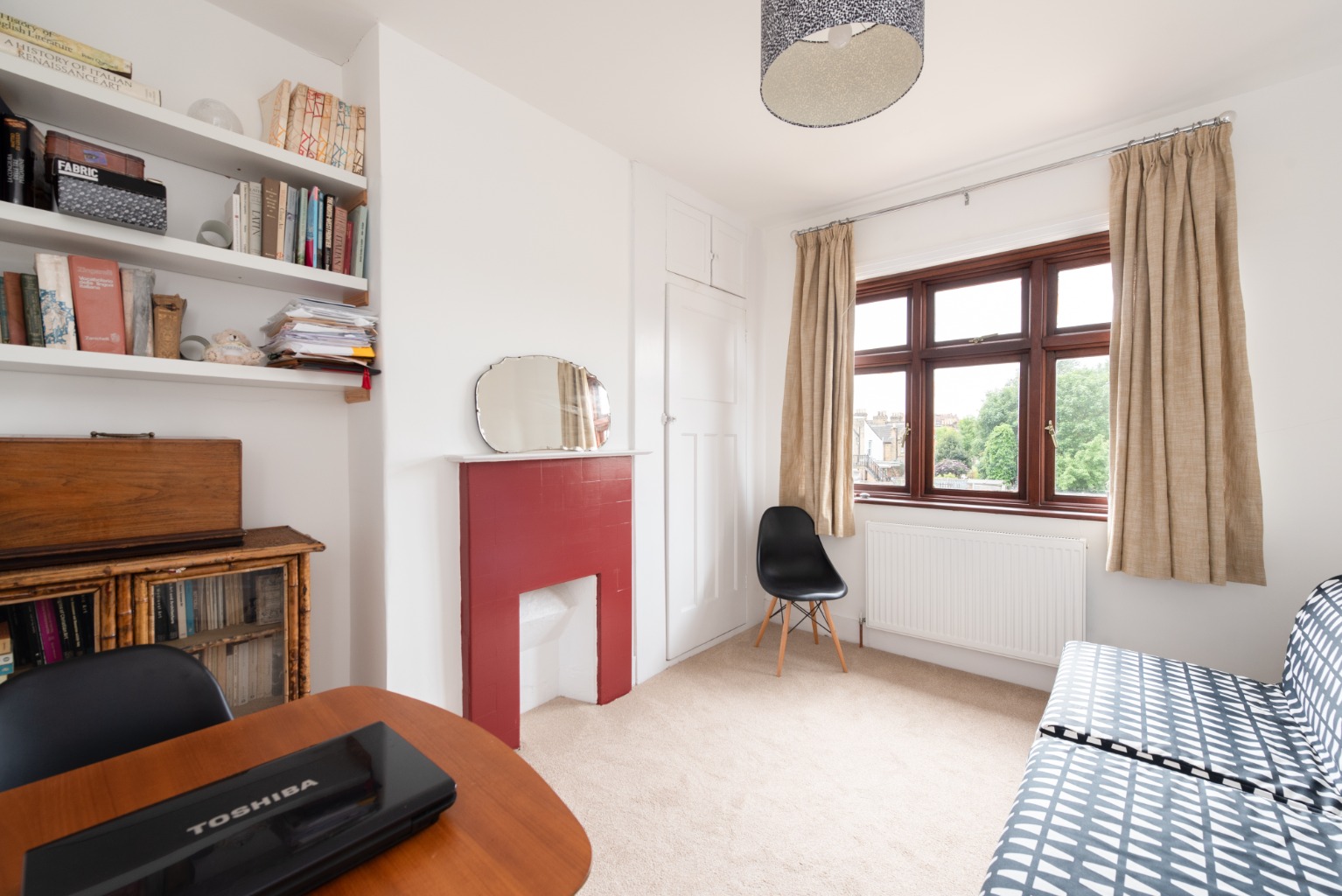 Now up to the first floor and into the family bathroom, with WC, pedestal basin and bathtub with shower. There´s natural light from a frosted glass window and extensive tiling with a border feature.Bedroom three is a single room lying at the front of the property. Bedroom two is a good-sized double overlooking the rear garden, with built-in storage and an original fireplace. The main bedroom is a similarly sized double with the added benefit of a bay window looking out to the quiet street below. The bedrooms are all neutrally decorated with modern white walls and fawn carpet.